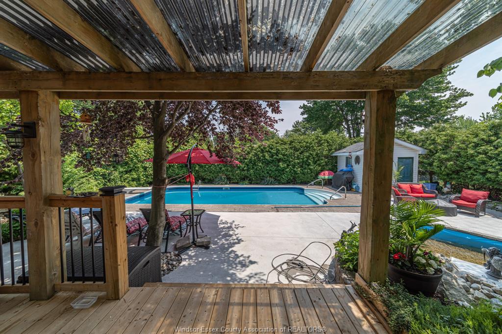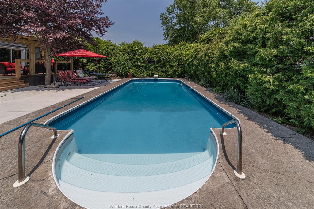 • Backyard oasis includes an inground pool and sun deck surrounded by greenery.