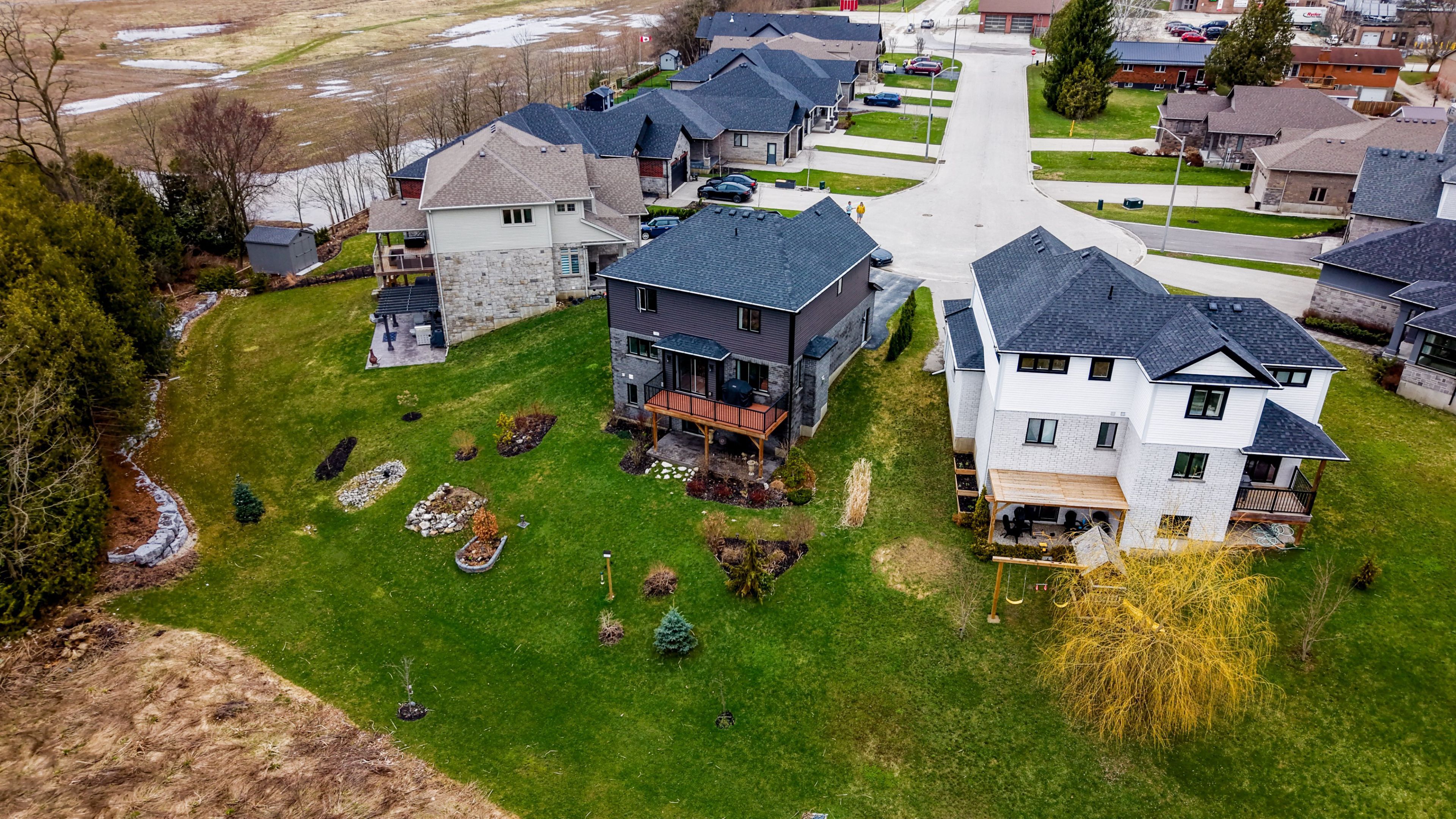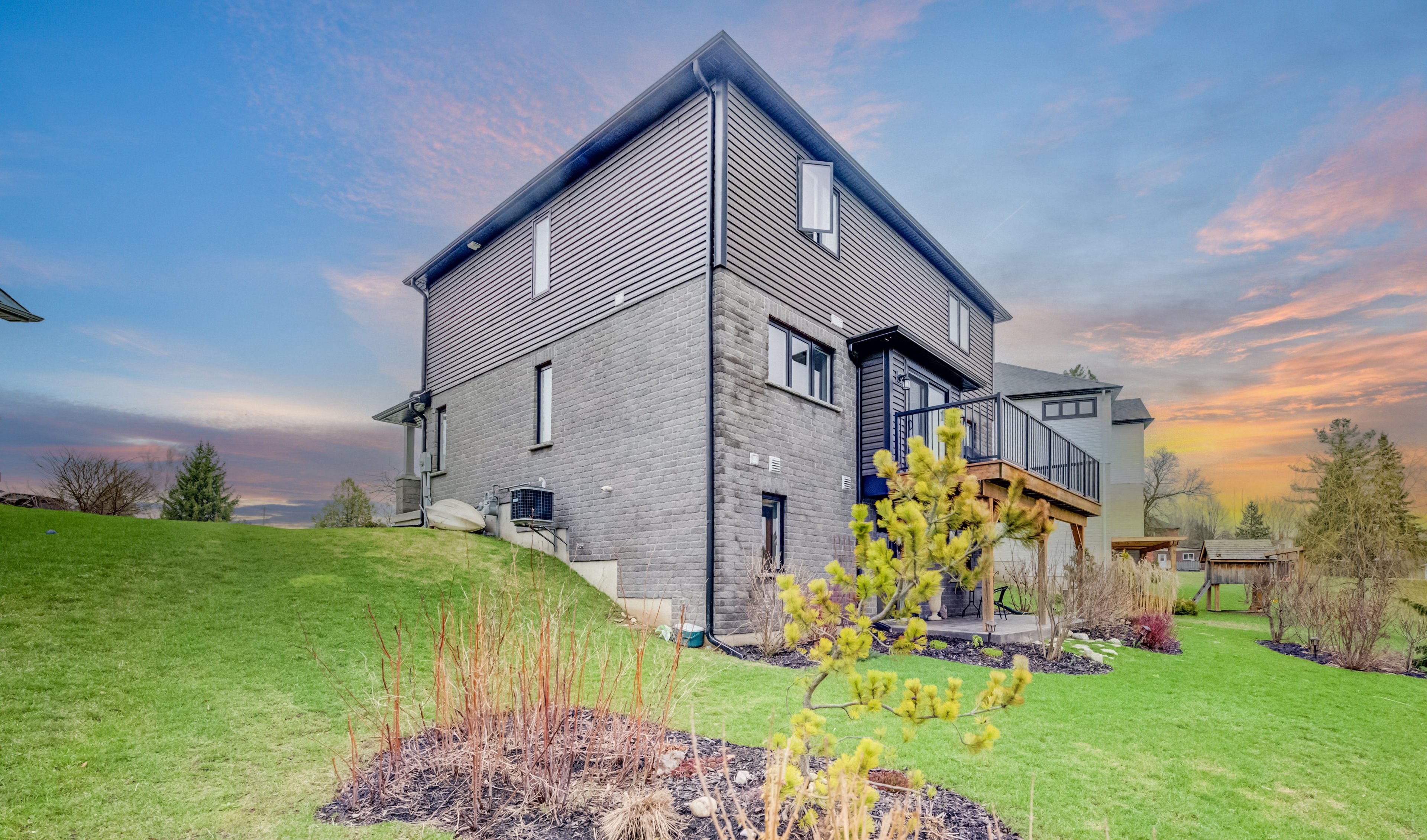 The perfect two-storey floor plan doesn't exist... Or does it? Welcome to this exquisitely built and meticulously maintained two-storey home, perfectly situated at the end of a quiet dead-end cul-de-sac. As you enter the neighbourhood, you'll immediately feel at home. Backing onto serene greenspace, this property offers both privacy and tranquility. Step inside to a functional foyer with built in hall tree and a soaring ceiling that sets the tone for the elegance found throughout. The main floor features a bright, open-concept layout designed for both comfort and entertaining. The dining room offers a walkout to the rear deck, while the living room is anchored by a cozy gas fireplace. The stylish kitchen is complete with quartz countertops, a classic subway tile backsplash, stainless steel appliances, and a peninsula-perfect for morning breakfasts or evening wine. Upstairs, convenience meets luxury with a second-floor laundry room located near the bedrooms. The spacious primary suite boasts a large walk-in closet and a beautifully appointed 4-piece ensuite featuring a tiled shower and double sinks. Two additional bedrooms and a modern 4-piece family bathroom complete this level. The finished basement adds valuable living space, including a versatile flex den which is ideal for a home office, gym, or play area. The inviting family room features a gas freestanding stove and sliding doors that lead to a covered patio with a stamped concrete finish. A convenient 2-piece bathroom completes the lower level. Outside, the expansive pie-shaped lot provides endless possibilities. Whether entertaining friends and family, creating a play space for children, or simply relaxing while enjoying the sights and sounds of nature, this yard can do it. This move-in-ready house is waiting for its next family to call it home.