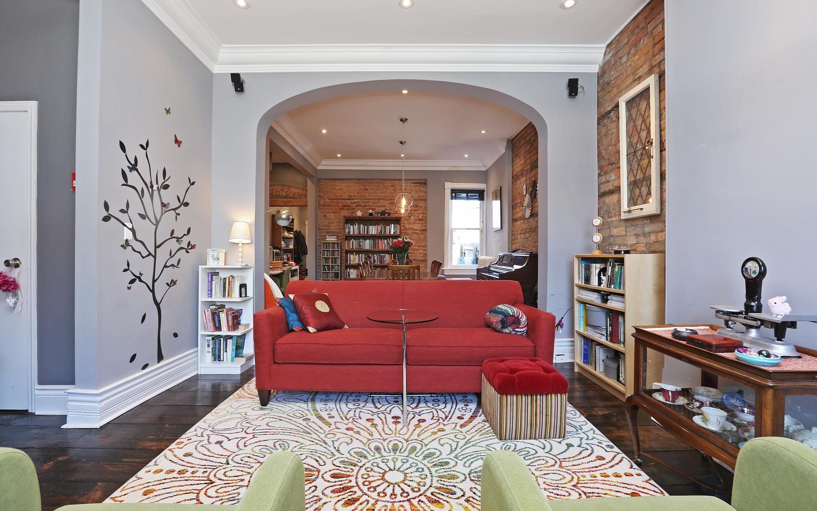 • Charming details like exposed brick and wide plank floors.