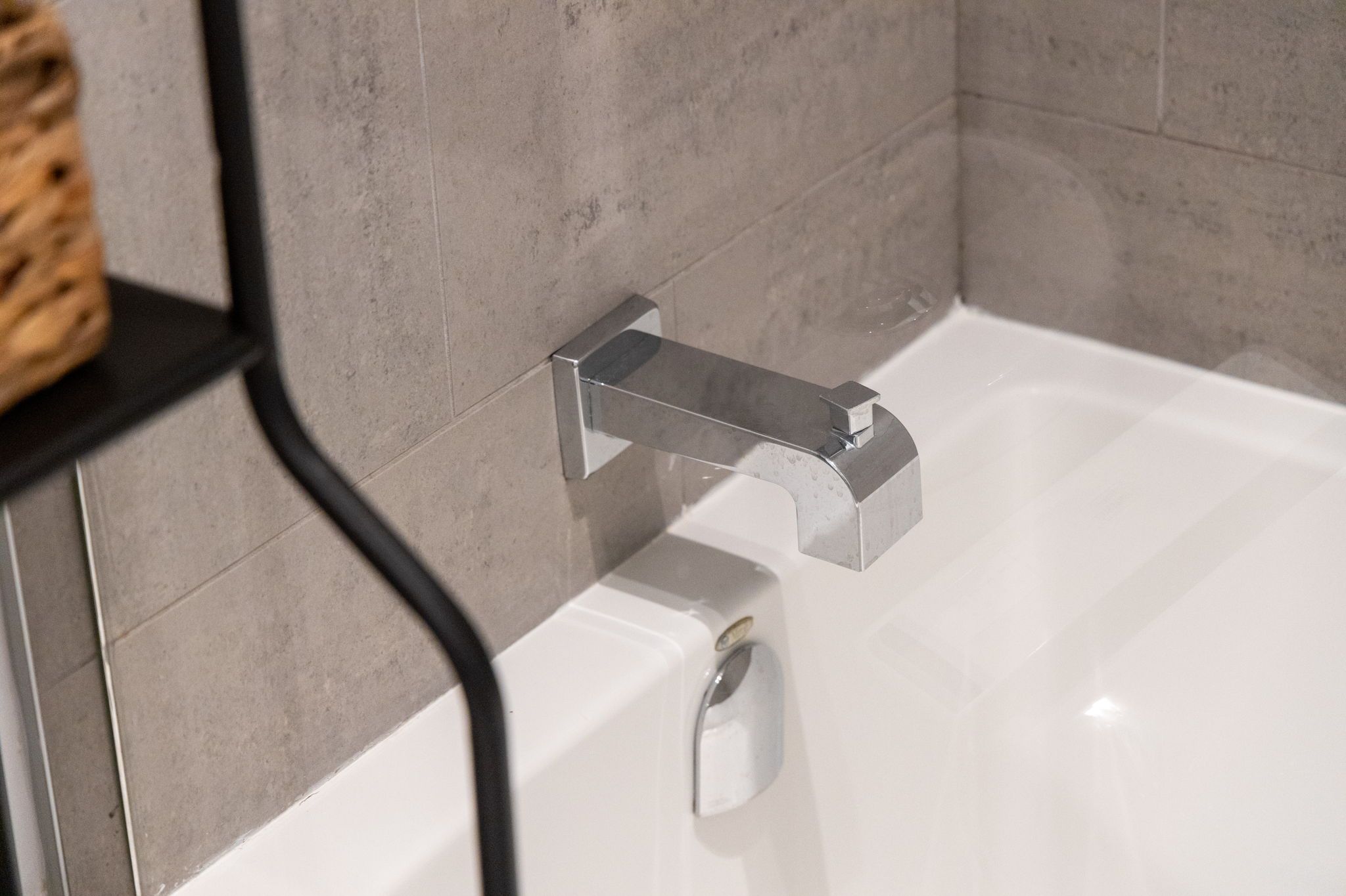 • Modern design with exposed concrete and floor-to-ceiling windows.