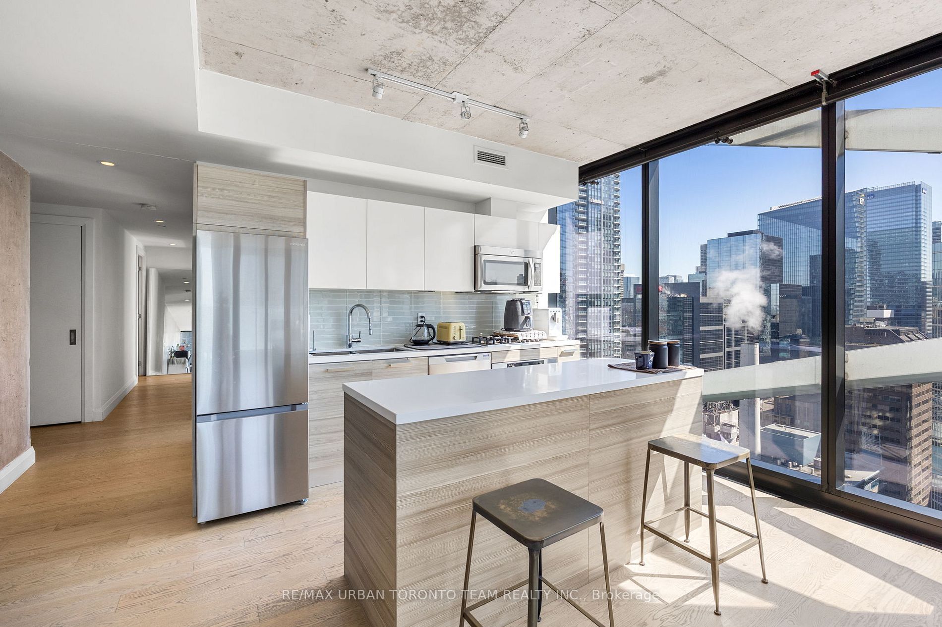Experience the pinnacle of urban sophistication at theatre park condos, ideally located at 224 king st w in the heart of torontos vibrant entertainment district. This exceptional 985 sq ft corner suite features two spacious bedrooms, soaring 10 ft exposed concrete ceilings, and expansive floor-to-ceiling windows that flood the unit with natural light while showcasing breathtaking southwest views of lake ontario, roy thomson hall, and david pecaut square. The modern open-concept kitchen is perfect for entertaining, complete with a large island, sleek stainless steel appliances, and premium finishes. Step out onto the private balcony for unbeatable city and lake views. The primary bedroom offers a luxurious ensuite with his-and-hers vanities, adding both elegance and convenience. Included with the unit is an underground parking space and a storage locker for added value and practicality. Located just steps from top-rated restaurants, theatres, the financial district, and ttc access, theatre park delivers the ultimate downtown lifestyle. Don't miss this rare opportunity to own in one of torontos most iconic addresses. 6th flr fitness rm & lounge w/ w/o to outdoor pool. Ground level bar & lounge, 2nd flr restaurant + 24hr concierge. Tenant is willing to stay or leave.