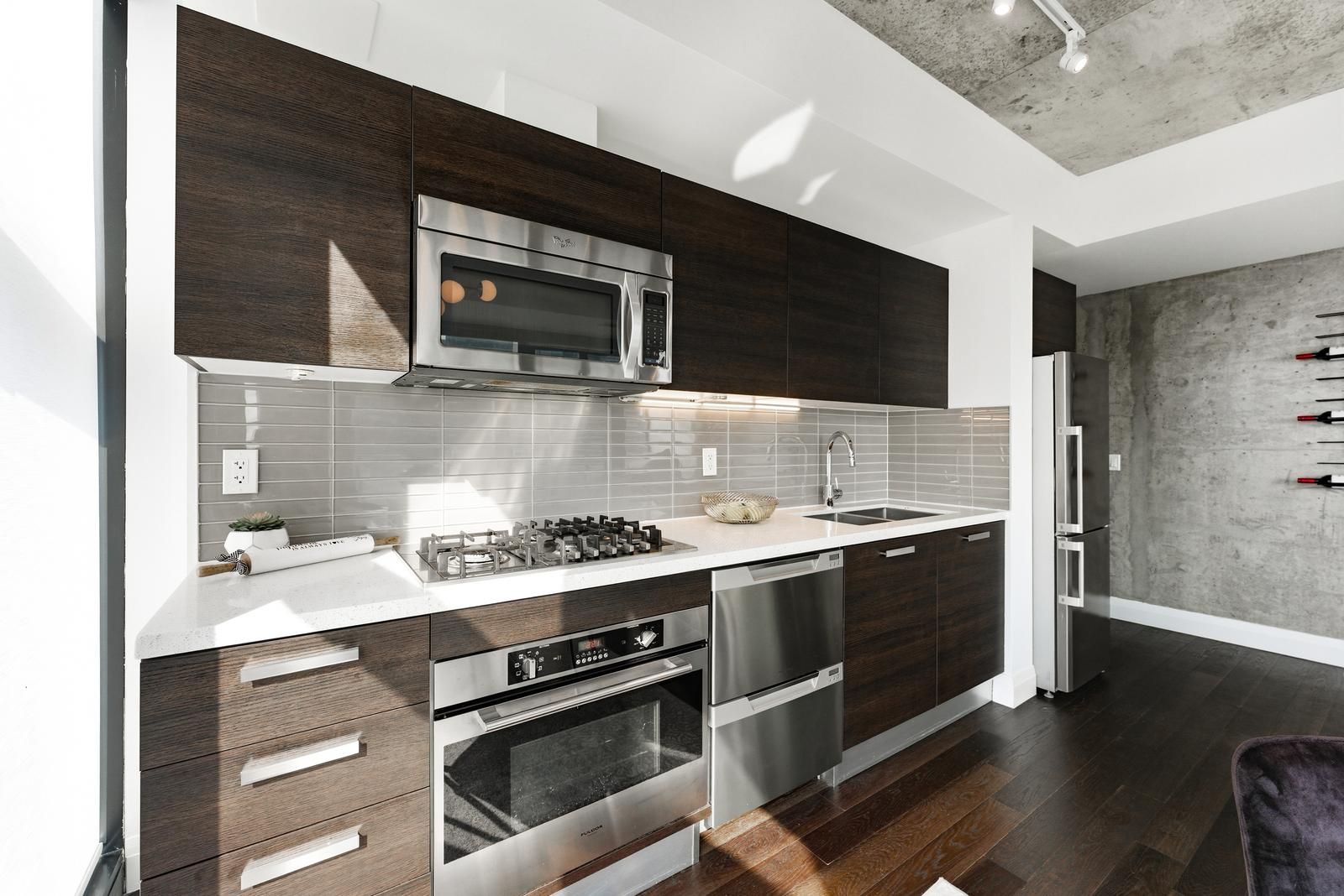 • Modern kitchen equipped with a gas cooktop and chic loft aesthetics.