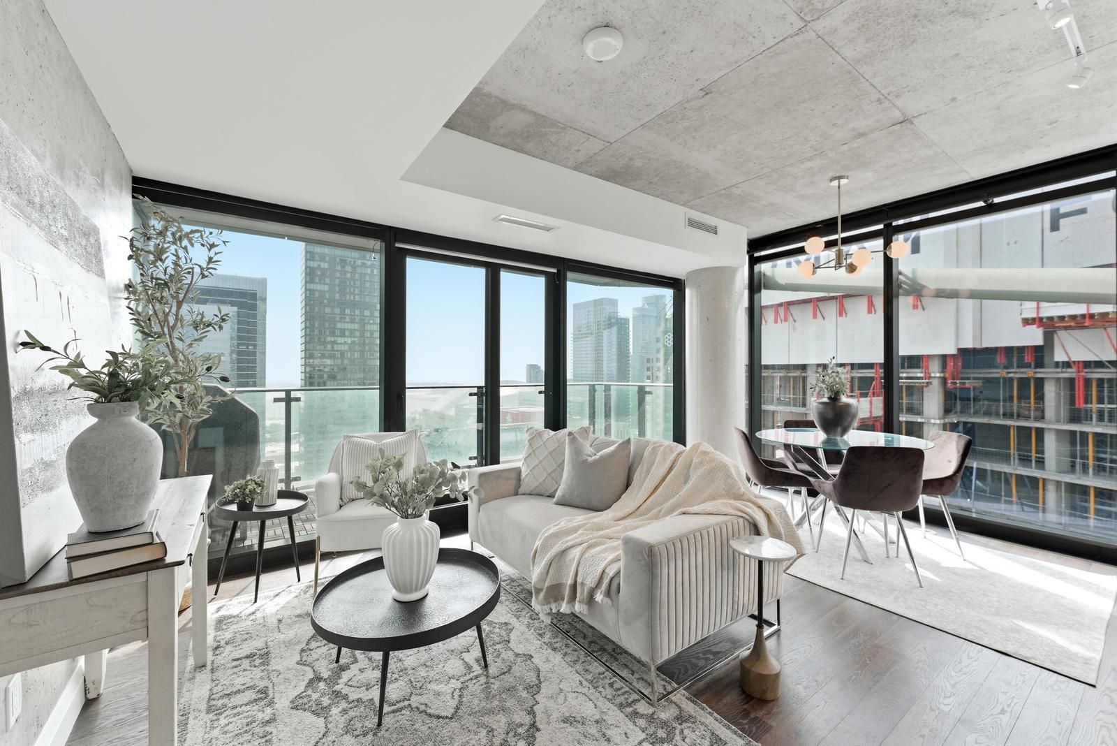 Welcome to elevated downtown living at its finest in the heart of king st w! Situated on the 29th floor of the theatre park building, this stunning corner suite offers spectacular southwest views of the lake and the city all from the comfort of your own home. The expansive floor to ceiling windows allow natural light to pour into this thoughtfully designed unit which features a gorgeous modern kitchen with a gas cooktop, exposed concrete walls/ ceilings & columns for a chic loft aesthetic and automated blinds which provide effortless convenience & privacy at the touch of a button. The nearly 9-foot ceilings enhance the airy feel, while engineered wood flooring & upgraded light fixtures bring warmth & sophistication. The open-concept layout flows seamlessly to a very large balcony equipped with a gas bbq - perfect for entertaining while enjoying the panoramic views. Both bedrooms include closet organizers maximizing storage and functionality. Residents experience the benefits of exceptional building amenities including a 24 hour concierge/security, outdoor pool, fully-equipped gym & stylish party room. With a walk score of 100, you are only steps to the path, st andrew subway station, world-class dining, royal alexandra theatre, princess of wales theatre, roy thompson hall, the financial district, toronto's vibrant waterfront, sporting venues & so much more. Experience the perfect blend of architectural design, modern comfort and unbeatable location.