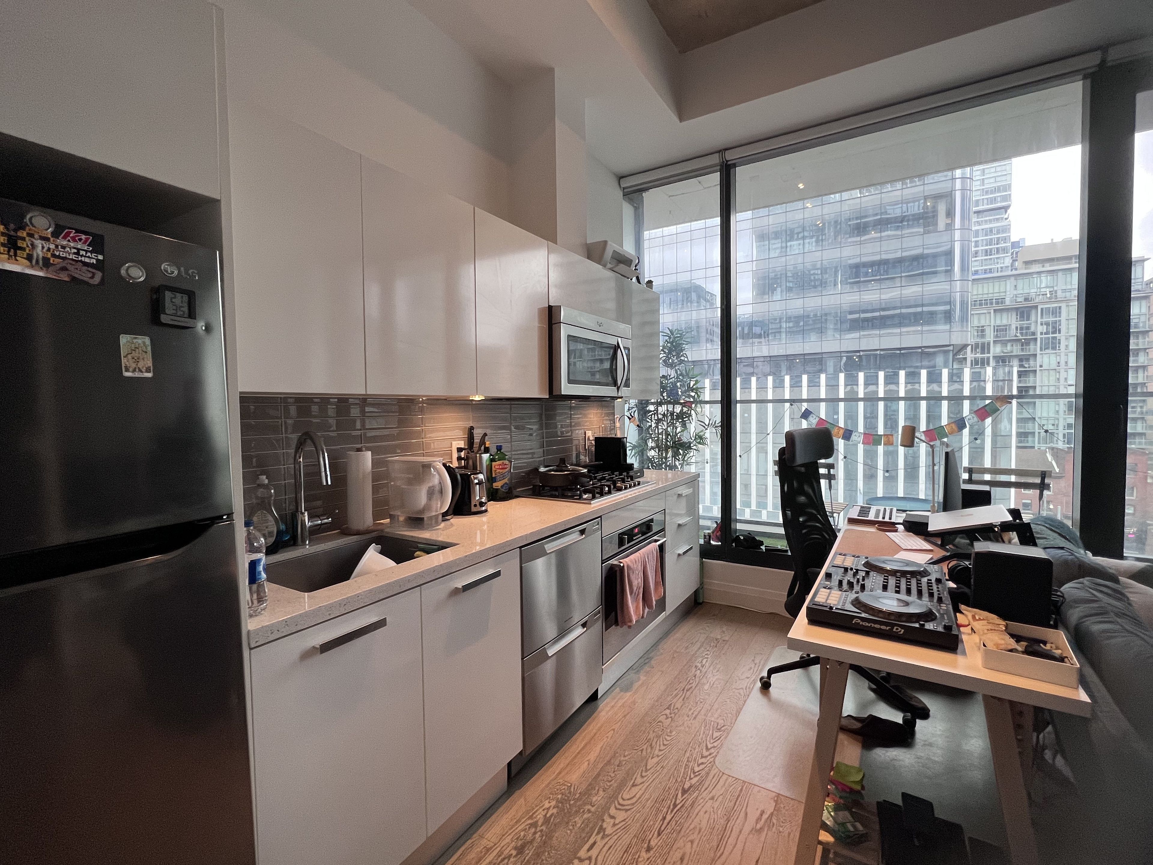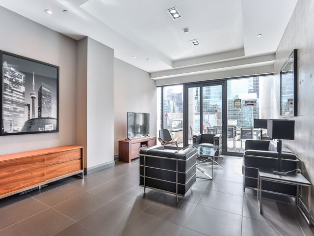 "theatre park" - a luxury high-rise in the heart of king west, directly across from the royal alexandra theatre. This stylish junior one-bedroom suite features soaring 11' exposed concrete ceilings, featured concrete wall, engineered hardwood flooring throughout, and a walk-out terrace. The modern european-style kitchen is equipped with stainless steel appliances, gas cooking, and a gas bbq connection on the balcony-perfect for urban living. Enjoy premium amenities including 24-hour concierge, a stunning rooftop lap pool and deck, party room, and a fully equipped fitness centre. Ideally situated on the same floor as the lounge and rooftop pool for exceptional convenience. Just minutes' walk to the subway, financial district, and eaton centre. An ideal home for a professional seeking vibrant downtown living at its best.
