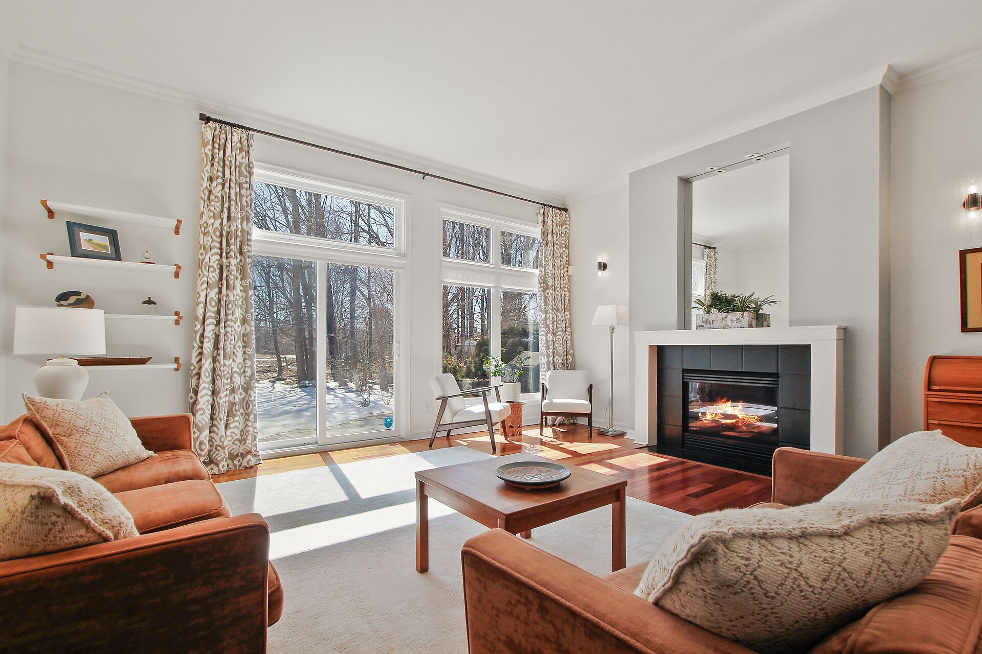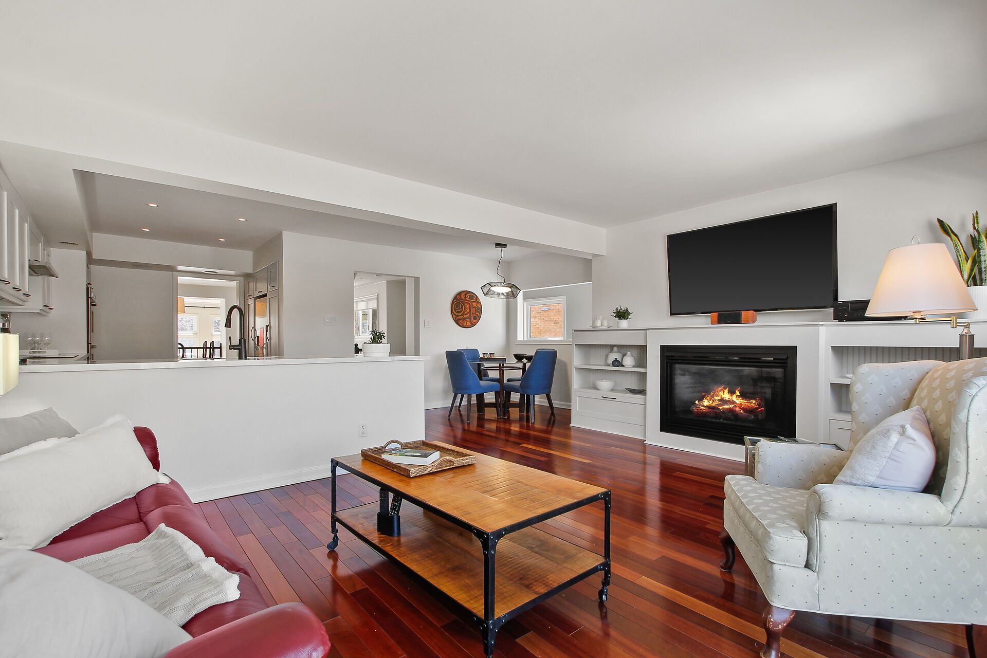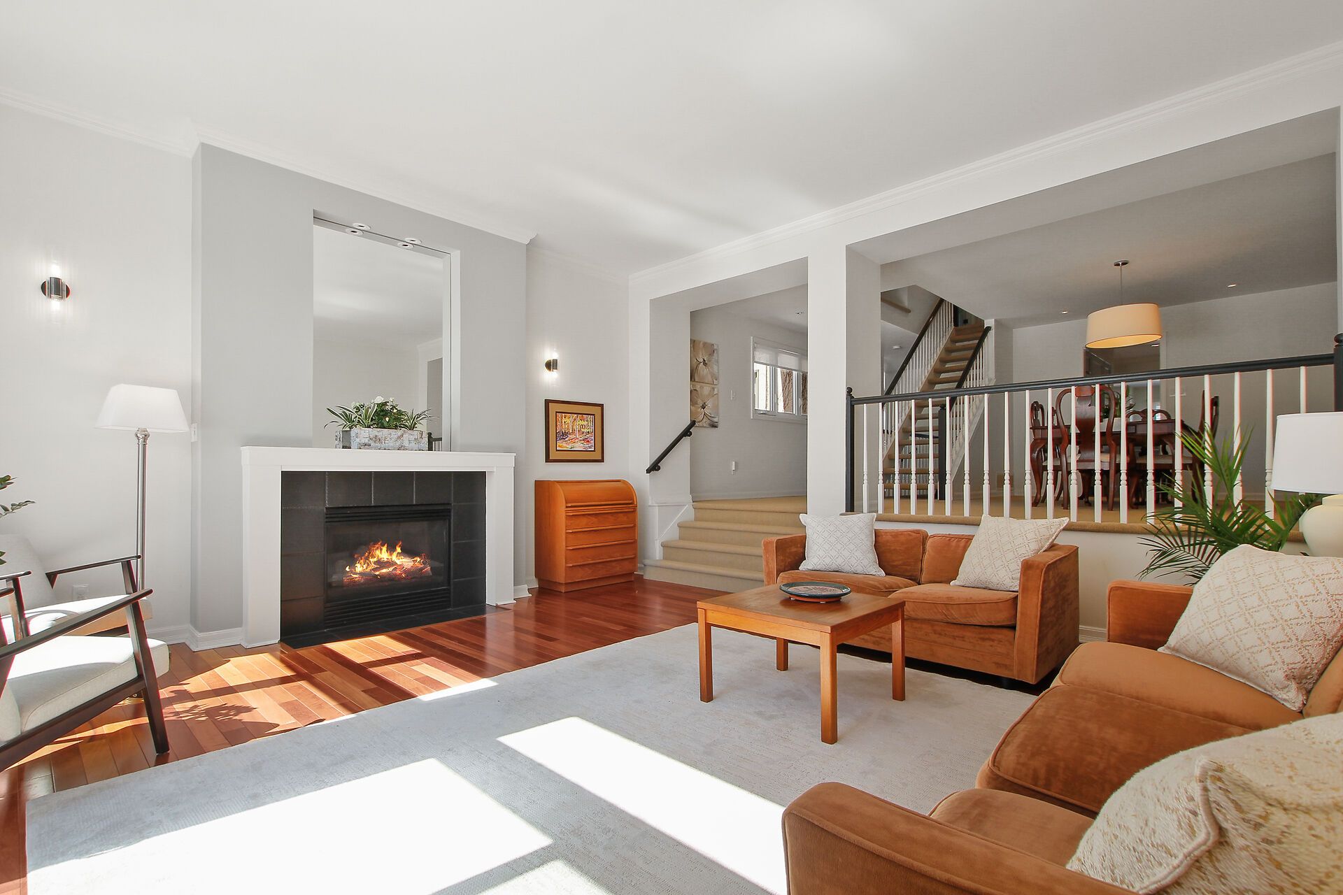 • Expansive living room featuring high ceilings and a cozy gas fireplace.