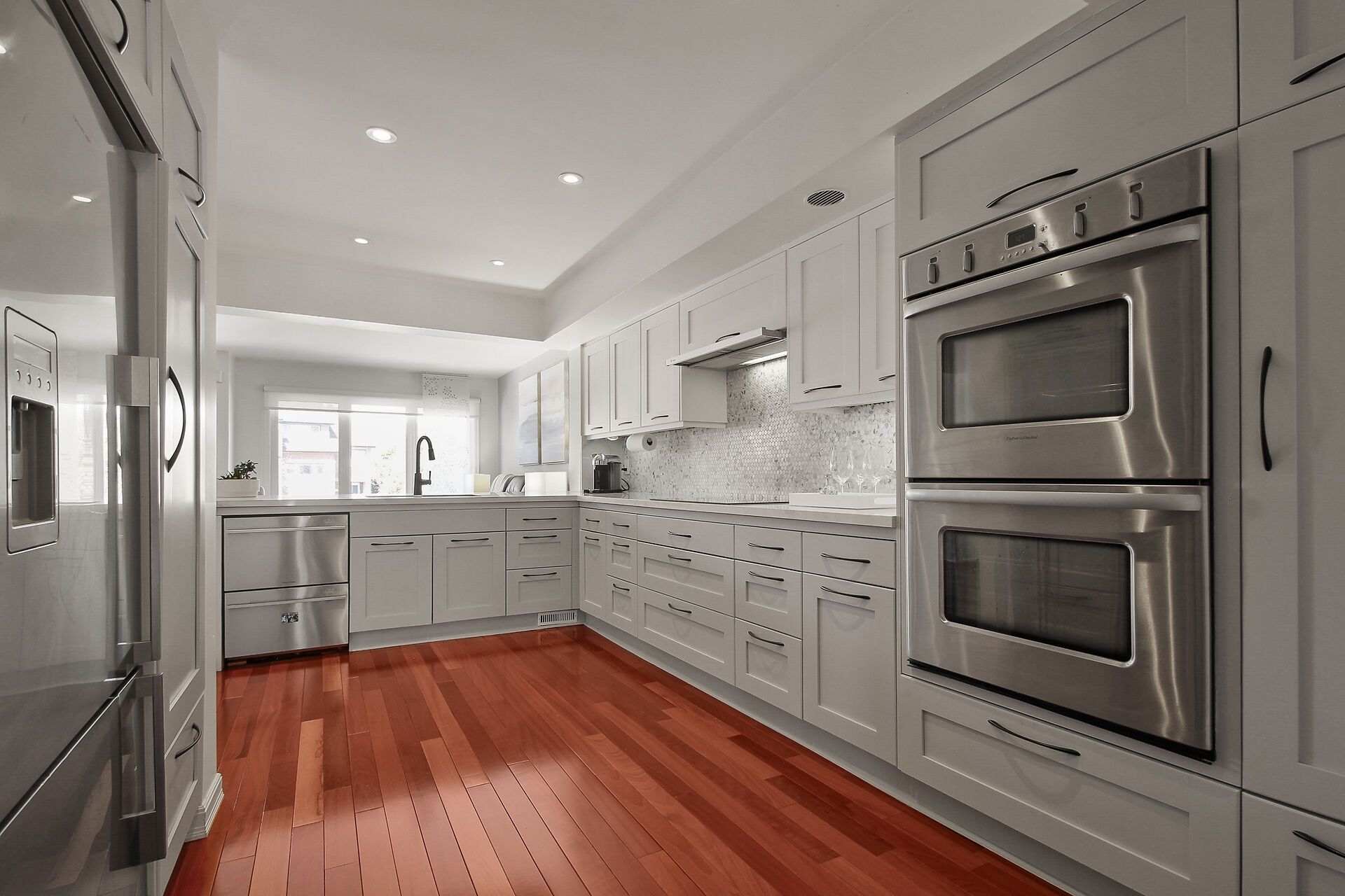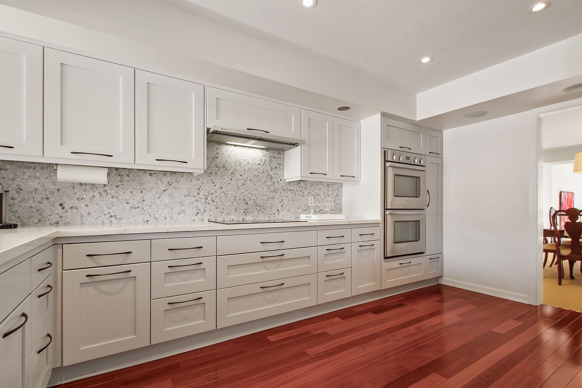 • Gourmet kitchen with quartz counters and two wall ovens for cooking enthusiasts.