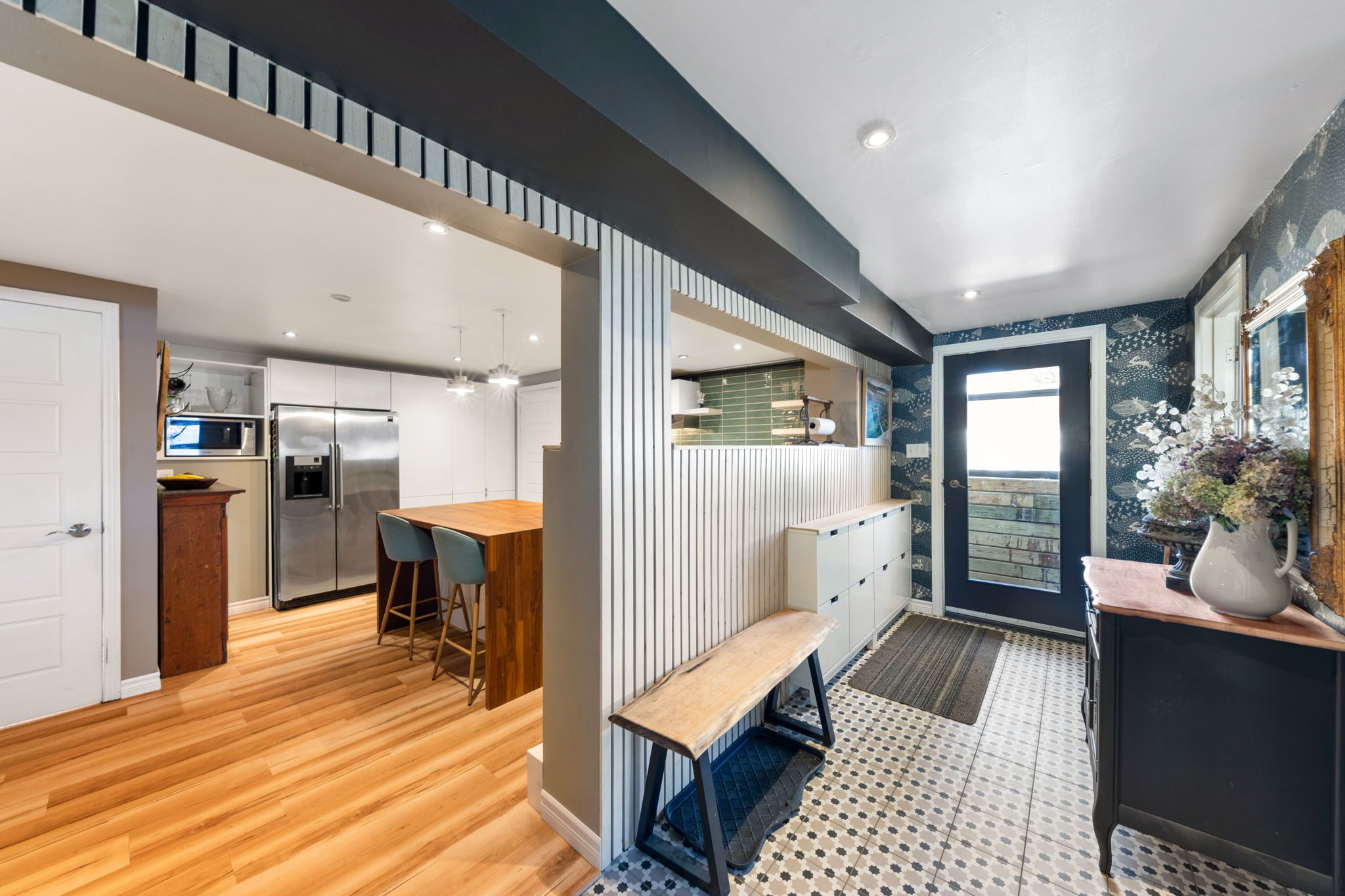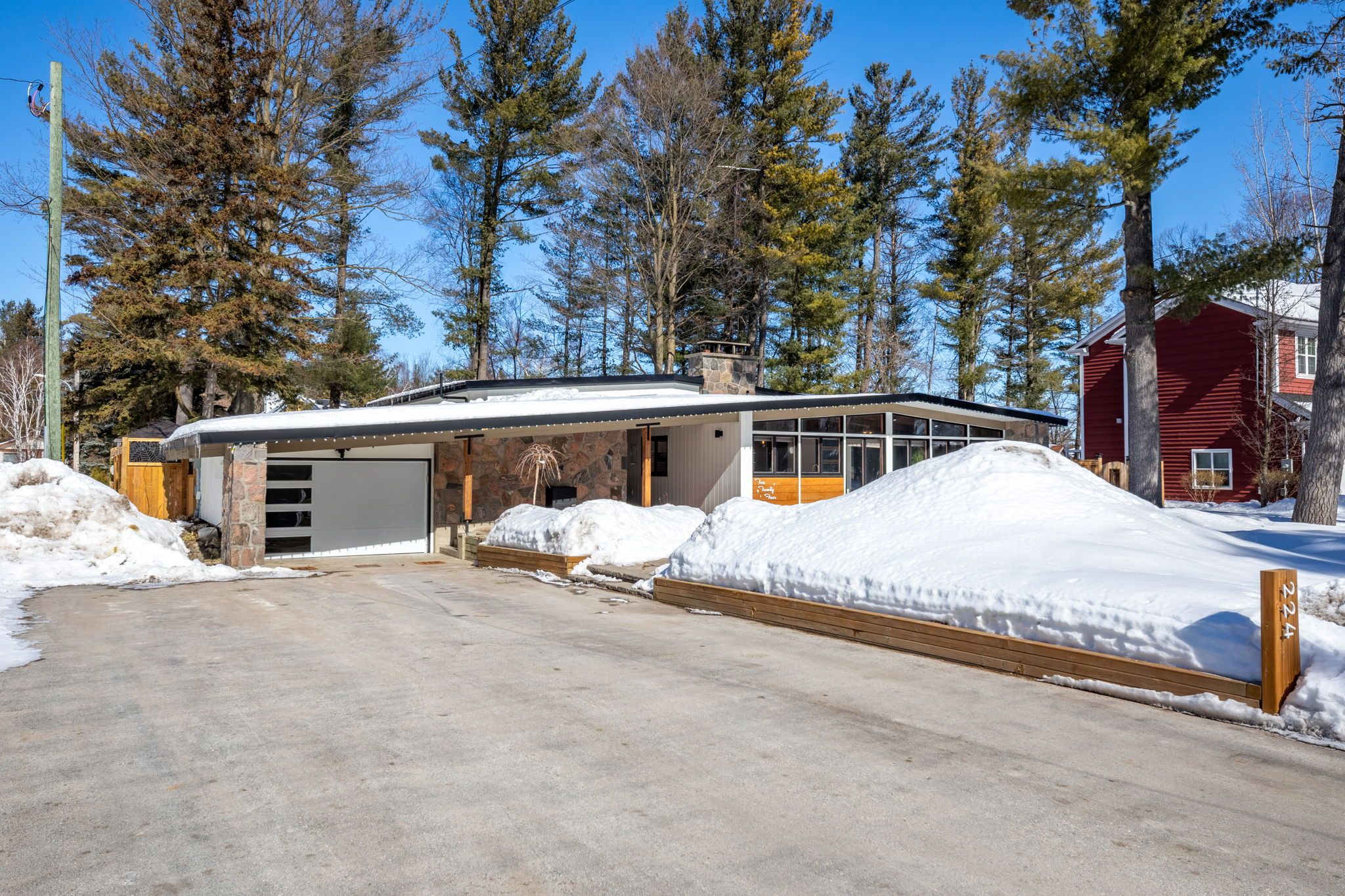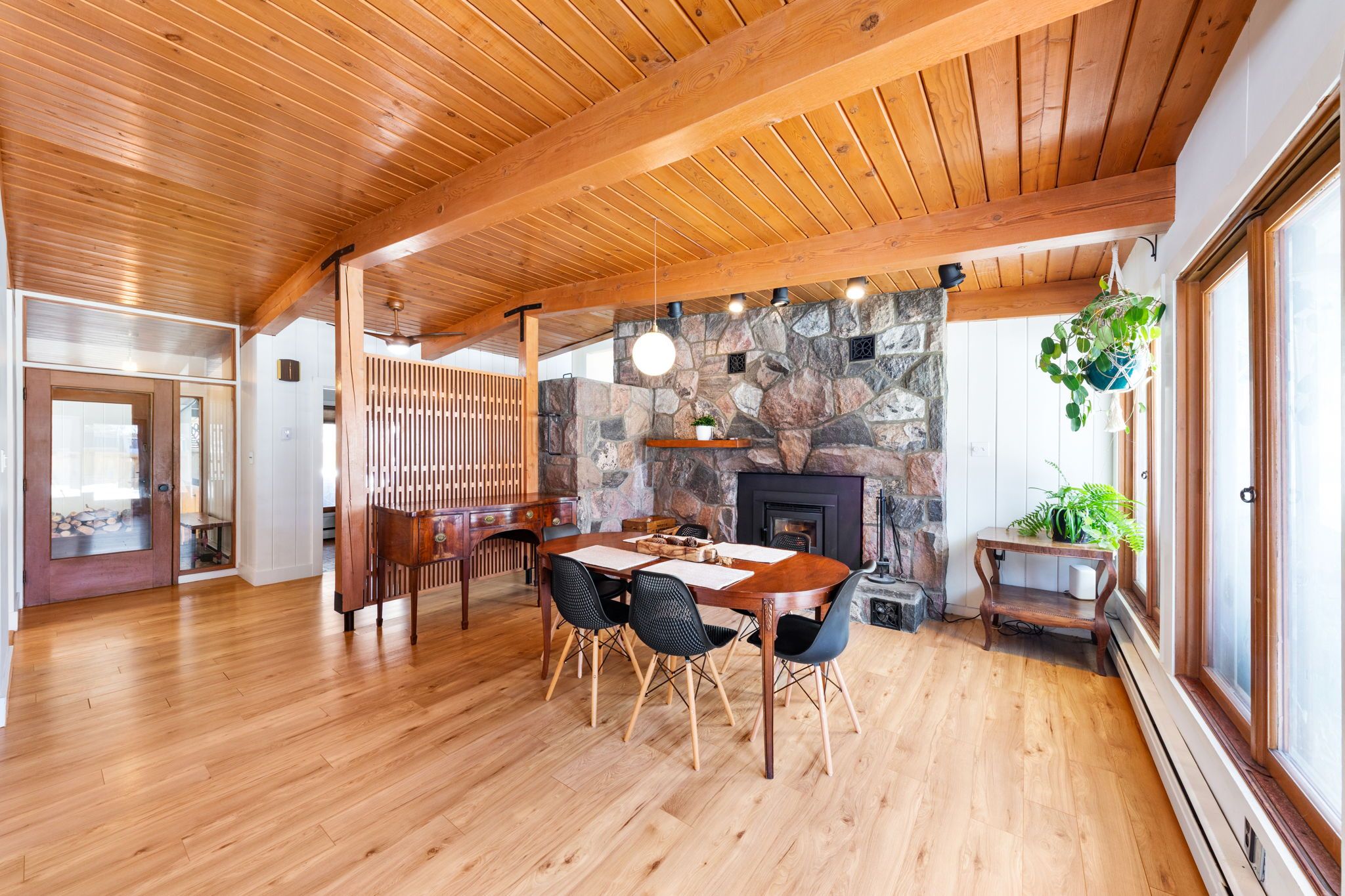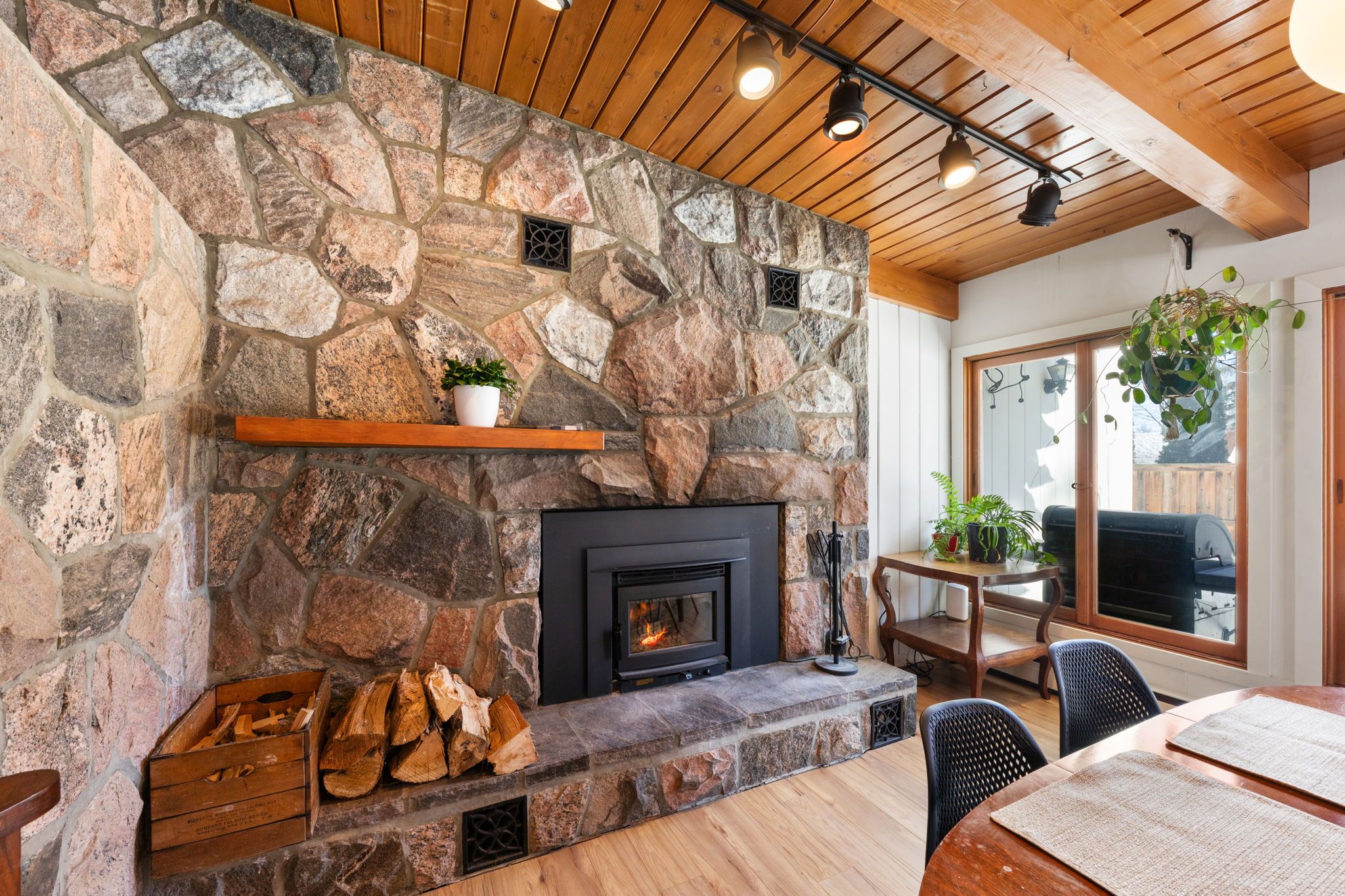 Modern mid-century multi-generational home located on a desirable quiet street in the charming town of stayner, set on a large fully fenced lot. A covered breezeway connects the home to the heated two-car garage, offering sheltered access year-round. Inside, a spacious entryway welcomes you into a stunning dining room featuring a dramatic floor-to-ceiling stone wood-burning fireplace, original exposed wood ceiling beams, and a walkout to the backyard. The bright living room is filled with natural light from oversized windows, creating a warm and inviting space for family gatherings. The updated kitchen is designed for both style and functionality with stainless steel appliances, dual sinks, a large waterfall butcher block island with built-in wine fridge, and a generous pantry. The main level also offers a handy home office and convenient 2-piece bath. Upstairs, the impressive primary suite features a walk-in closet, large ensuite with soaker tub and separate shower, in-suite laundry, and doors leading to a private balcony. Three additional well-sized bedrooms and a modern 3-piece bathroom with oversized shower complete the upper level. The lower level offers a bright, self-contained two-bedroom apartment with above-grade windows, separate entrance, and interior access from the main home - ideal for multi-generational living or potential income. This space features a modern kitchen with stainless steel appliances and butcher block island, a comfortable living area, laundry off the kitchen, and a 3-piece bathroom. The apartment was fully updated in 2020. Recent updates include electrical panel (2020), main kitchen renovation (2022), and new garage door with opener (2022). The heated garage adds year-round comfort. Extensive landscaping along the west side of the home and a new fence installed in 2025 complete the outdoor space. This is a fantastic opportunity to own a spacious multi-generational home in the welcoming community of stayner. Don't miss this one!
