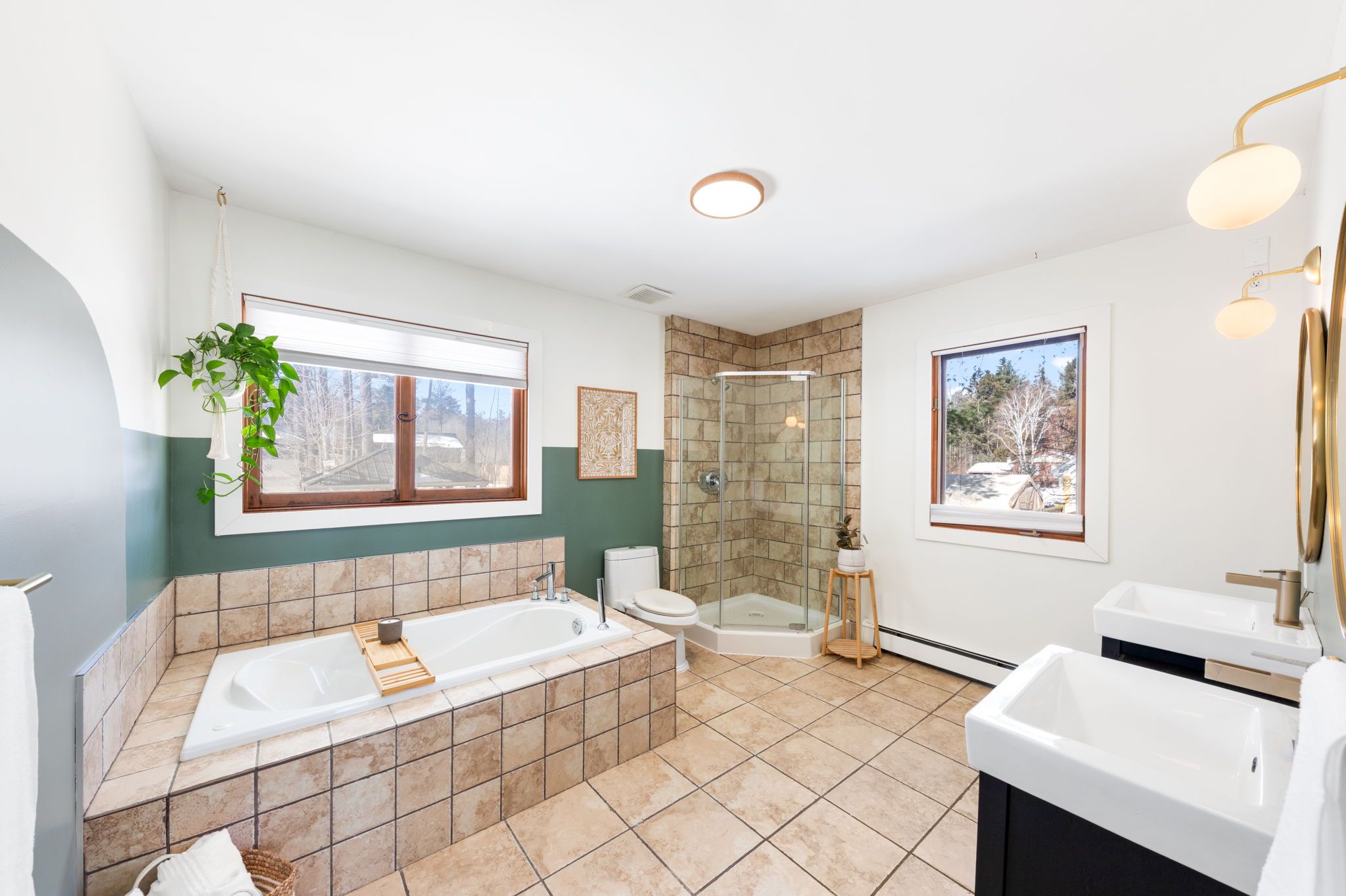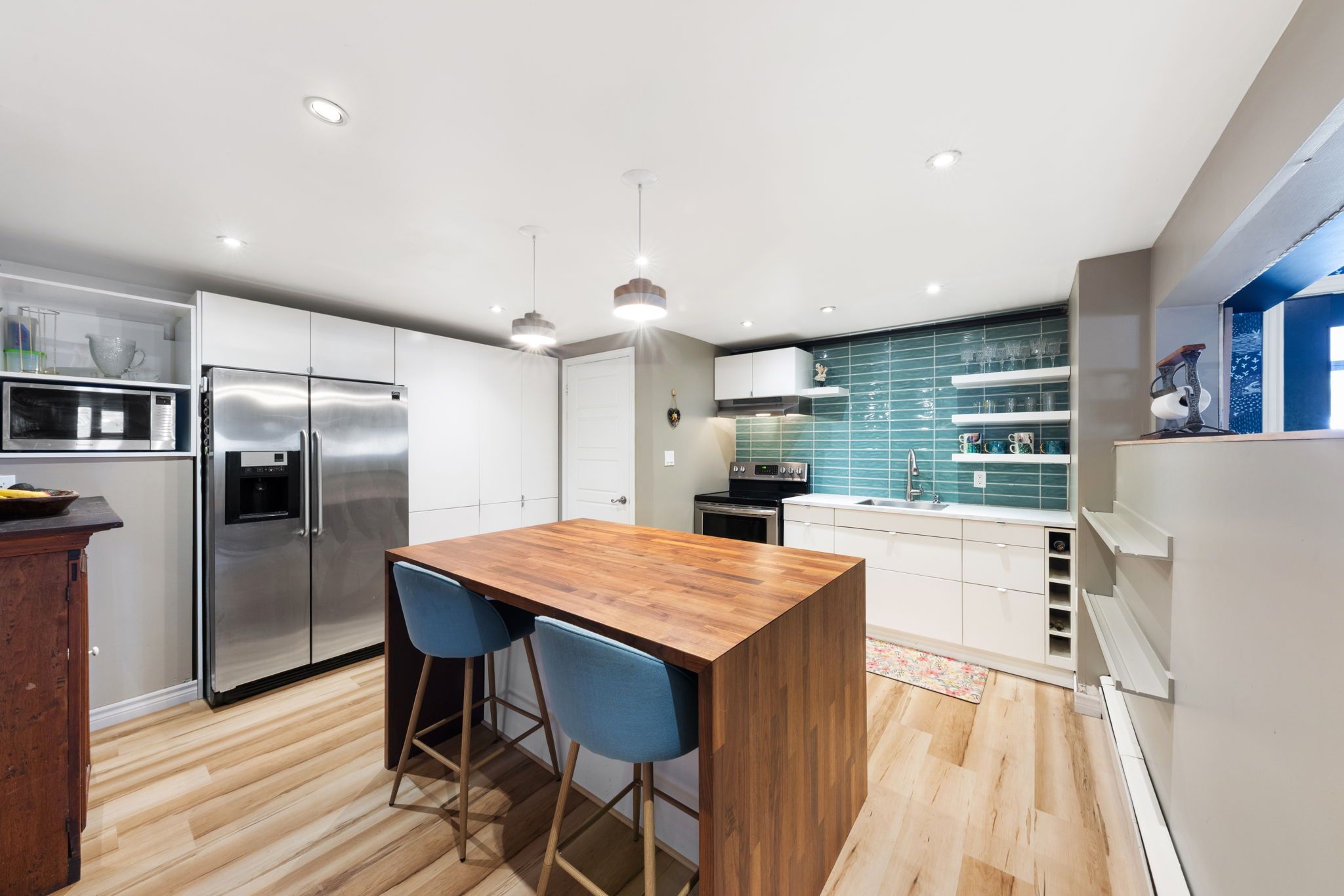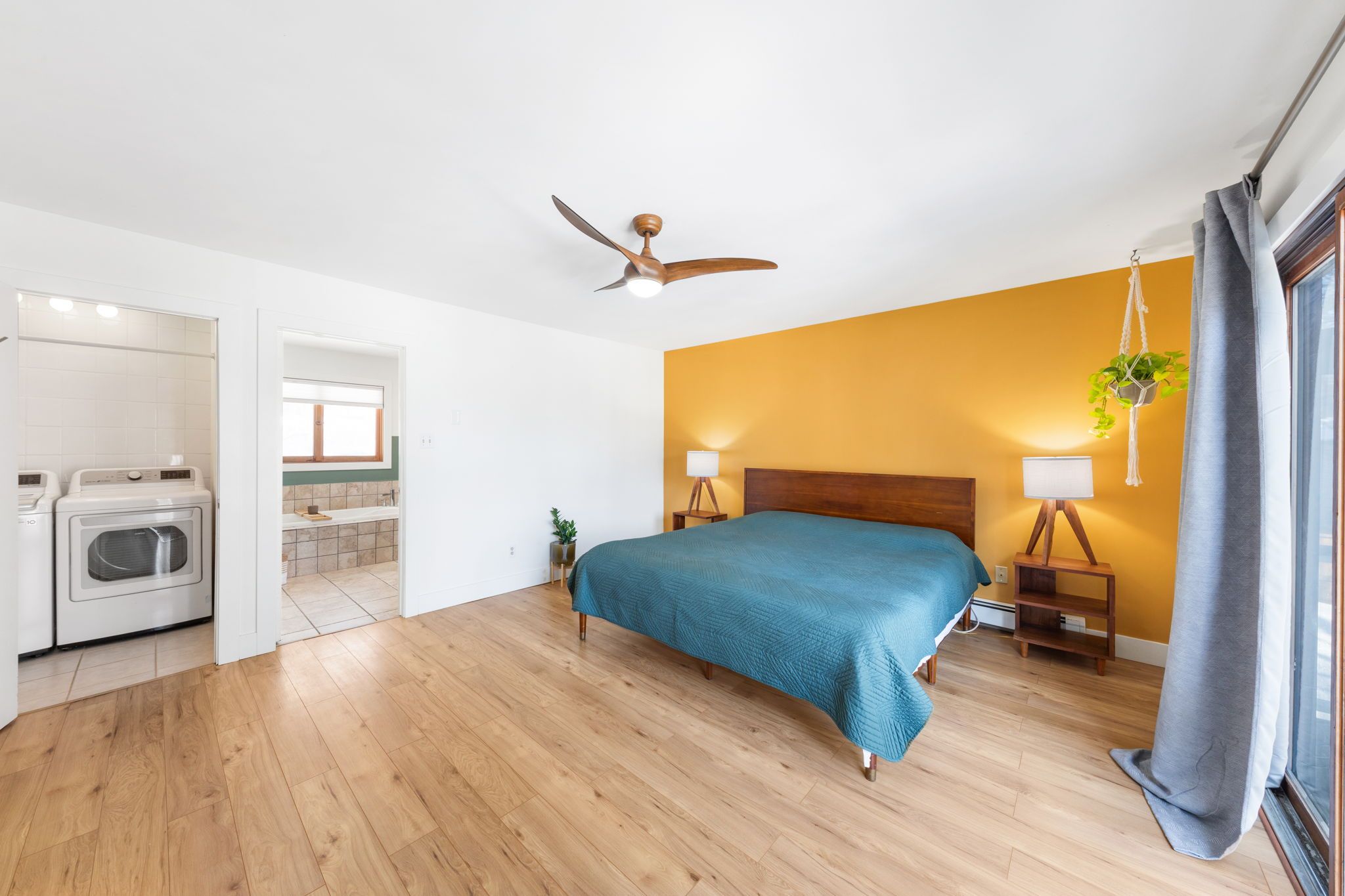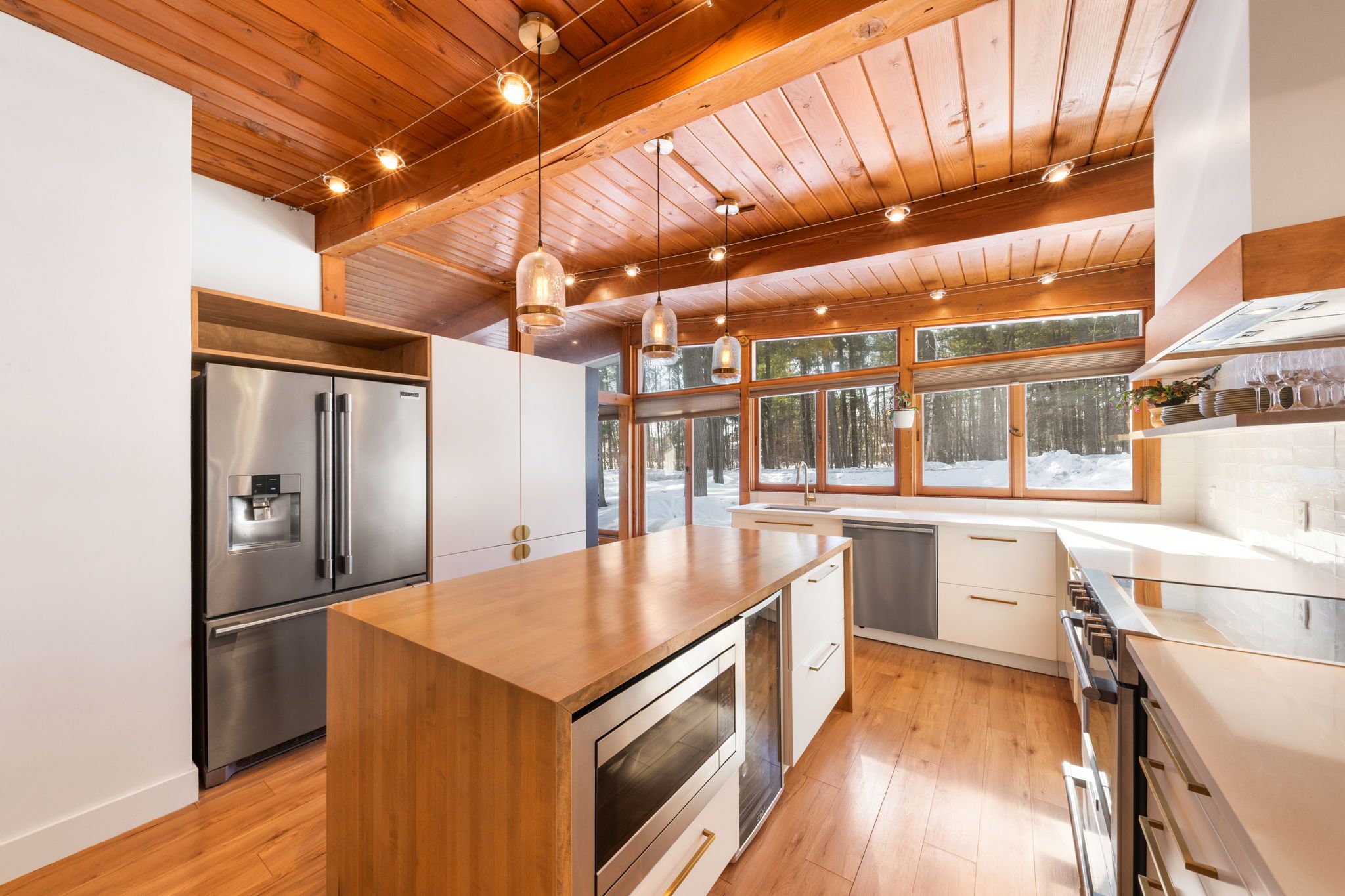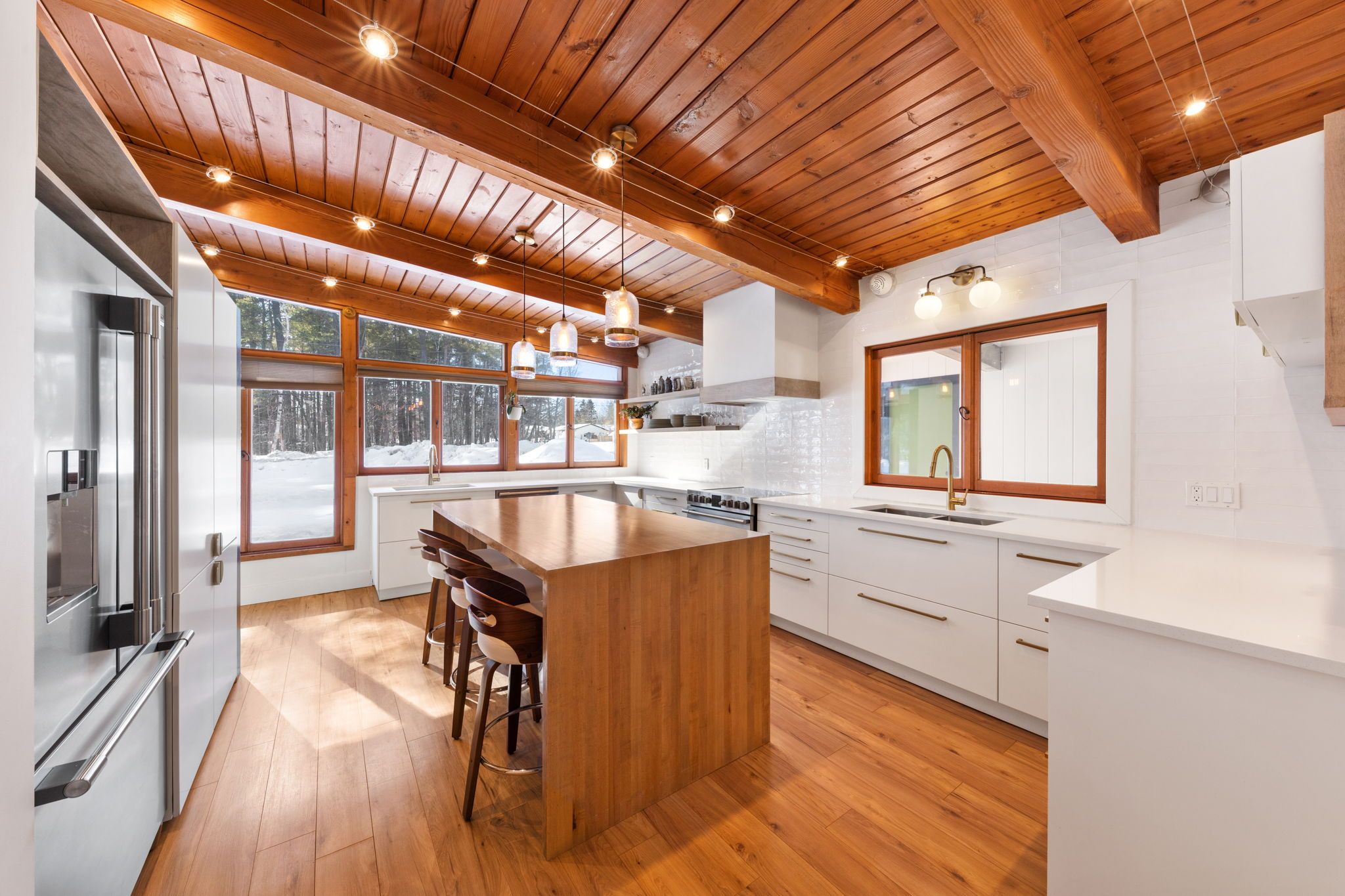 Modern mid-century multi-generational home located on a desirable quiet street in the charming town of stayner, set on a large fully fenced lot. A covered breezeway connects the home to the heated two-car garage, offering sheltered access year-round. Inside, a spacious entryway welcomes you into a stunning dining room featuring a dramatic floor-to-ceiling stone wood-burning fireplace, original exposed wood ceiling beams, and a walkout to the backyard. The bright living room is filled with natural light from oversized windows, creating a warm and inviting space for family gatherings. The updated kitchen is designed for both style and functionality with stainless steel appliances, dual sinks, a large waterfall butcher block island with built-in wine fridge, and a generous pantry. The main level also offers a handy home office and convenient 2-piece bath. Upstairs, the impressive primary suite features a walk-in closet, large ensuite with soaker tub and separate shower, in-suite laundry, and doors leading to a private balcony. Three additional well-sized bedrooms and a modern 3-piece bathroom with oversized shower complete the upper level. The lower level offers a bright, self-contained two-bedroom apartment with above-grade windows, separate entrance, and interior access from the main home - ideal for multi-generational living or potential income. This space features a modern kitchen with stainless steel appliances and butcher block island, a comfortable living area, laundry off the kitchen, and a 3-piece bathroom. The apartment was fully updated in 2020. Recent updates include electrical panel (2020), main kitchen renovation (2022), and new garage door with opener (2022). The heated garage adds year-round comfort. Extensive landscaping along the west side of the home and a new fence installed in 2025 complete the outdoor space. This is a fantastic opportunity to own a spacious multi-generational home in the welcoming community of stayner. Don't miss this one!