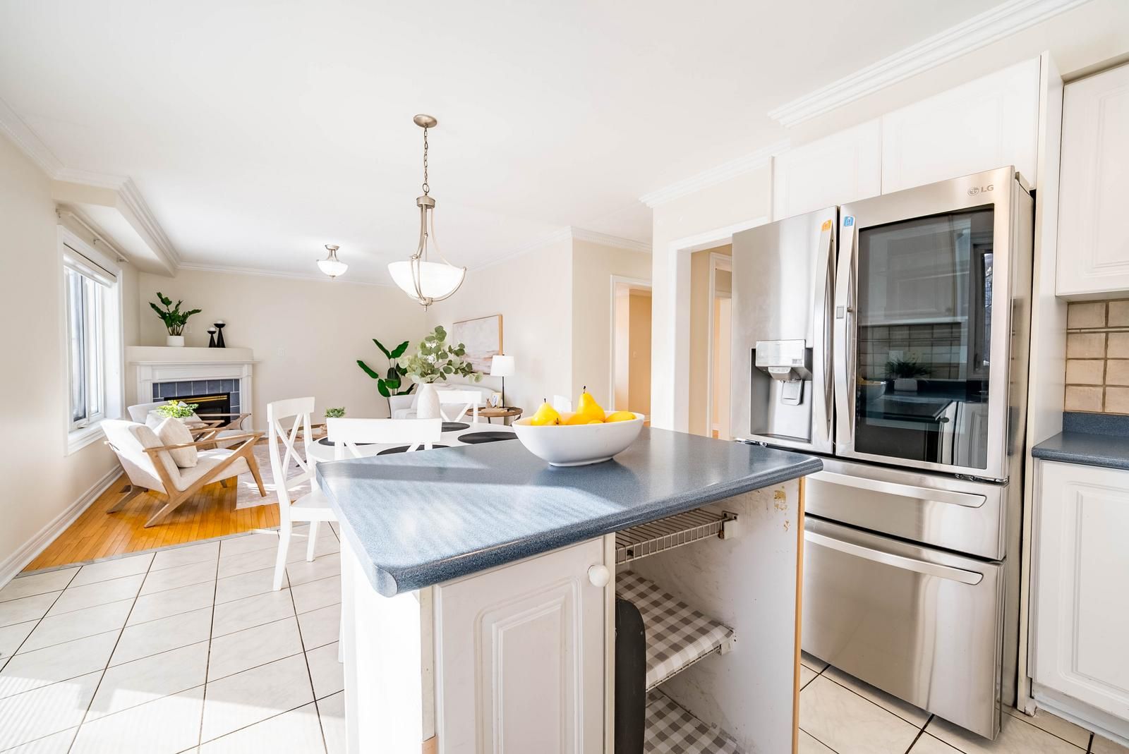 • Eat-in kitchen with island overlooks family room featuring a gas fireplace.