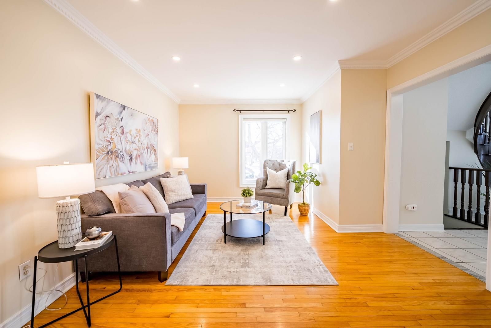 • Bright foyer opens to formal living and dining areas with hardwood flooring.