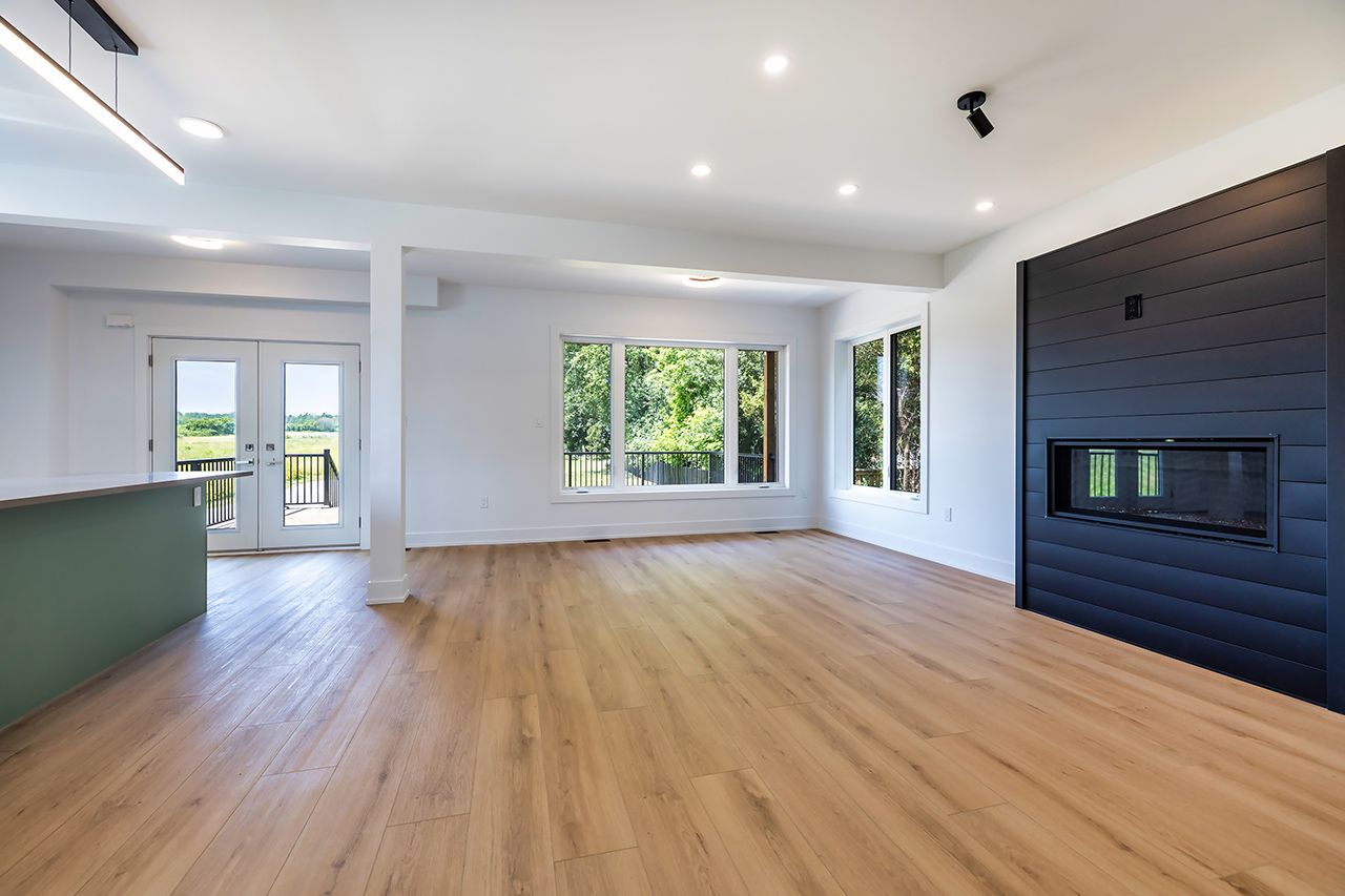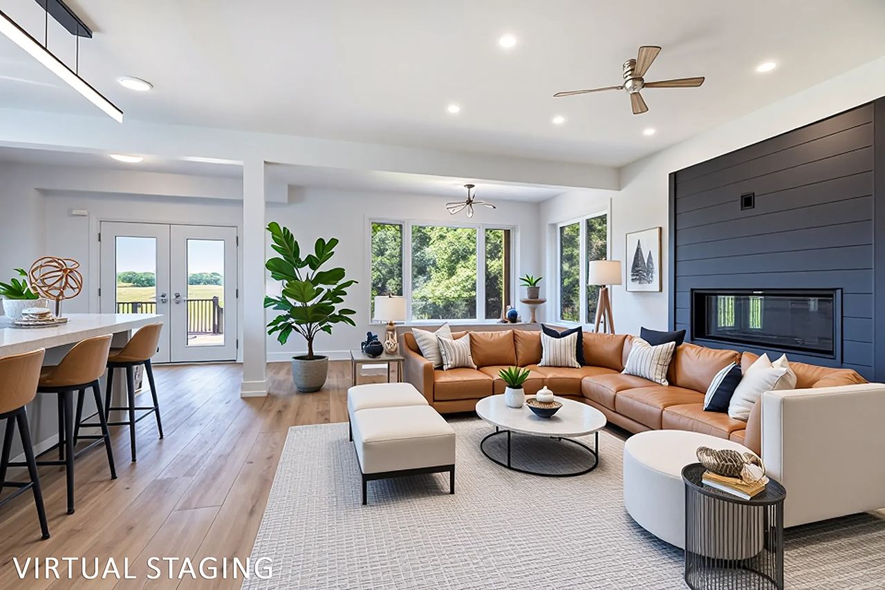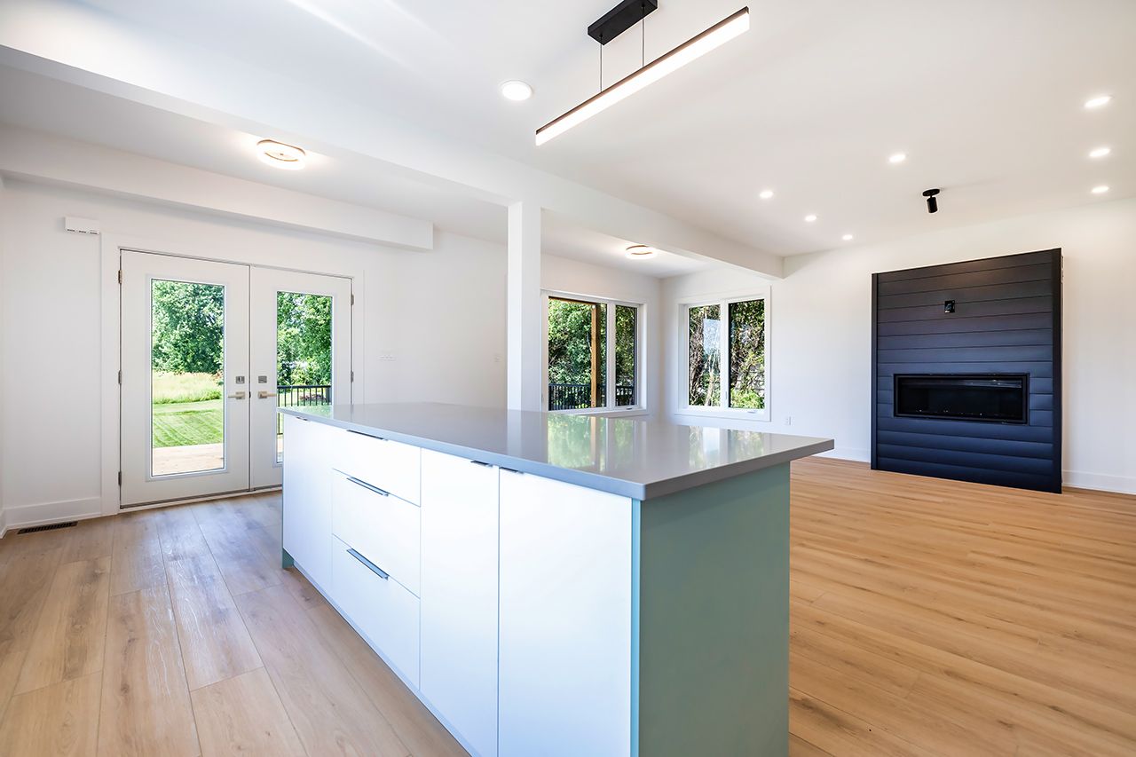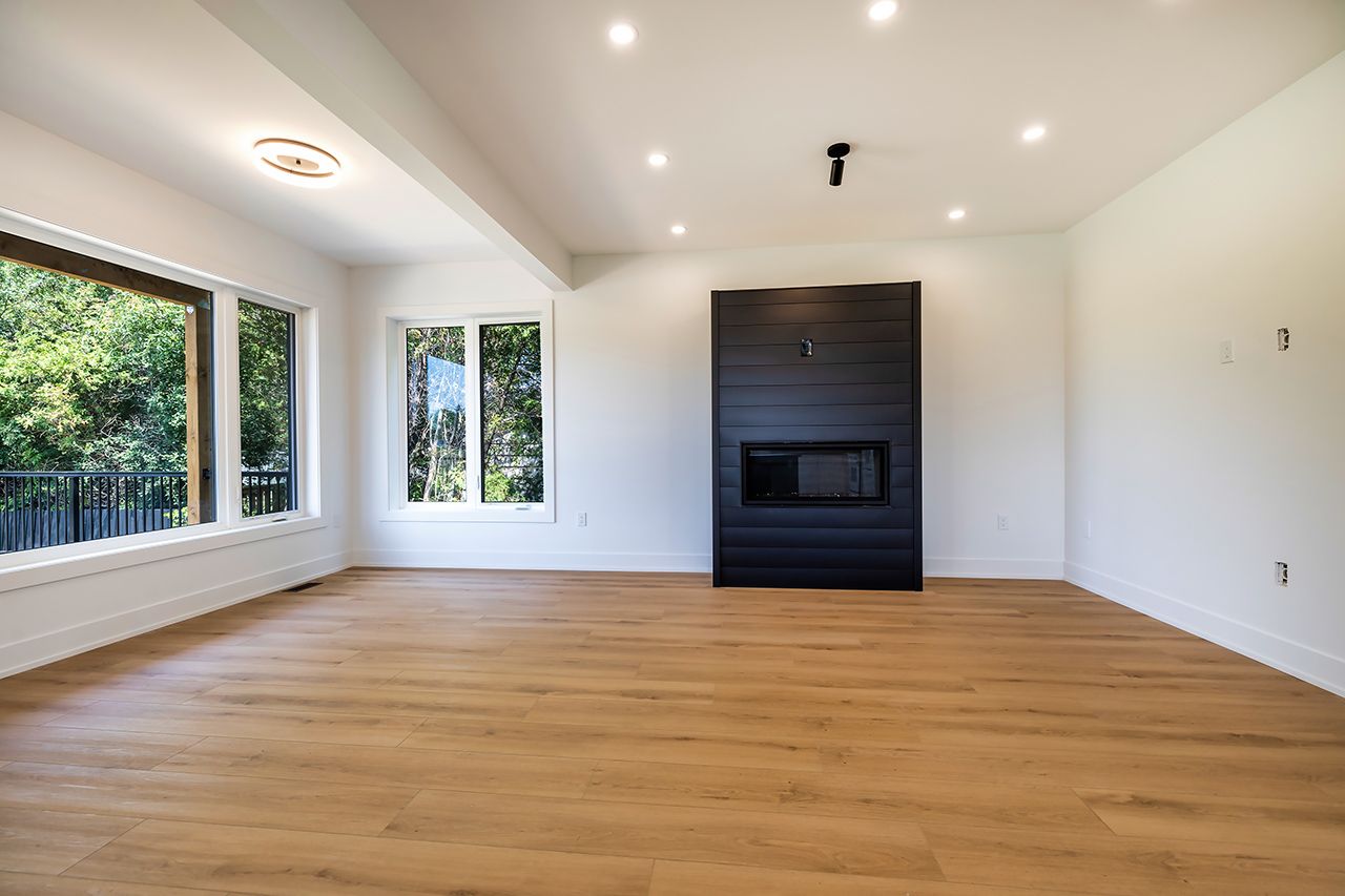 • Open-concept layout with high ceilings and a gas fireplace for a spacious feel.