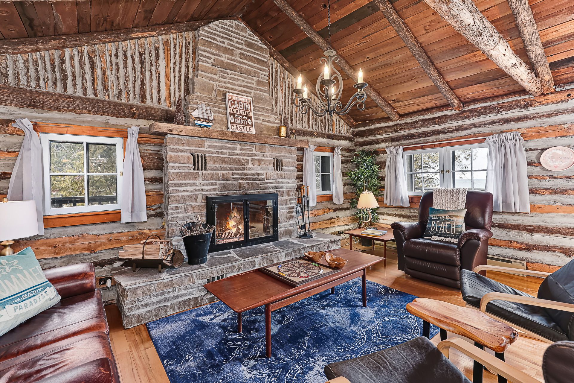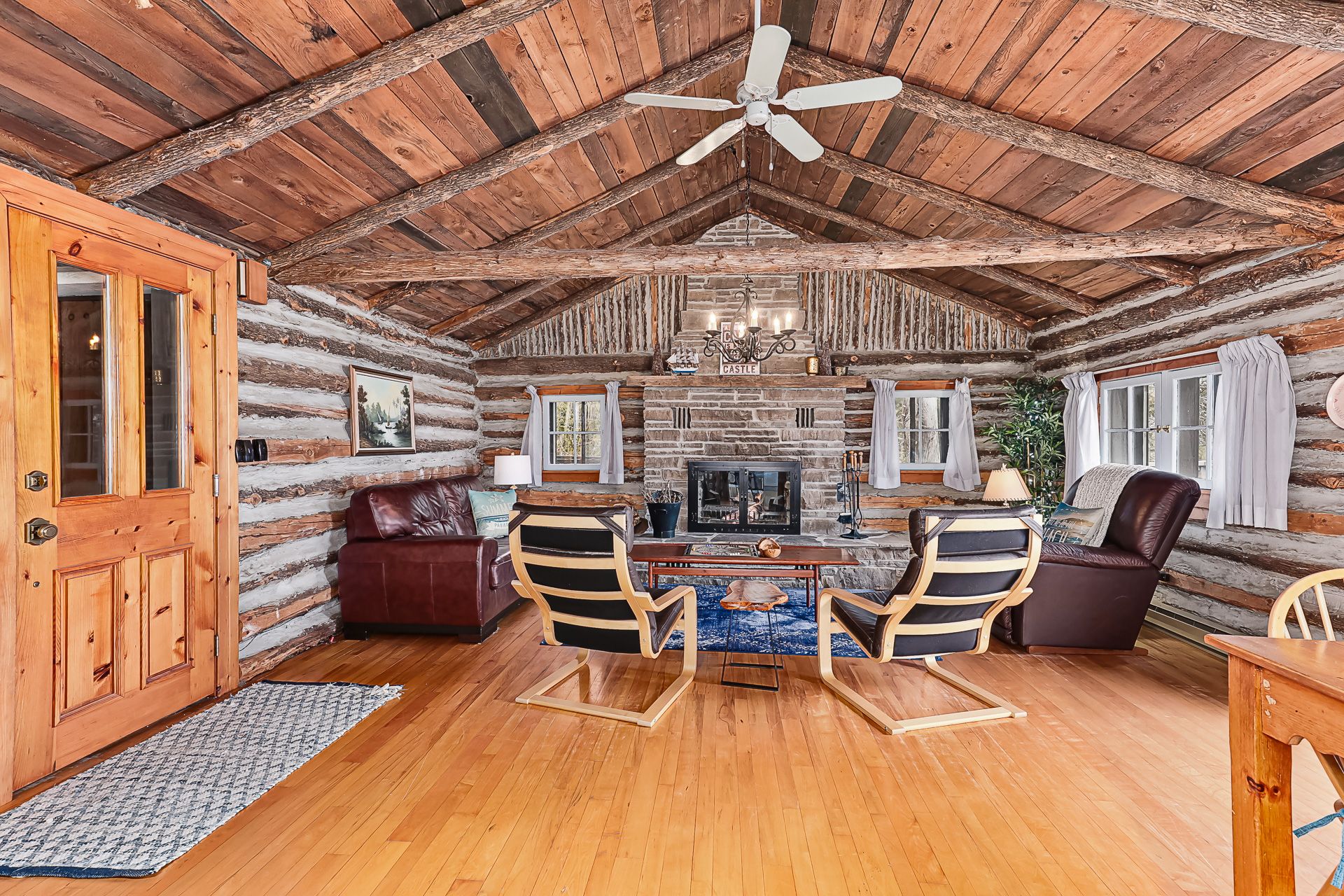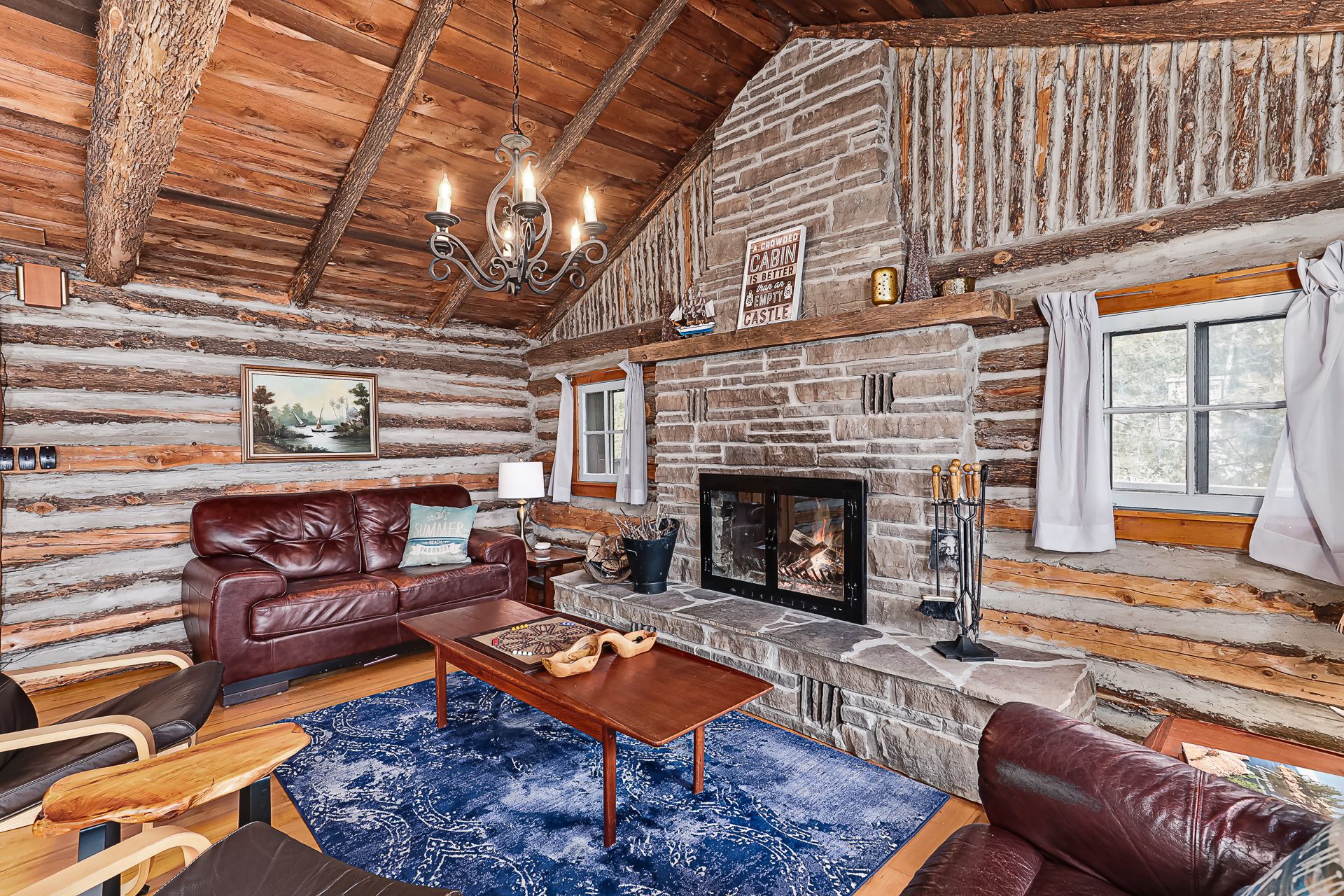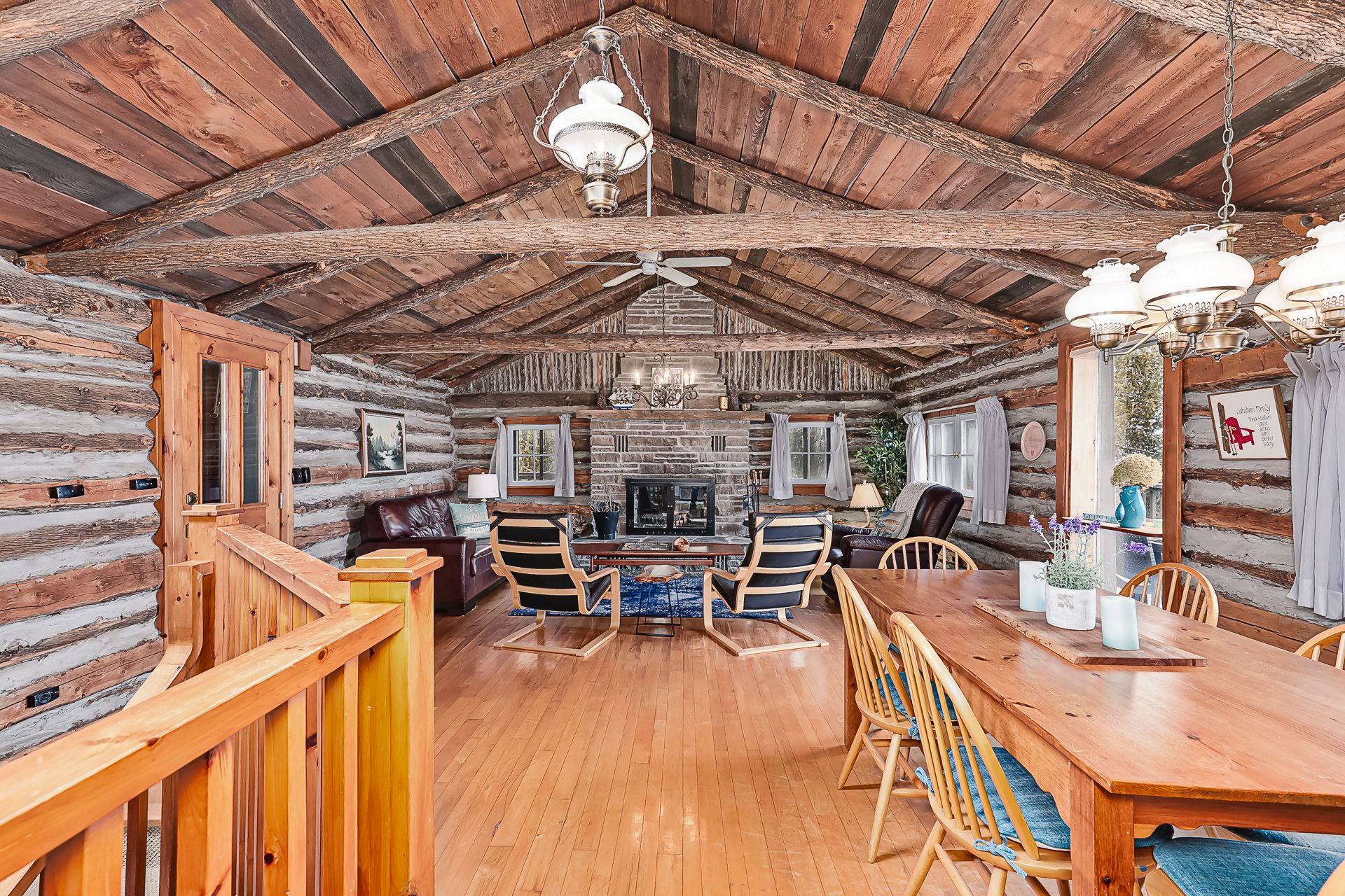 • Original log great room with cathedral ceilings and a cozy wood-burning fireplace.