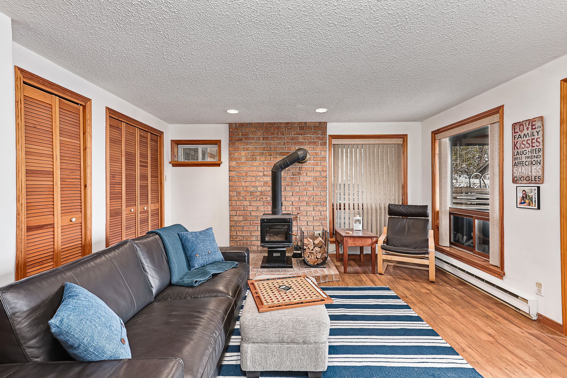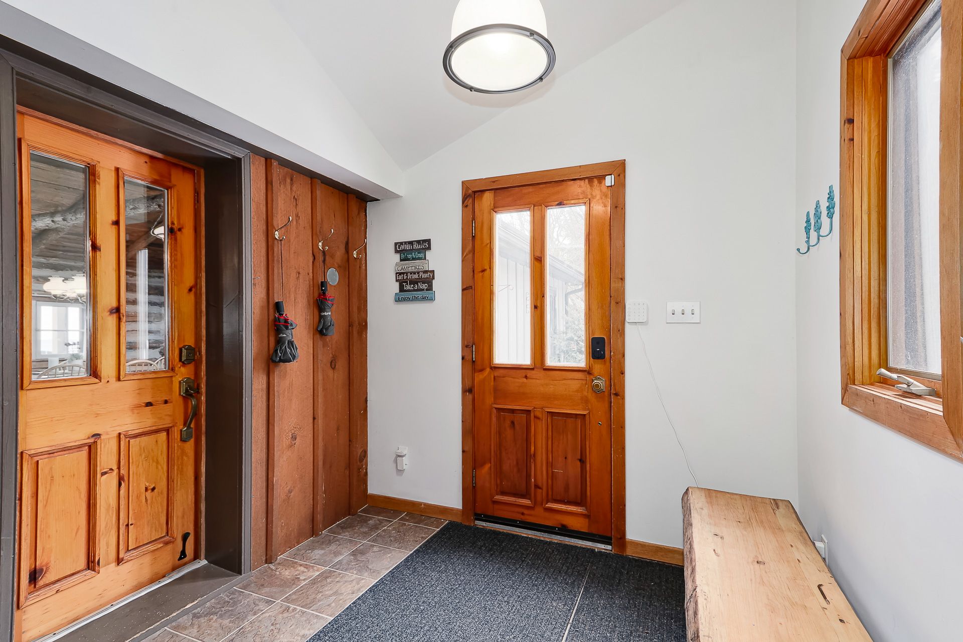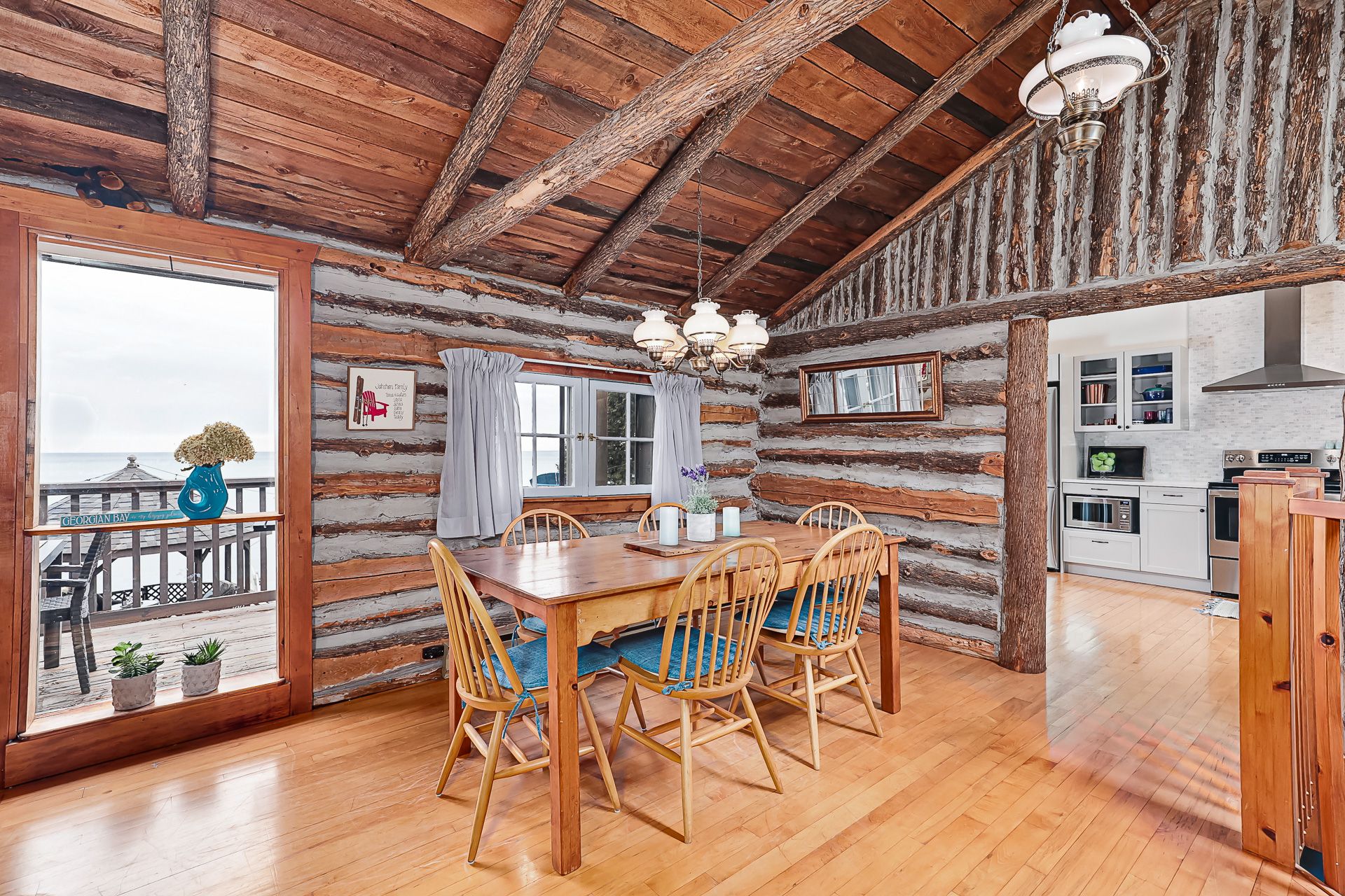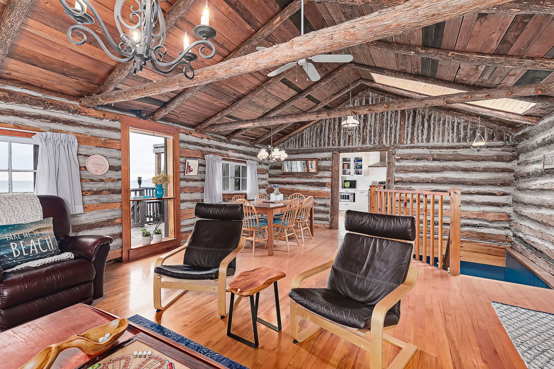 • Original log great room with cathedral ceilings and a cozy wood-burning fireplace.