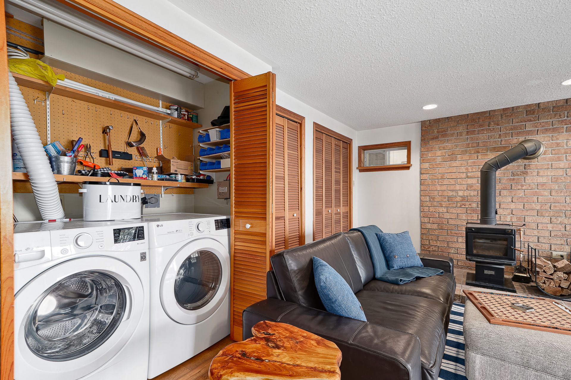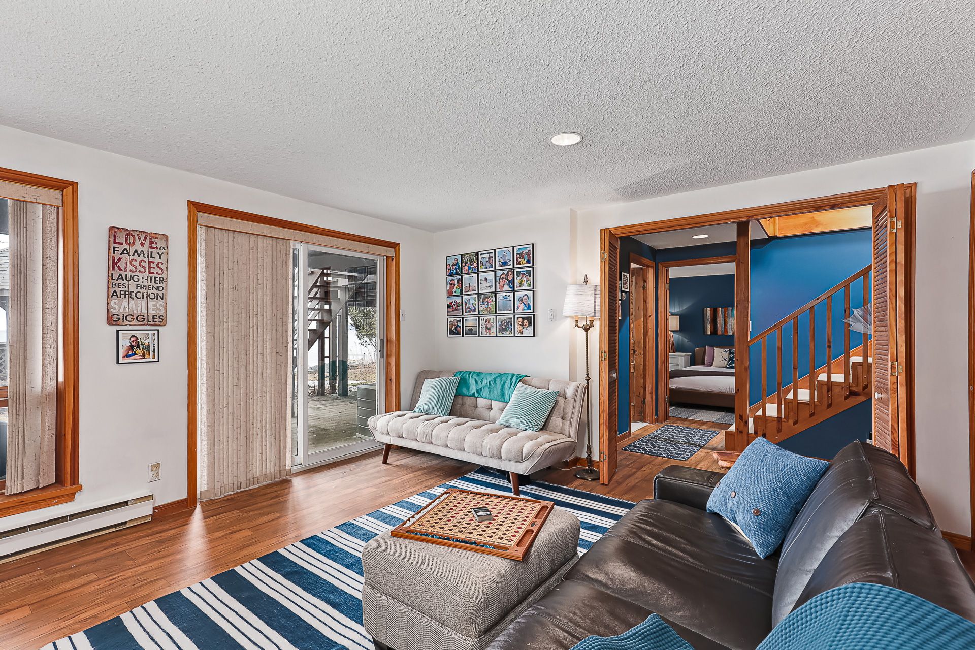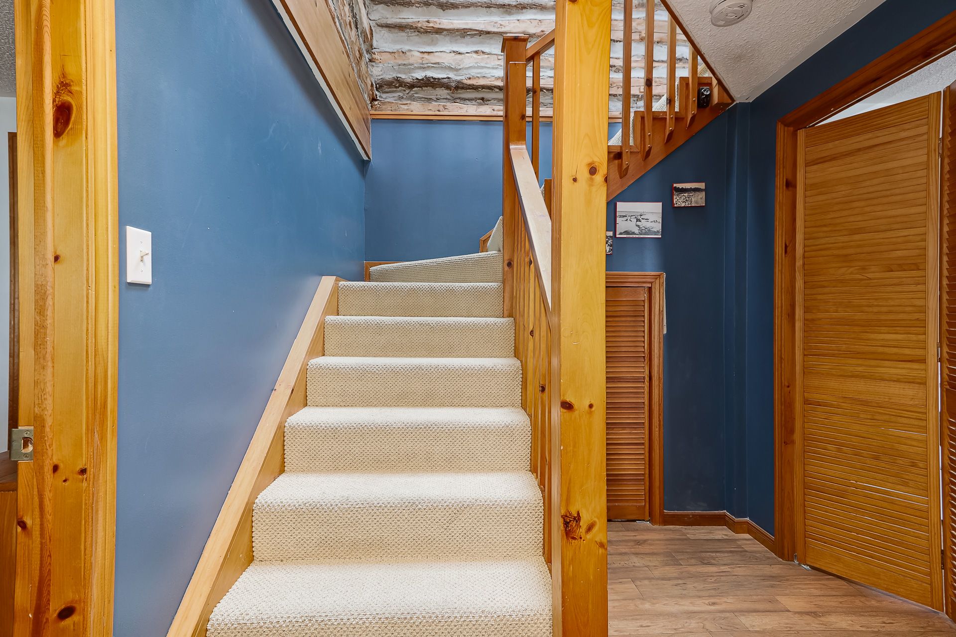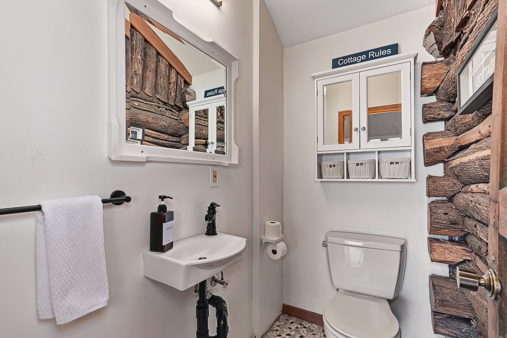 • Original log great room with cathedral ceilings and a cozy wood-burning fireplace.