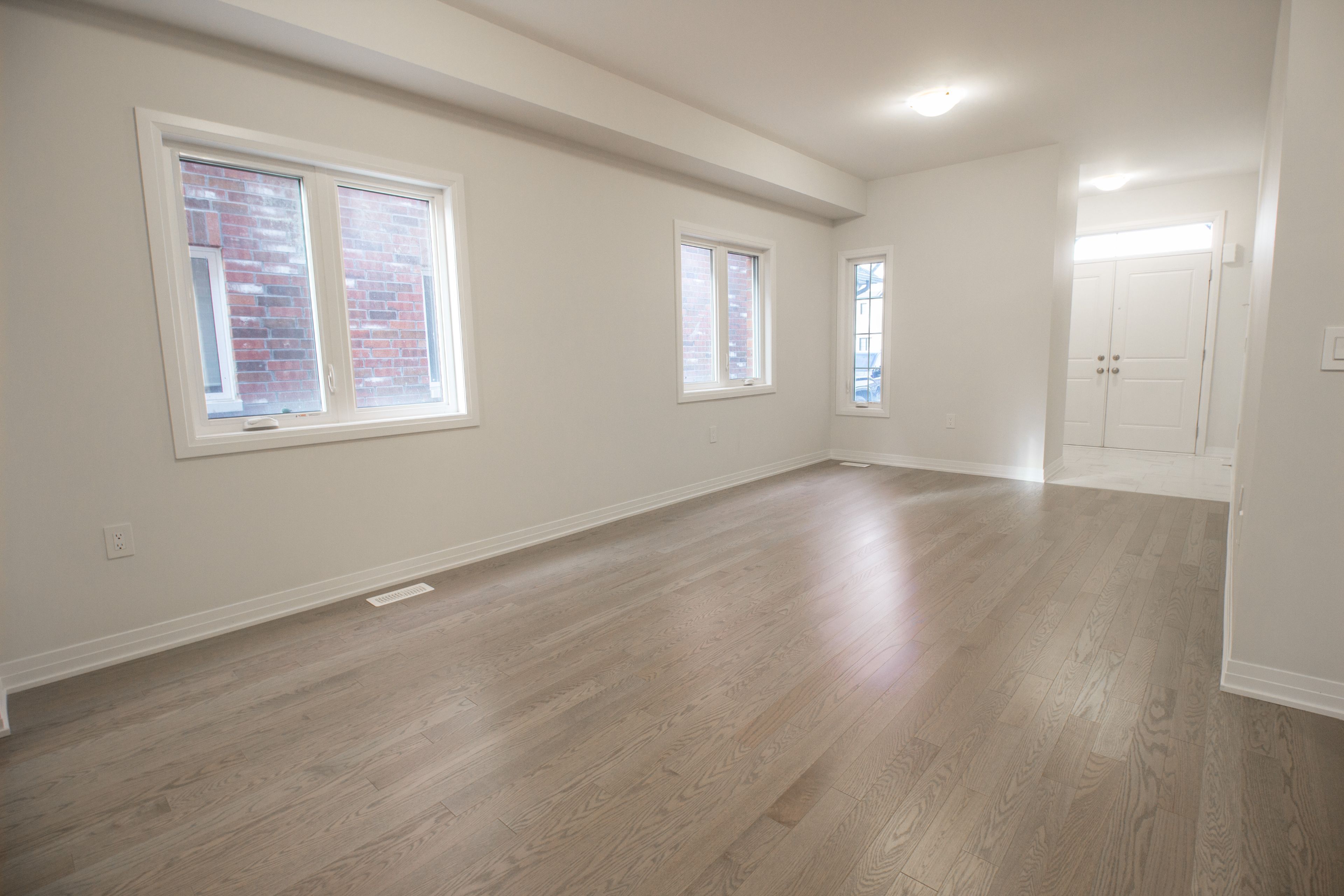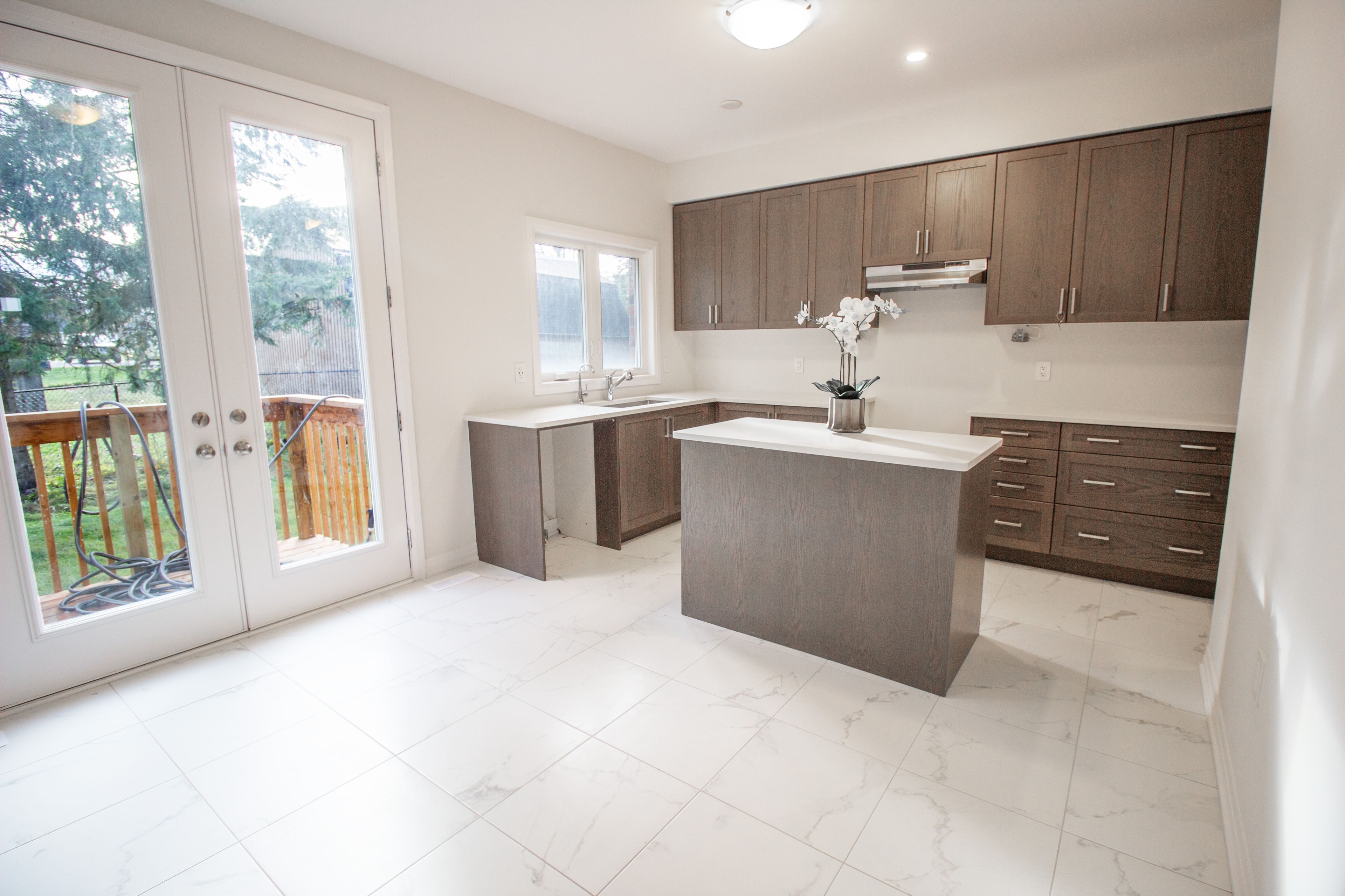 • Open-concept main floor with large windows and contemporary kitchen.