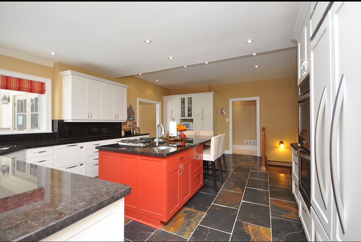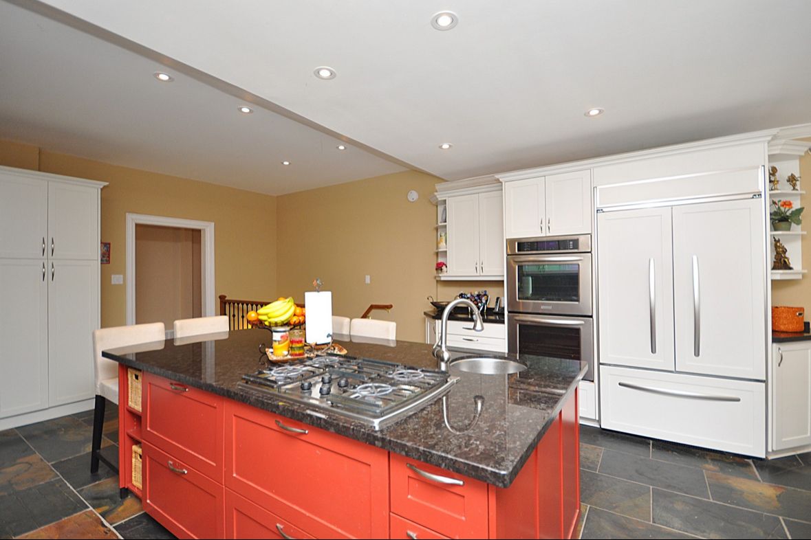 • Custom kitchen featuring granite countertops and built-in appliances.