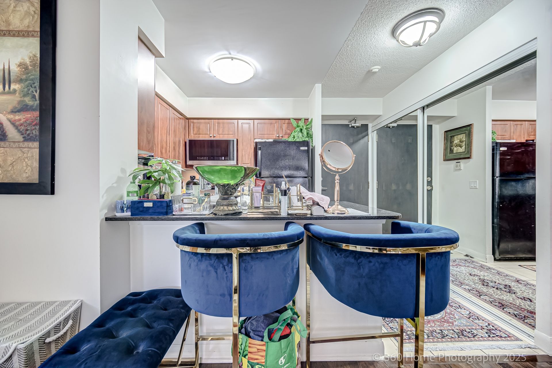 • Modern kitchen features granite counters and stainless steel appliances.