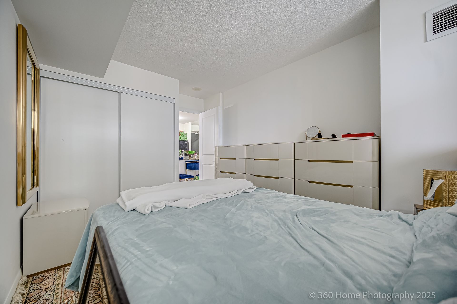 • Bright primary bedroom with corner windows offering partial lake views.