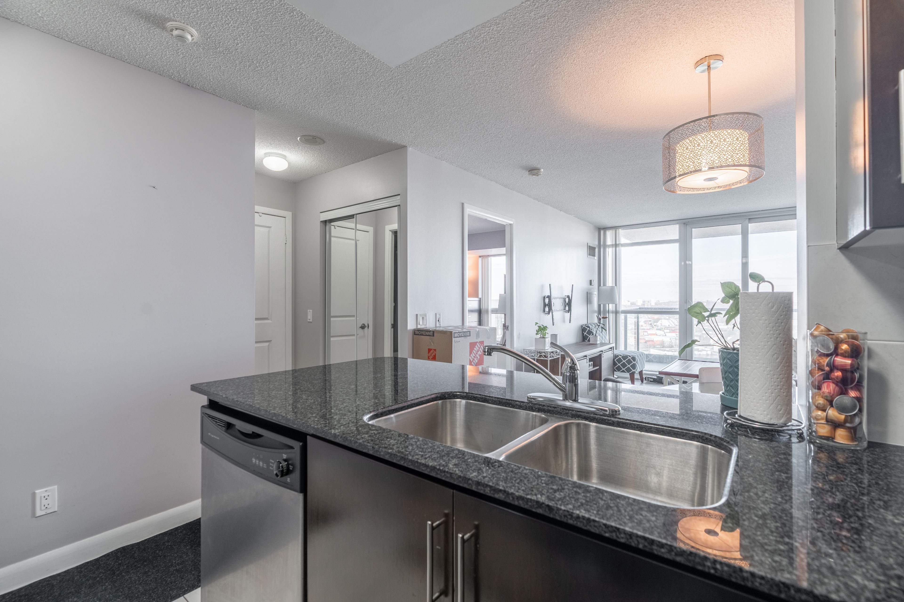 • High ceilings and modern open-concept layout create a spacious feel.