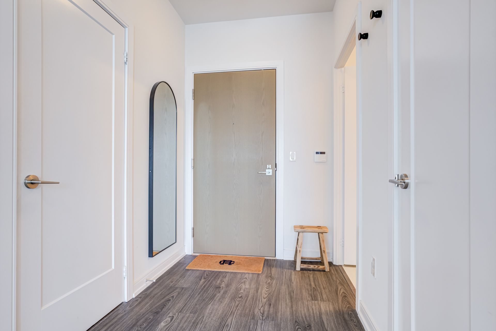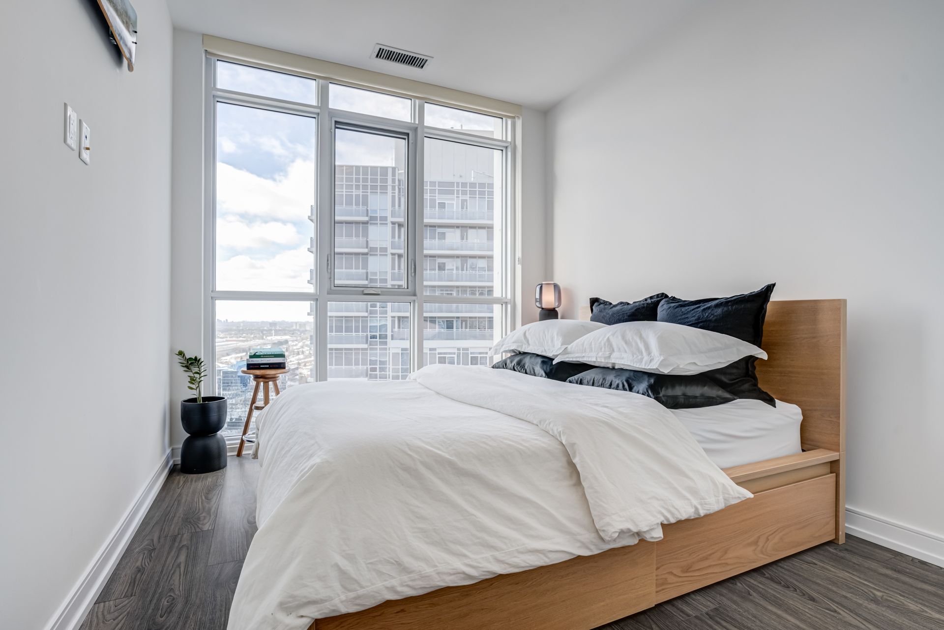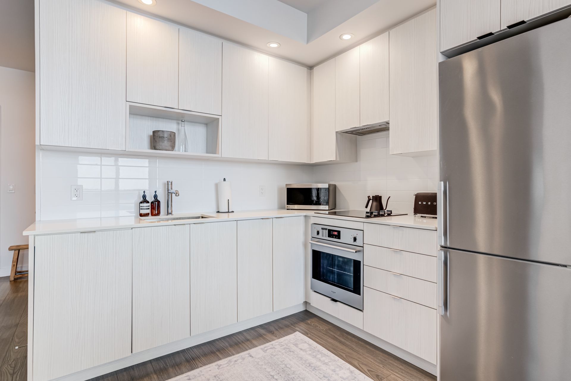 Bright penthouse unit with 9 ft ceilings and a smart, open-concept layout. Floor-to-ceiling windows bring in tons of natural light and open to a juliette balcony for fresh air and city views. Modern kitchen with integrated appliances and quartz countertops, comfortable bedroom, and a sleek bathroom. Includes a prime parking spot with a column on one side and no adjacent vehicle on the other, offering extra space and easy access. Well-managed building with great amenities, steps to ttc, parks, shopping, and quick access to the 401. Effortless, low-maintenance living in a prime location.
