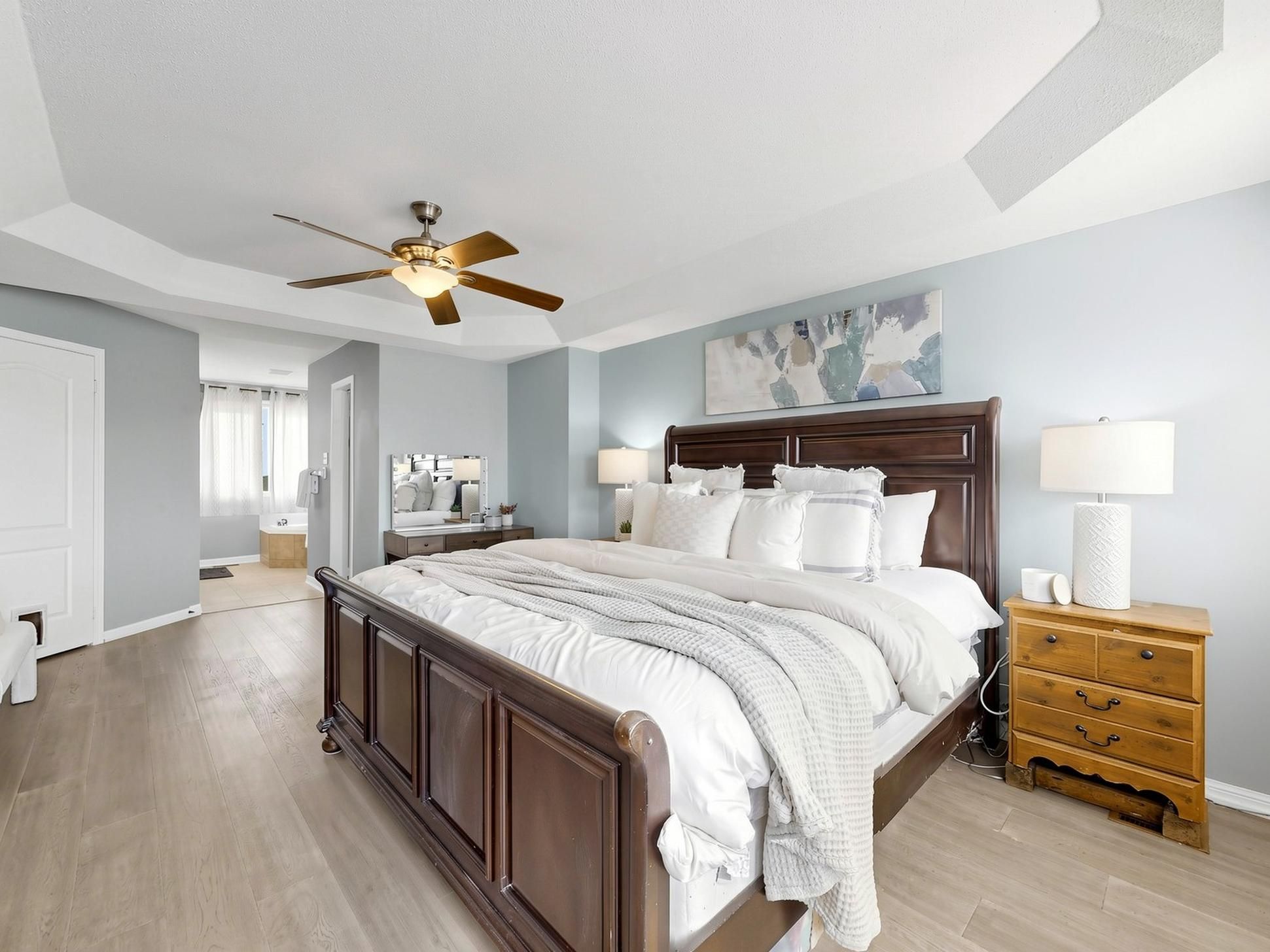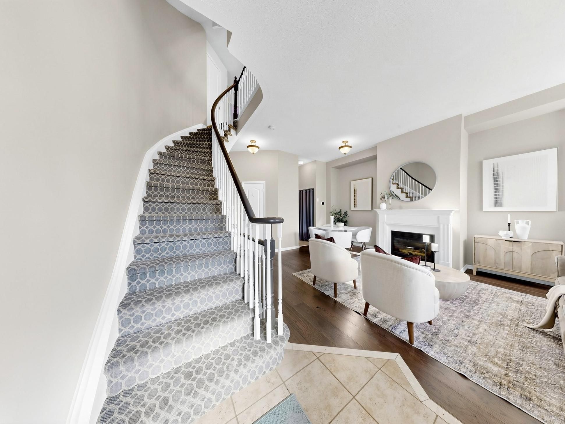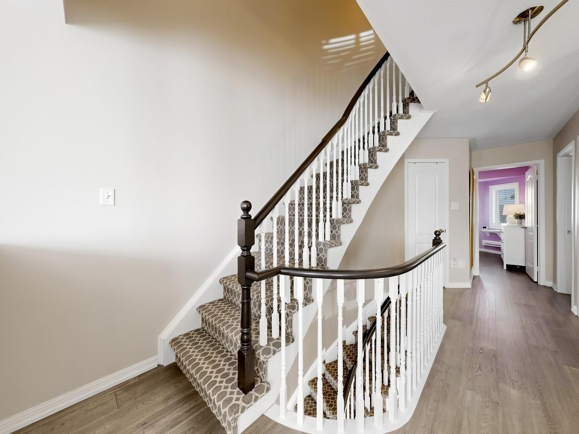 Beautiful three-storey family townhome in cornell offering 3 spacious bedrooms and 10' ceilings on the main floor. Landscaped exterior with stone steps, walkway, and enclosed front porch. Open-concept living and dining area with fireplace, engineered hardwood flooring, and large windows with california shutters. Eat-in kitchen with stainless steel appliances, pantry storage, and walkout to deck. Second floor features a family room with fireplace, two bedrooms with engineered hardwood flooring and california shutters, and a 4-piece bath. Third-floor primary retreat with coffered ceiling, california shutters, and 4-piece ensuite with separate shower and soaker tub. Finished space in the basement offers bamboo flooring and pot lights. Backyard with deck, garden space, stone walkway to detached garage, and additional parking pad. Walking distance to schools, cornell community centre & library, markham stouffville hospital, and cornell dog park. Easy access to cornell bus terminal and highway 407.