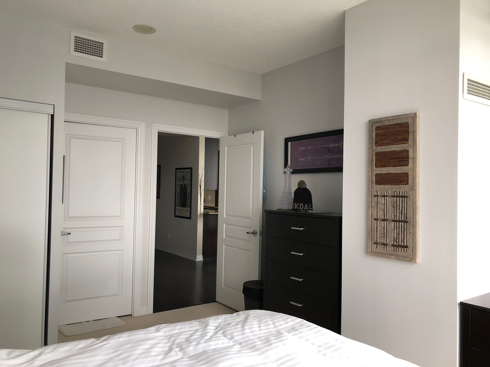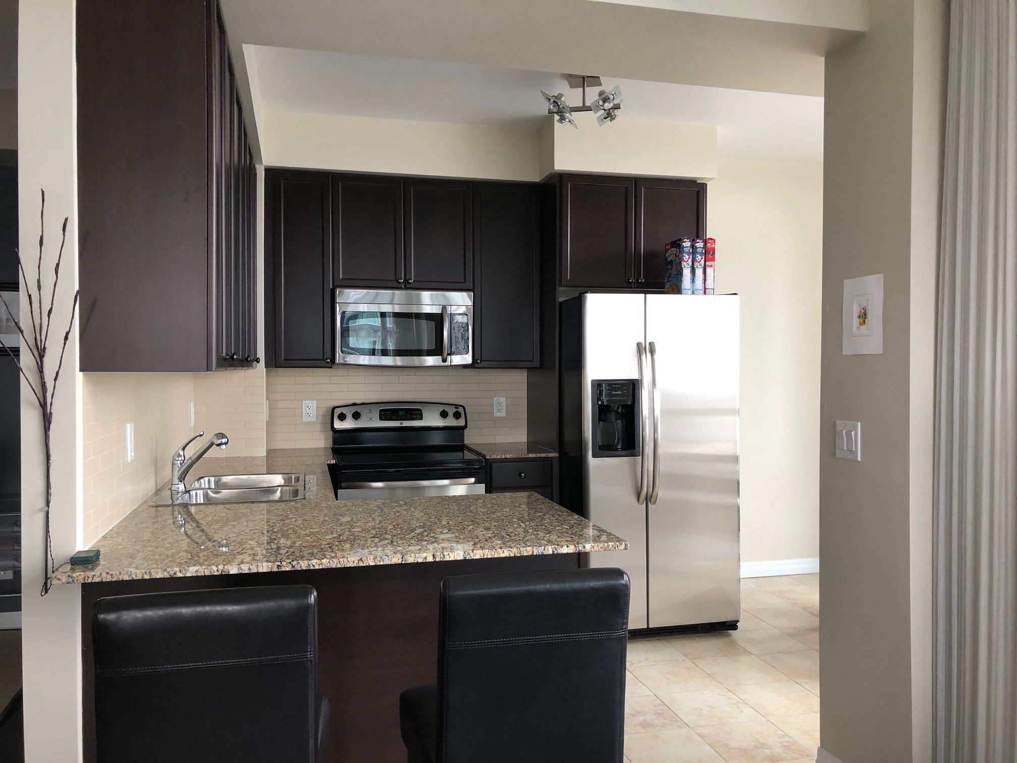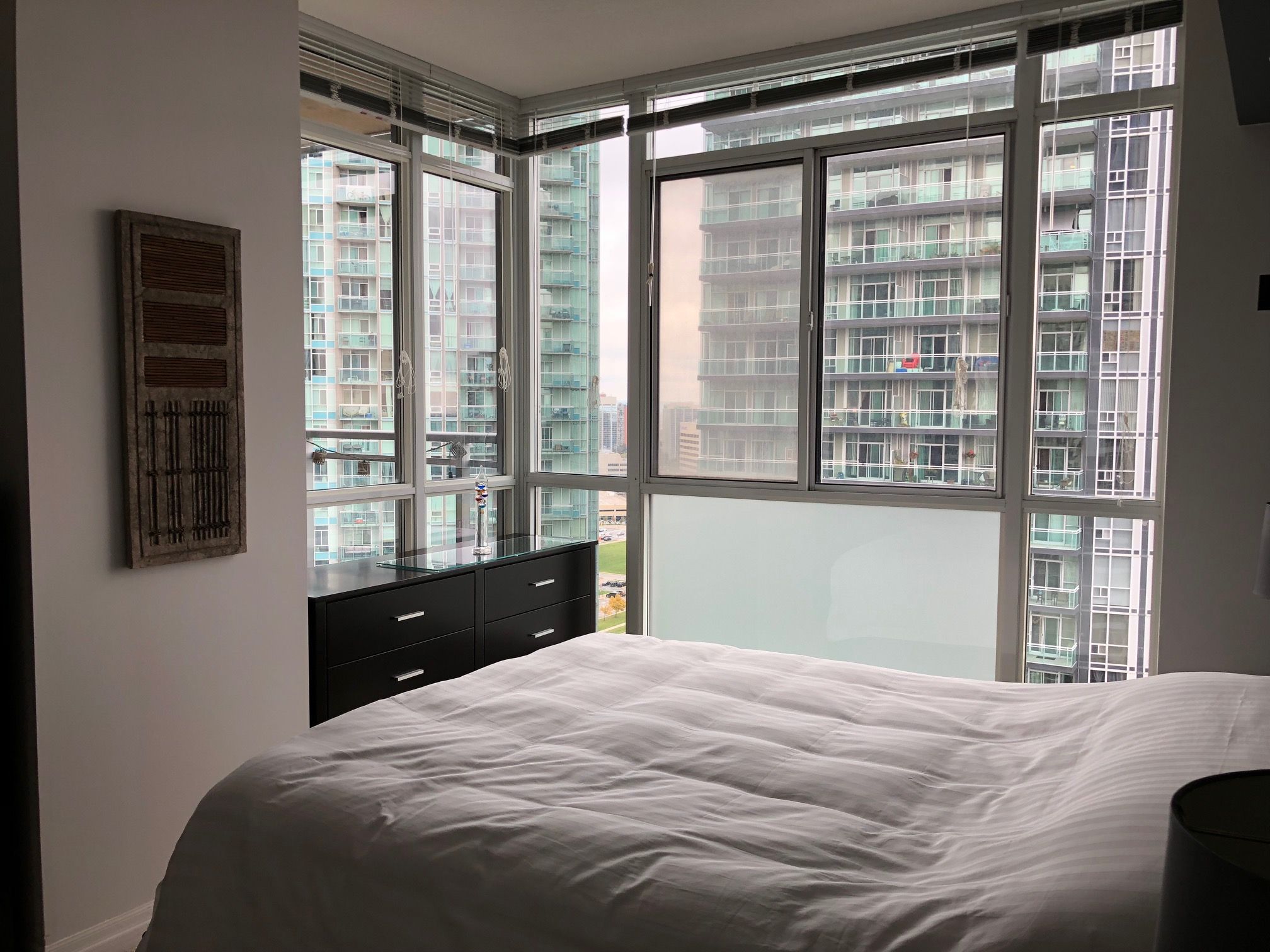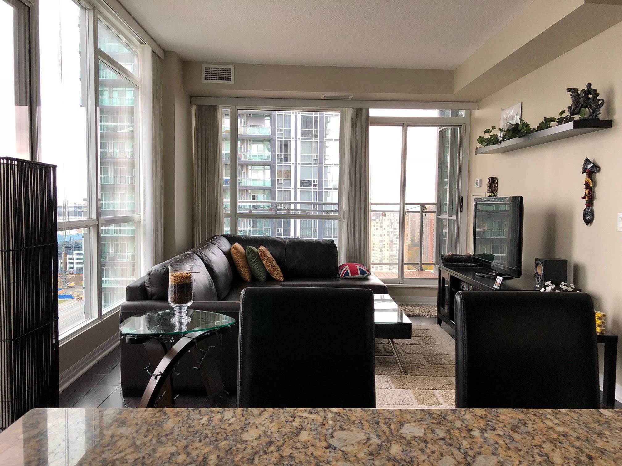 Fantastic modern 1 + den suite at 856 sq. Ft., featuring a host of designer upgrades. Wrap aroundfloor to ceiling windows. Showcased by custom blinds and sheers. 9 foot high ceilings with fresh neutral paint throughout. Gourmet kitchen features mohogany cabinetry, speckled granite countertops, windows for lots of natural light.