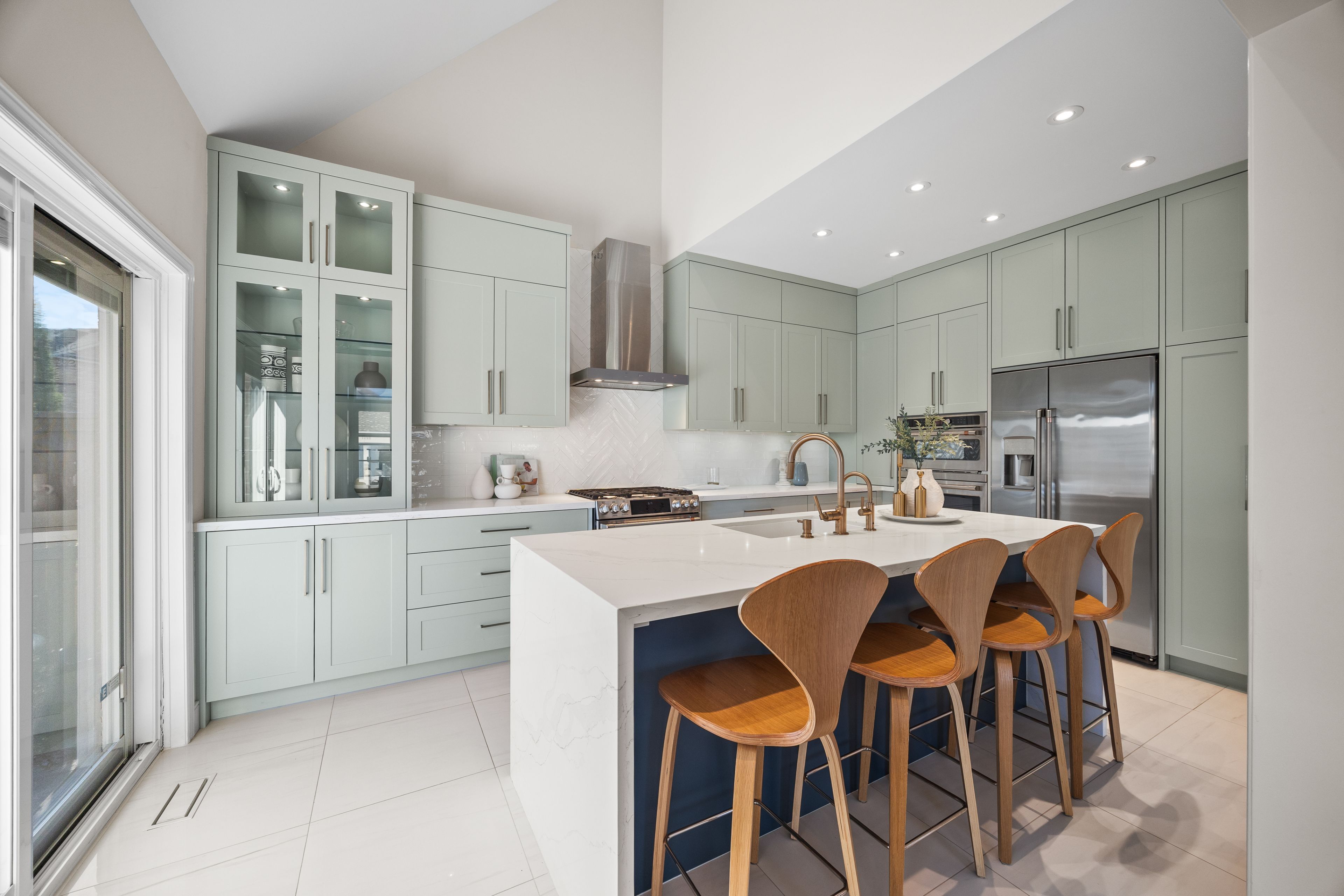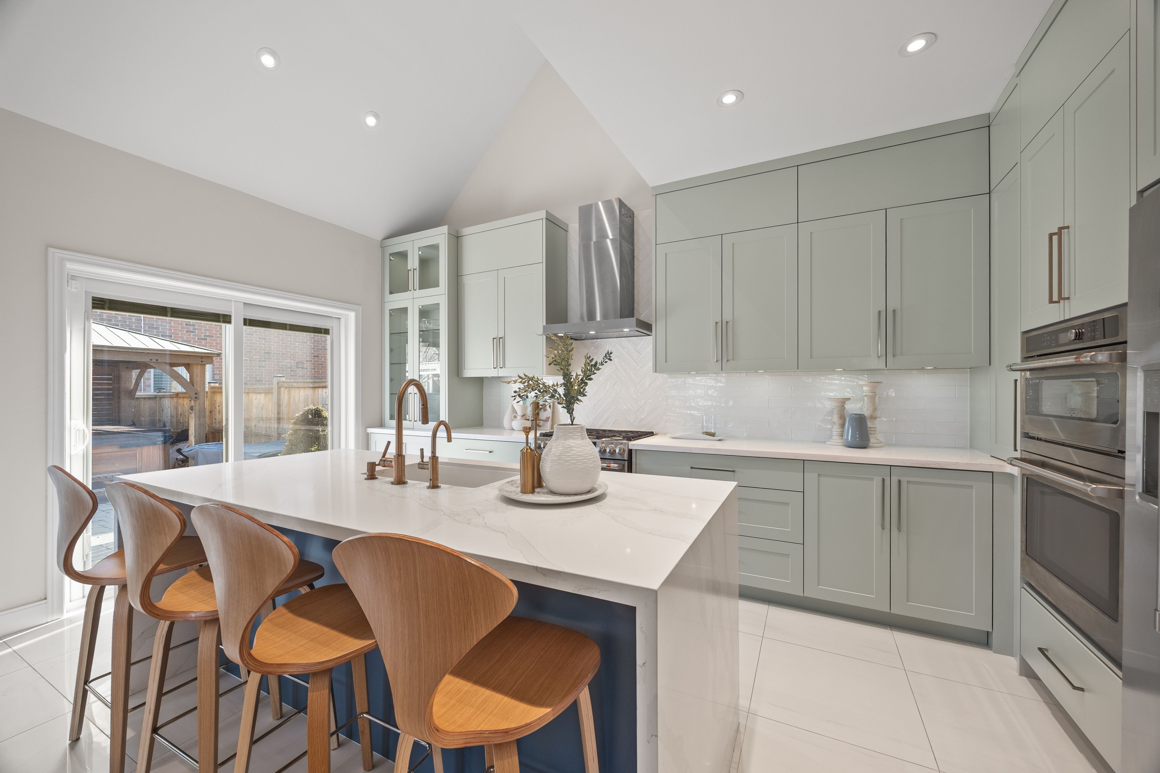 • Open concept kitchen with quartz countertops and custom cabinetry.