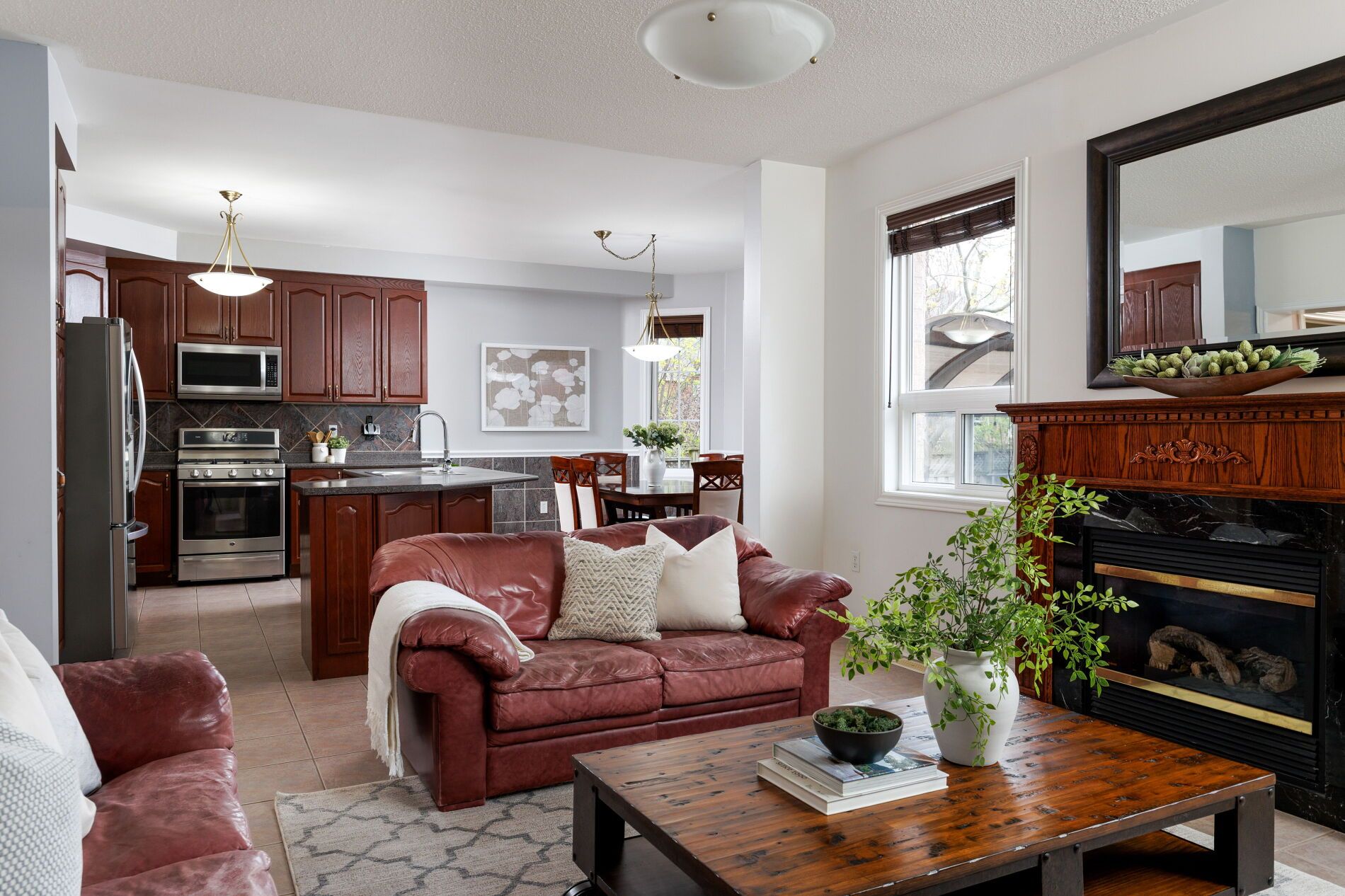 • Open-concept living space with refined finishes and cozy gas fireplace.