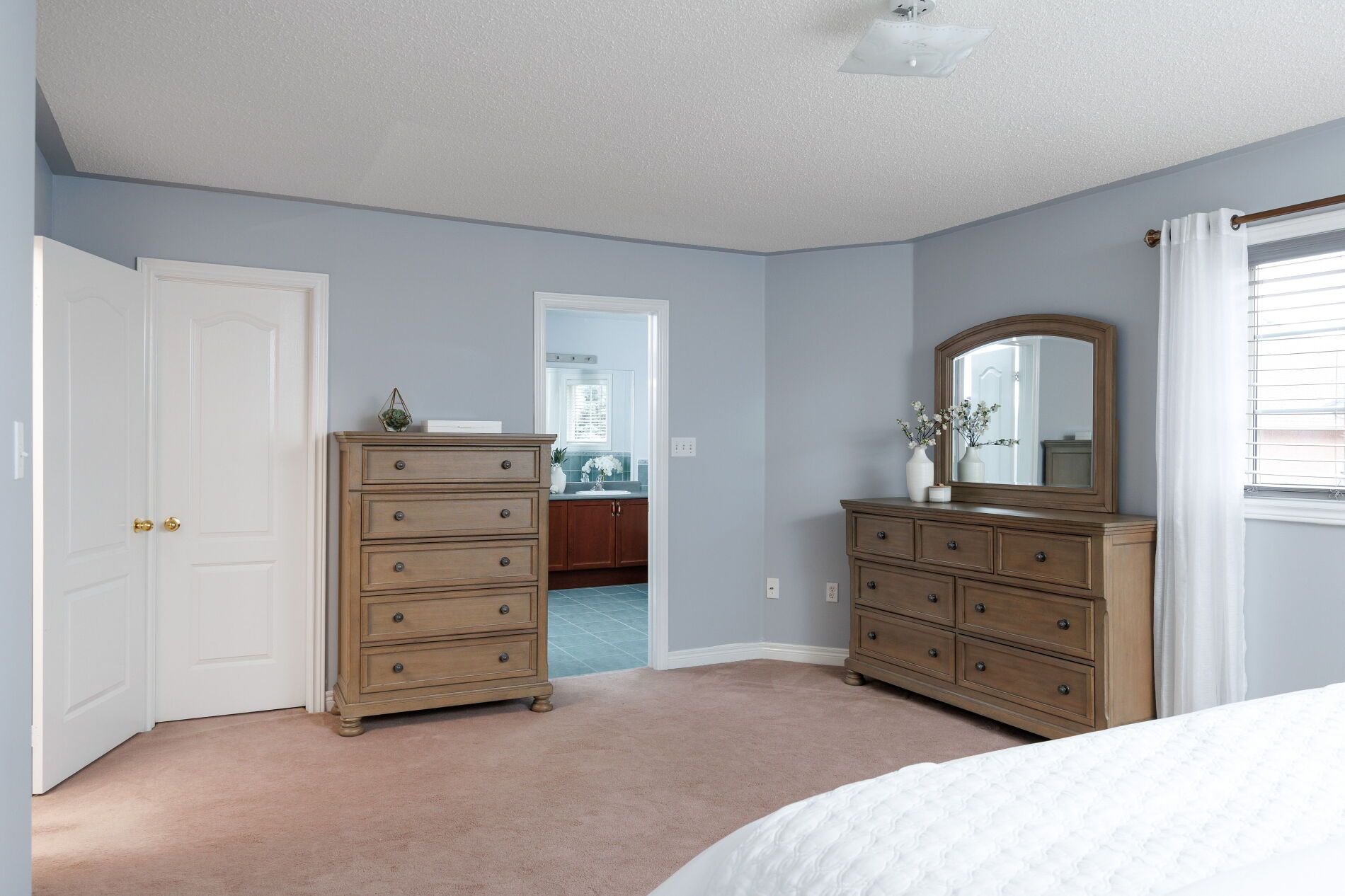 Beautifully presented 5-bedroom, 4-bathroom national home in oakville's sought-after westmount community, renowned for its parks, scenic trails, top-rated schools, and proximity to oakville trafalgar memorial hospital. Easy access to shopping, restaurants, recreation centres, and major commuter routes, including the qew and 407 etr. Showcasing exceptional curb appeal, the home features a triple-wide hosta lined, 6 car patterned concrete driveway, manicured front gardens with ornamental trees and blue spruce, and patterned concrete walkways leading to a private, fully fenced backyard retreat with lush landscaping, a garden shed, and a two-tier patio with a water feature-perfect for outdoor entertaining. Inside, refined finishes include 9-foot ceilings, hardwood flooring, wainscotting, and a striking, solid oak staircase. The main level offers an open-concept living and formal dining room with tray ceiling and decorative column, a private den with french doors, and a spacious eat-in kitchen with chestnut-stained cabinetry, a custom island with breakfast bar, stainless steel appliances including a gas range, and a bright breakfast area with walkout to the patio. The adjoining family room features a cozy gas fireplace and direct sightlines to the kitchen. A powder room and sunken laundry with inside entry to the double garage complete the main level. The mid-level boasts a private fifth bedroom suite with 11-foot ceilings, a bay window, a walk-in closet, and a 4-piece ensuite-ideal for guests or in-laws. Upstairs offers four generous bedrooms and two full baths, including a spacious primary retreat with a luxurious 5-piece ensuite with whirlpool tub and separate shower. Additional highlights include a cold room and bathroom rough-in in the basement, plus updated roof shingles and furnace (2017/18)-an exceptional family home in a prime oakville location.