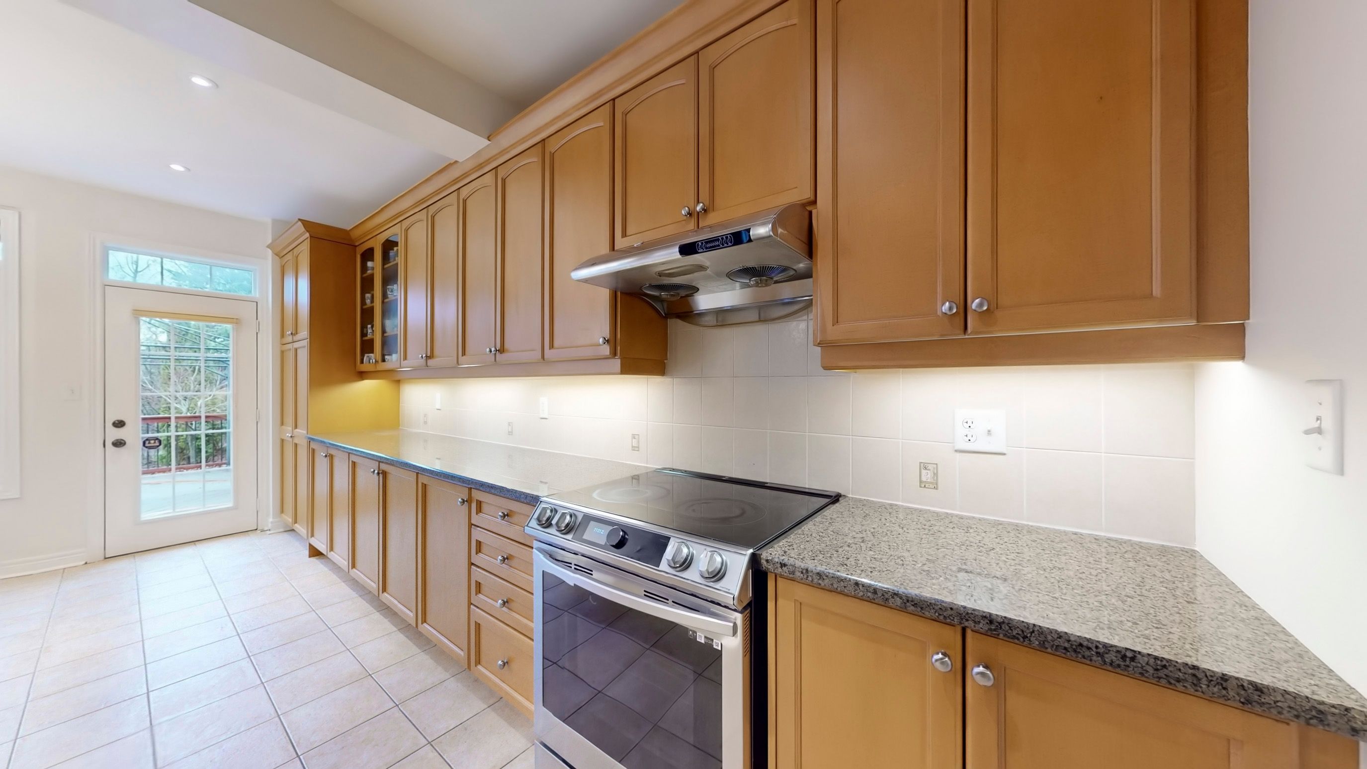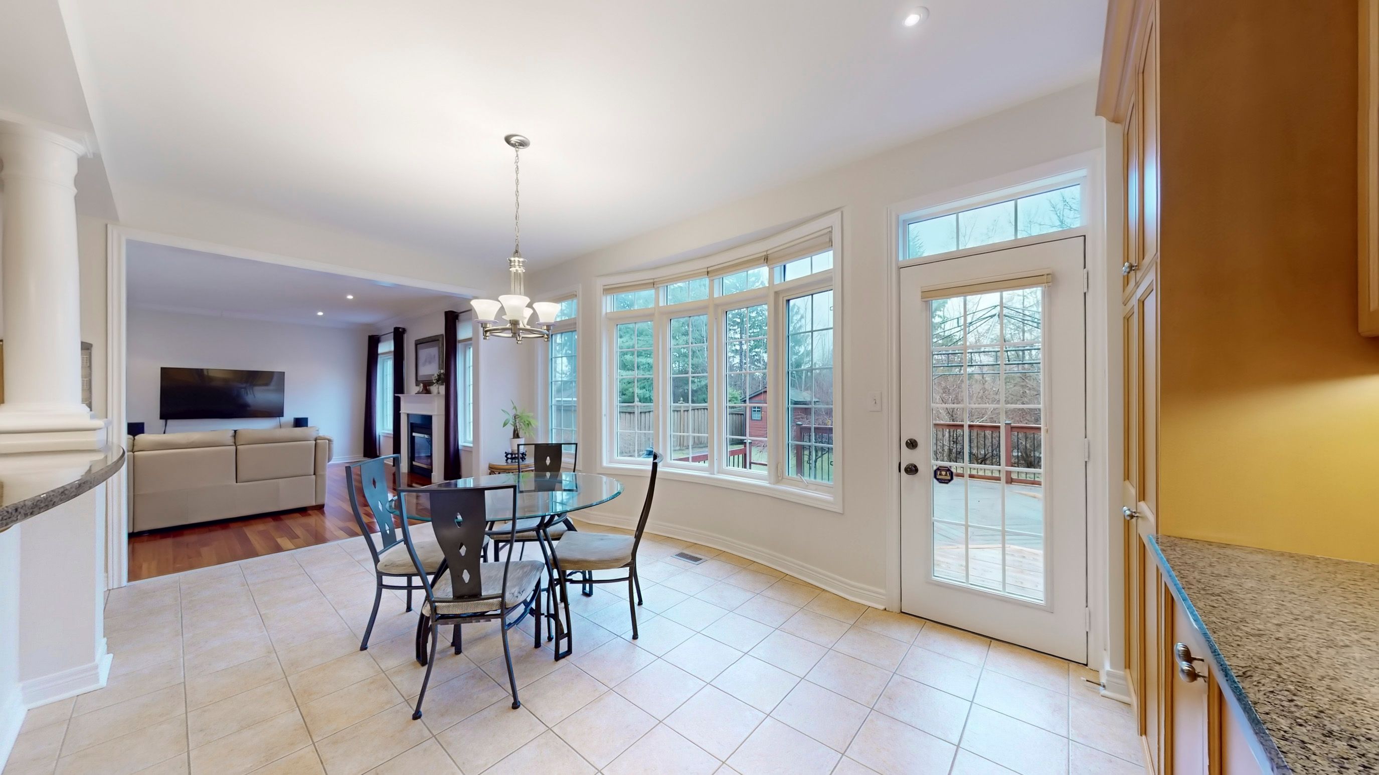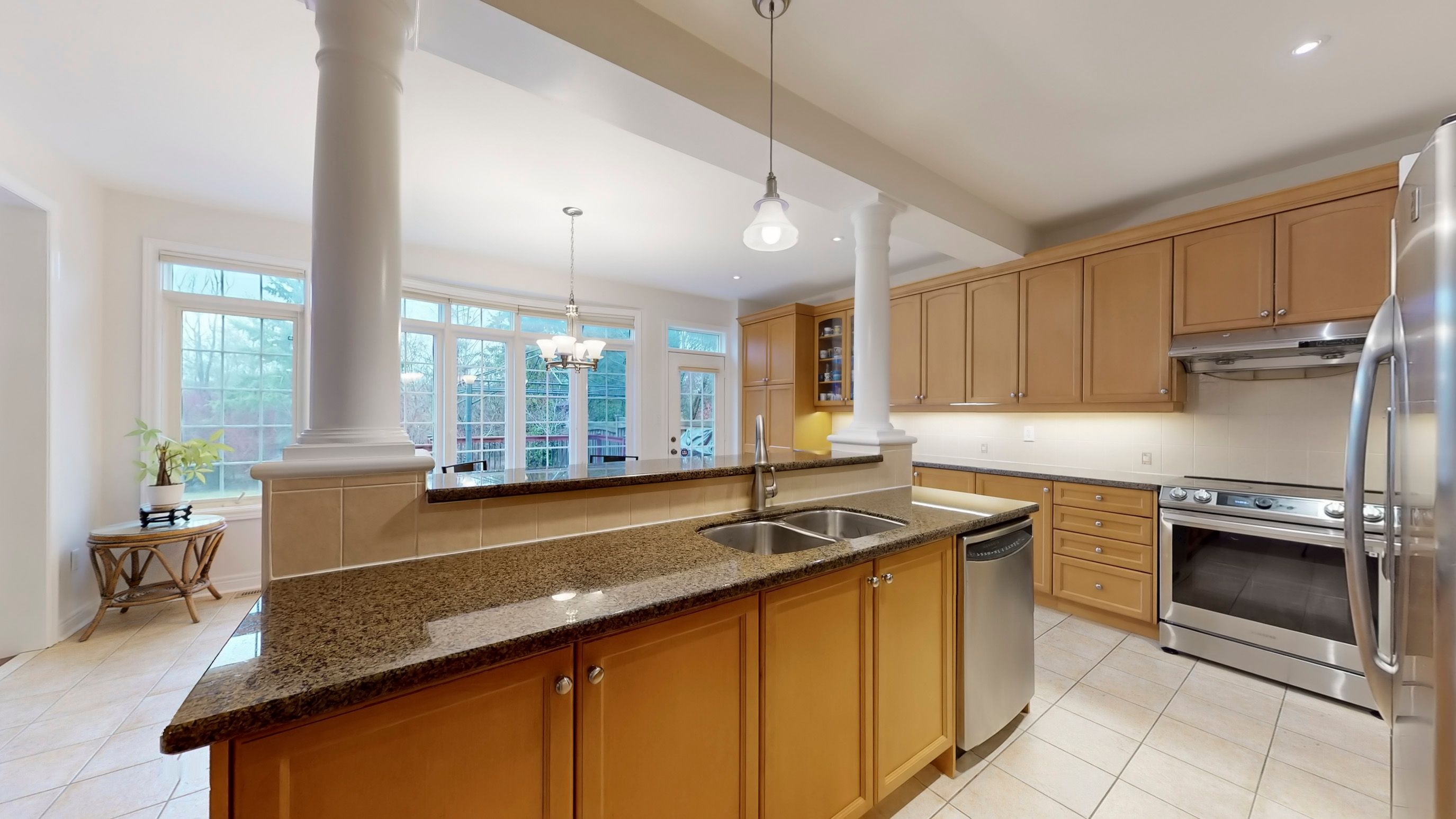 • Open-concept kitchen with granite counters and breakfast bar.