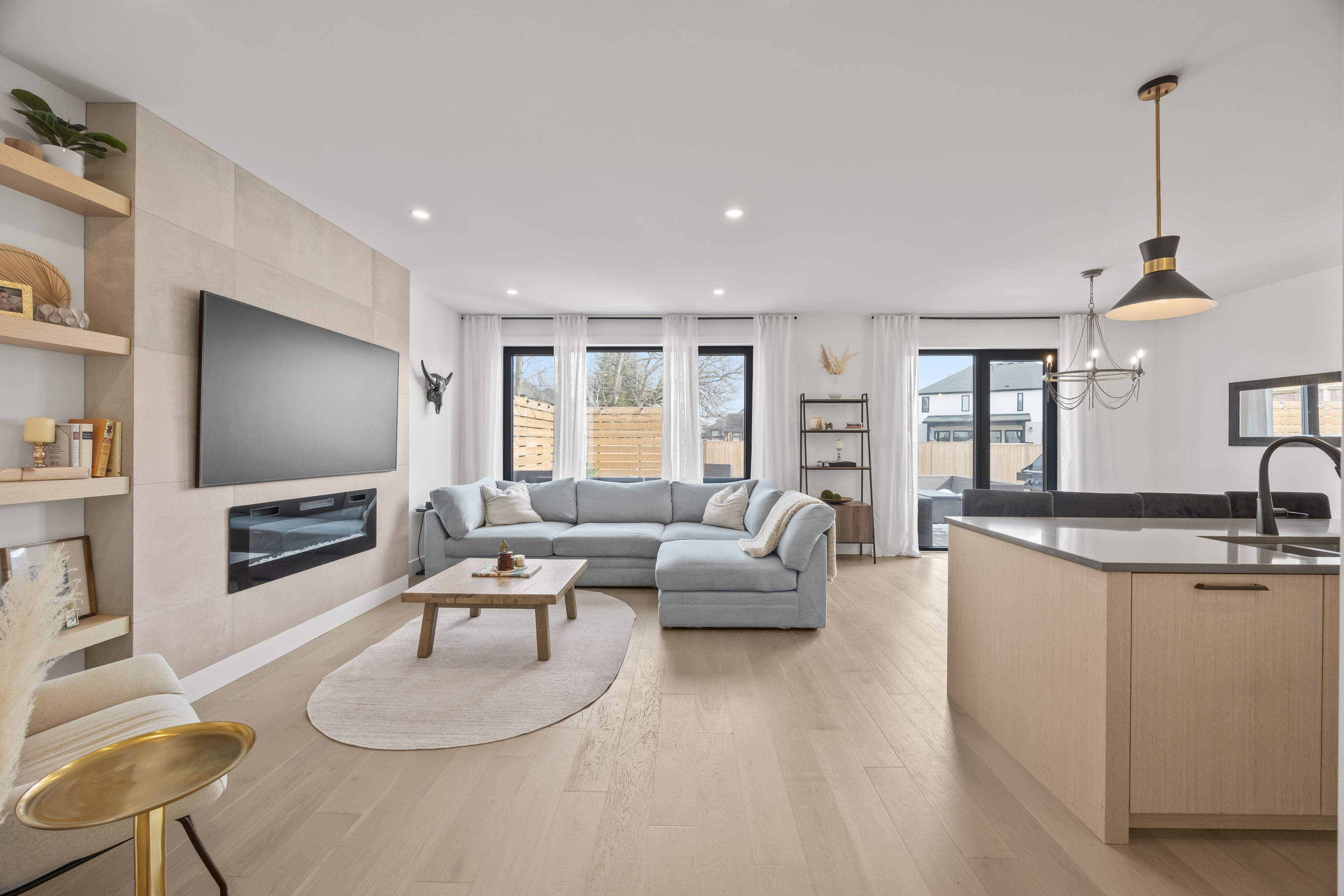 • Upgraded kitchen opens to living and dining space with electric fireplace.
