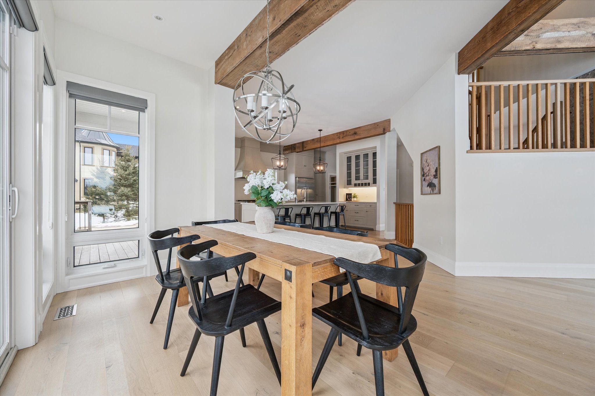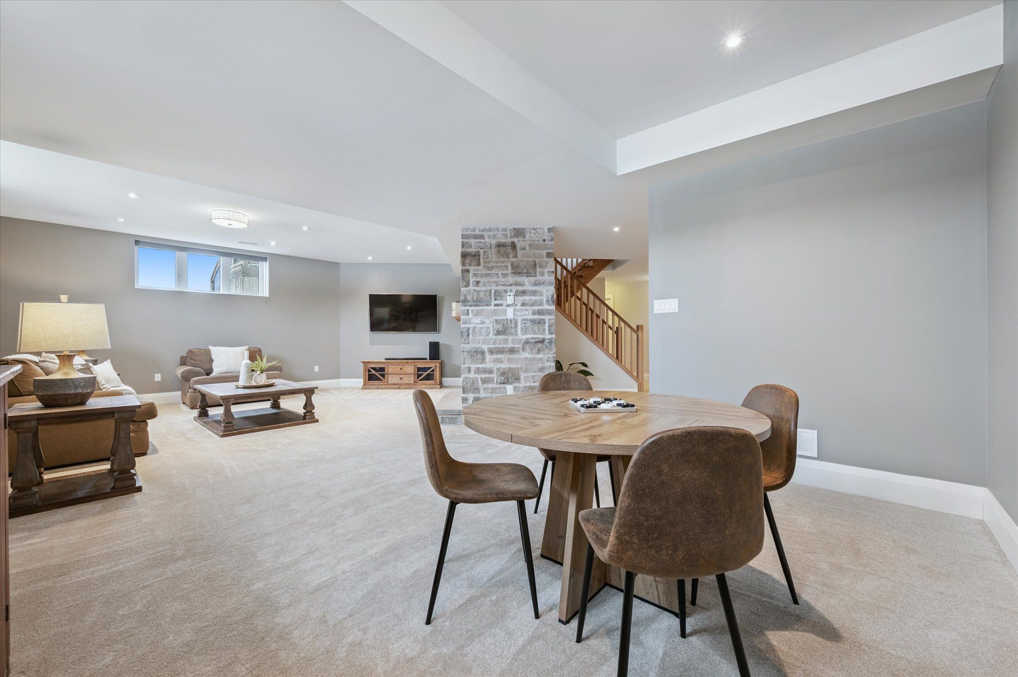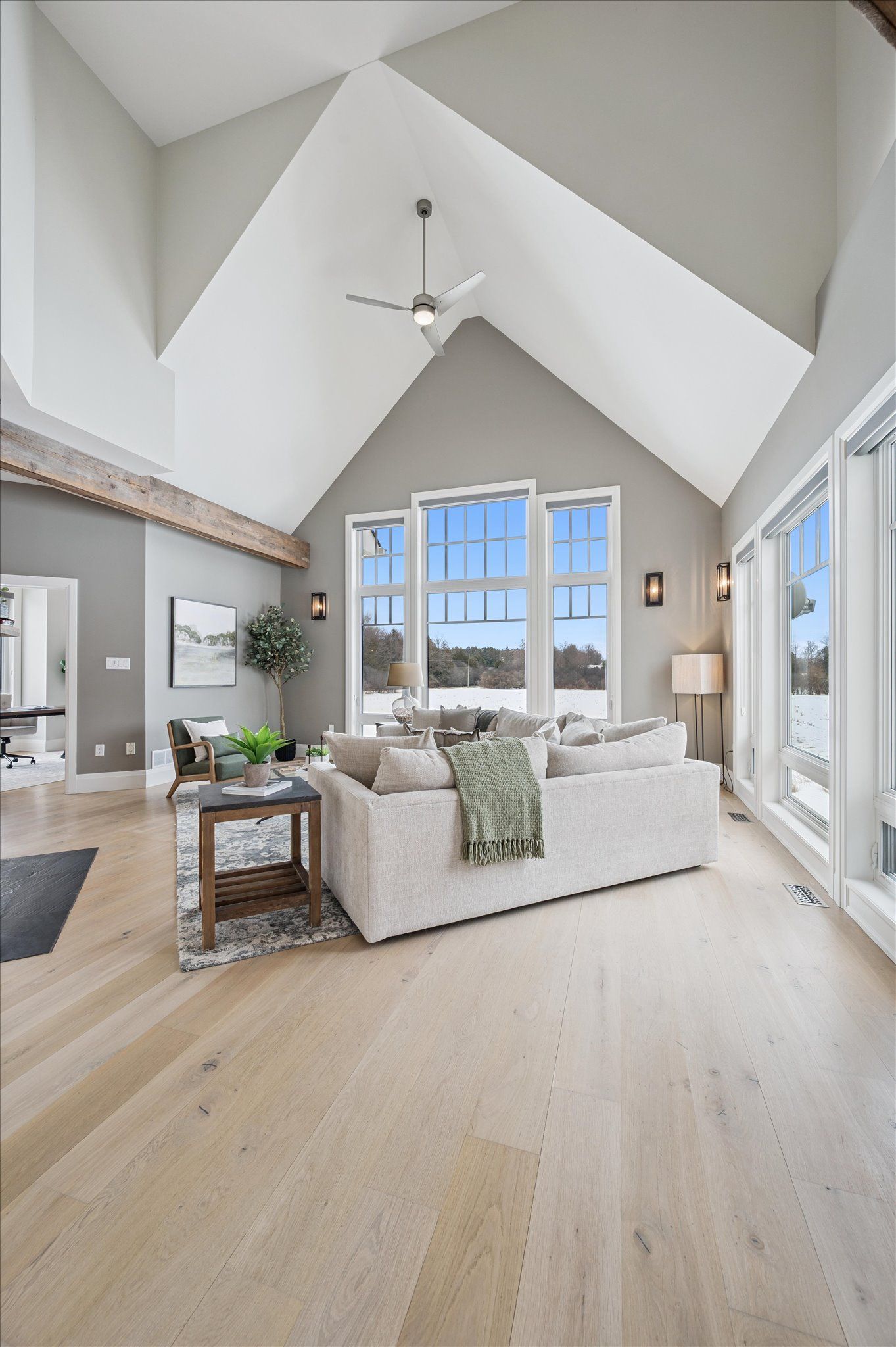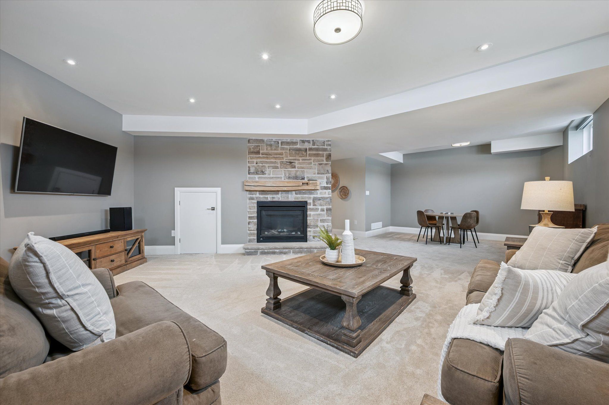 • Great room with two-storey ceiling, large windows, and stunning wood-burning fireplace.