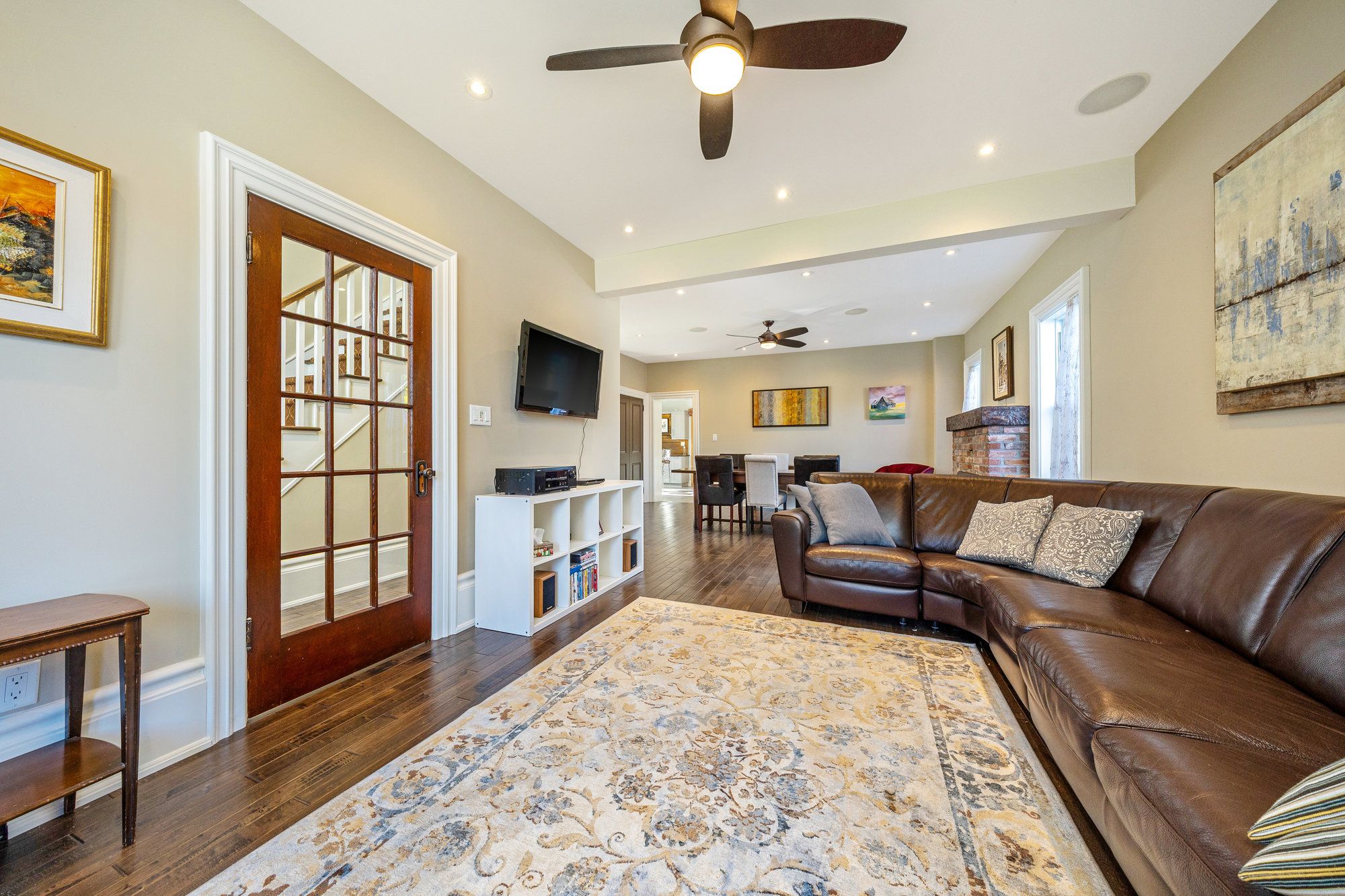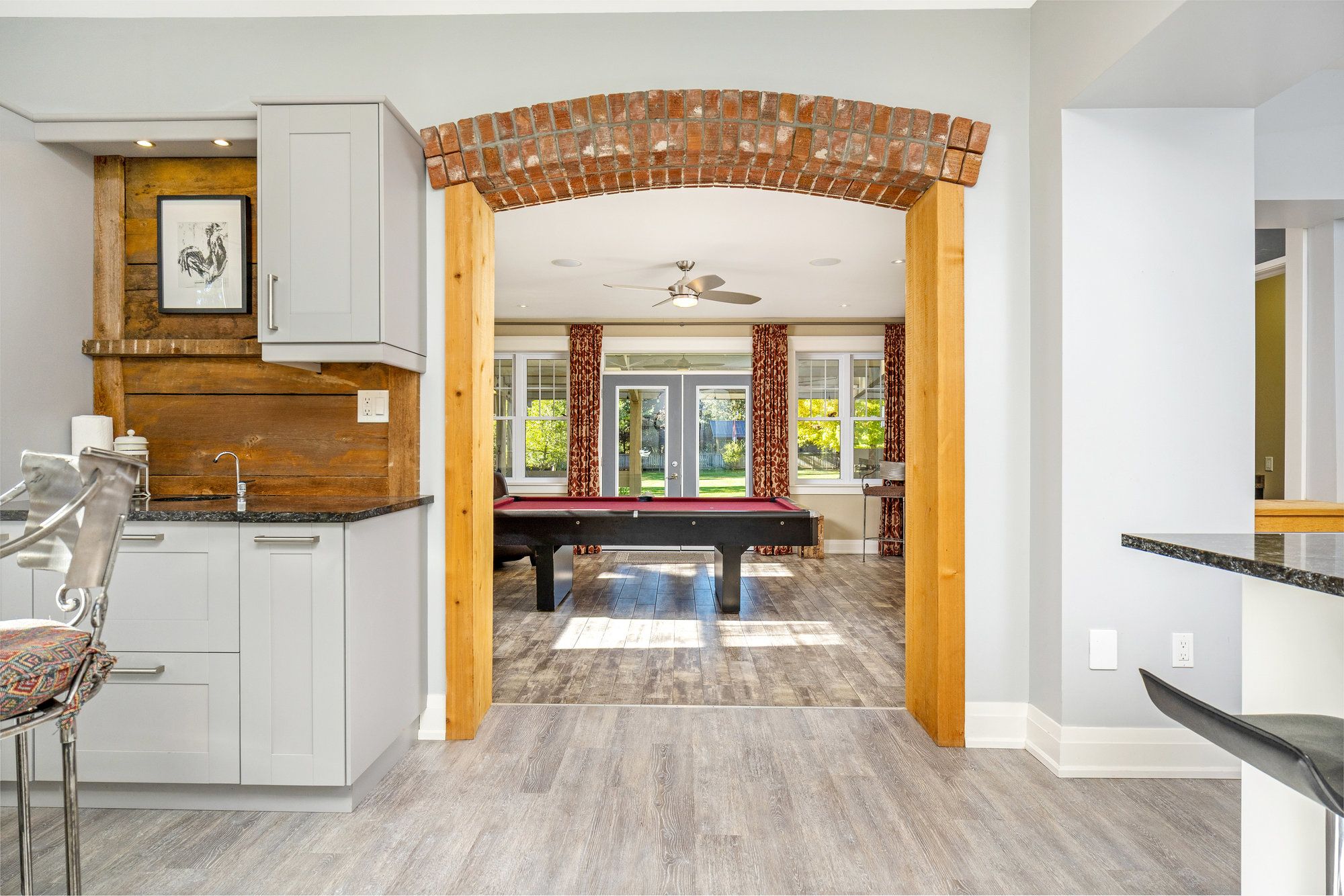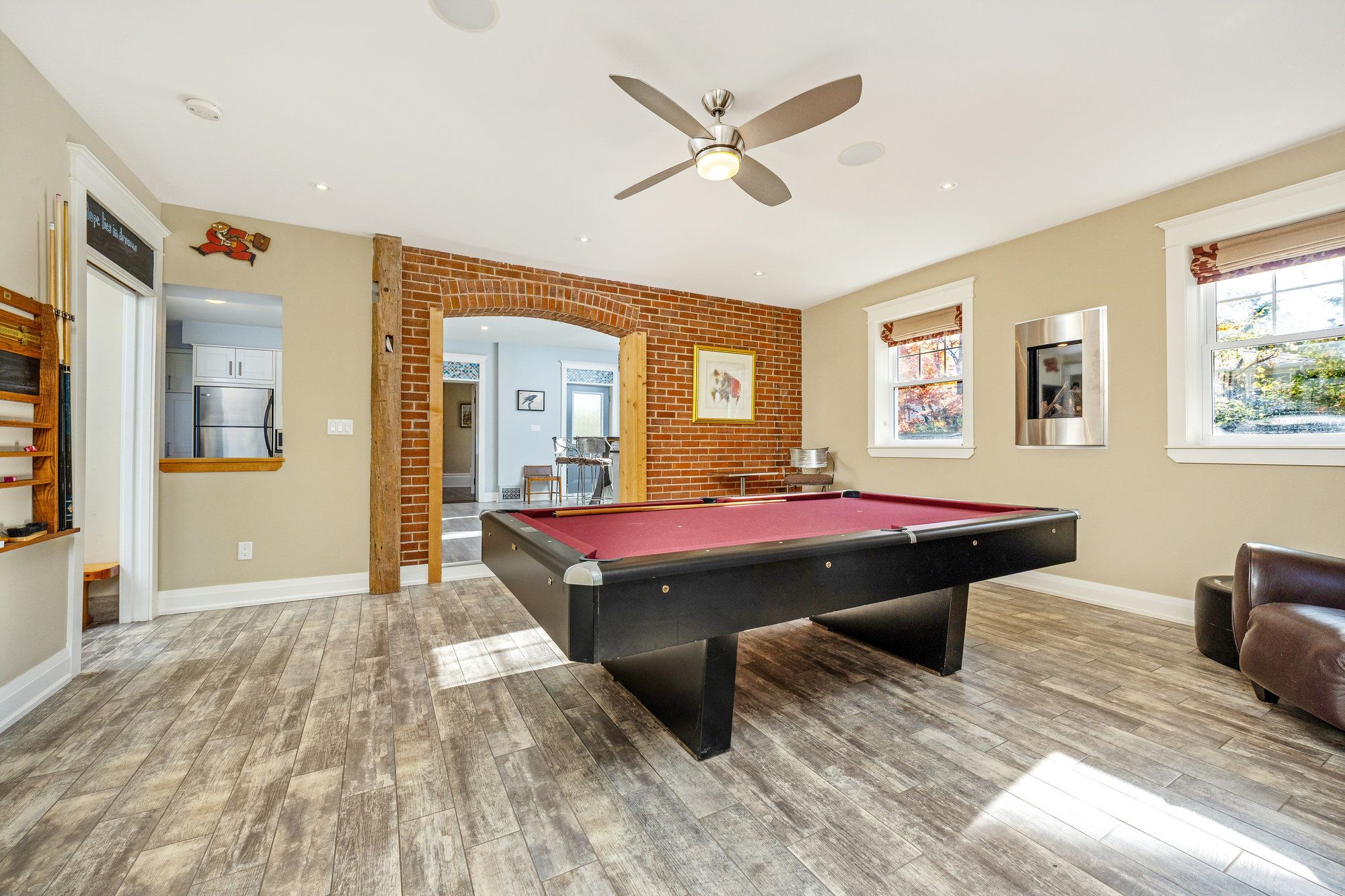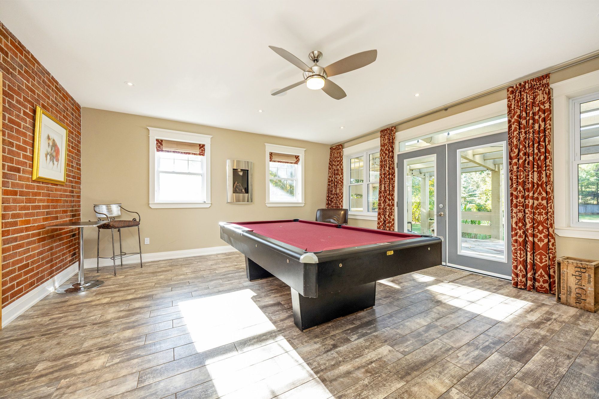 • Bright family room with exposed brick, heated floors, and access to a covered patio.