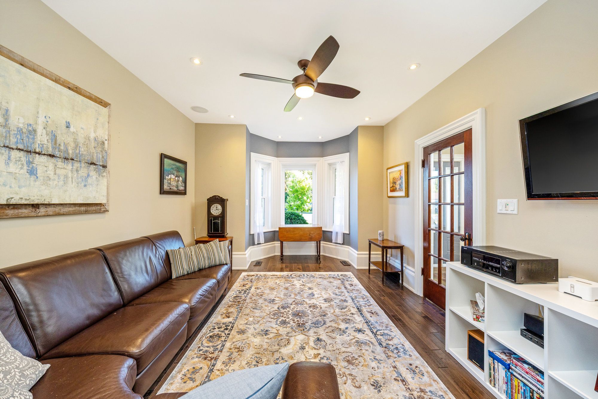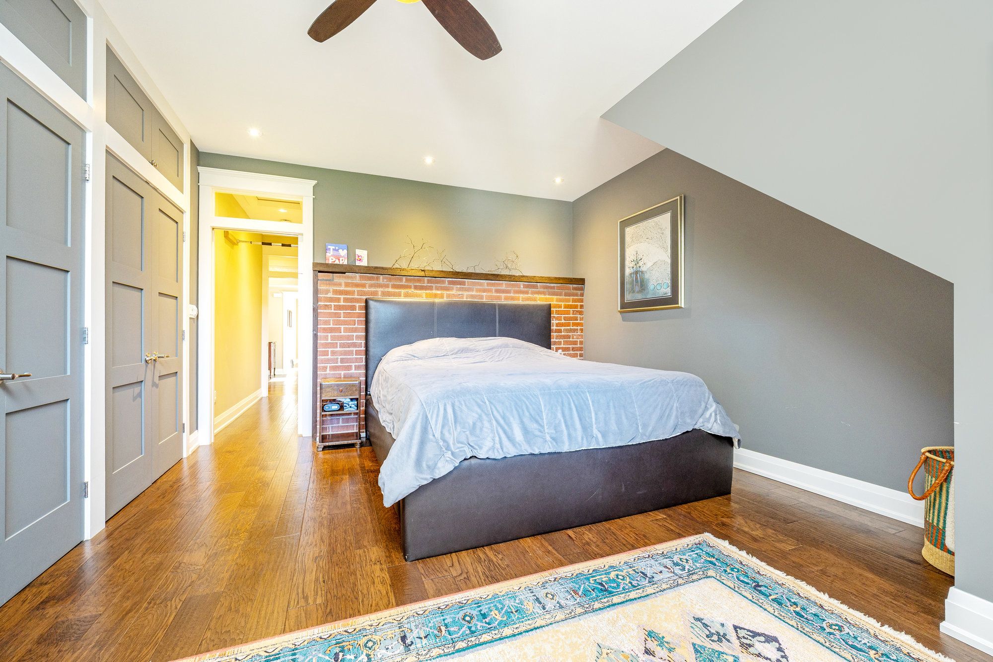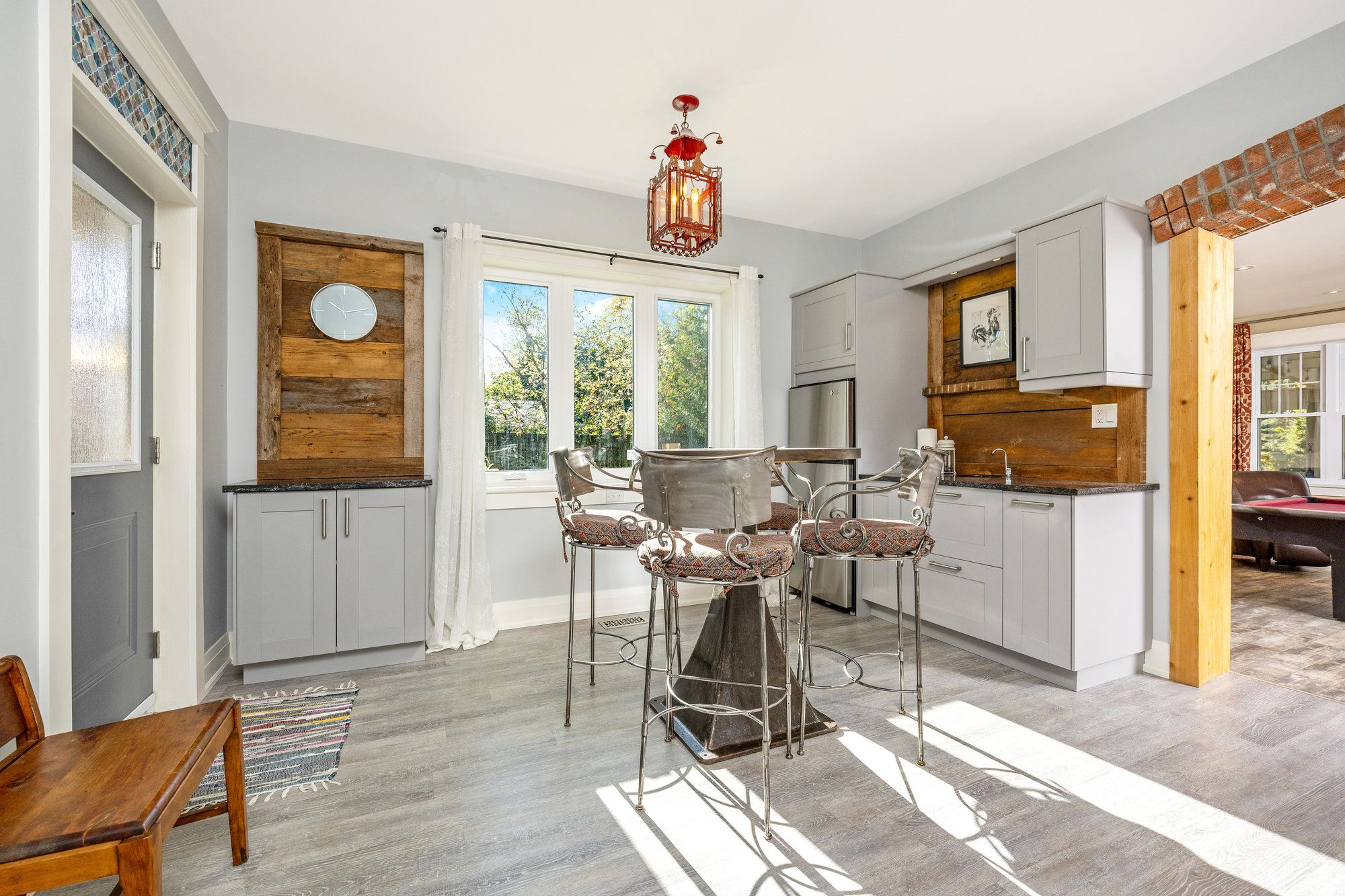 • Bright family room with exposed brick, heated floors, and access to a covered patio.