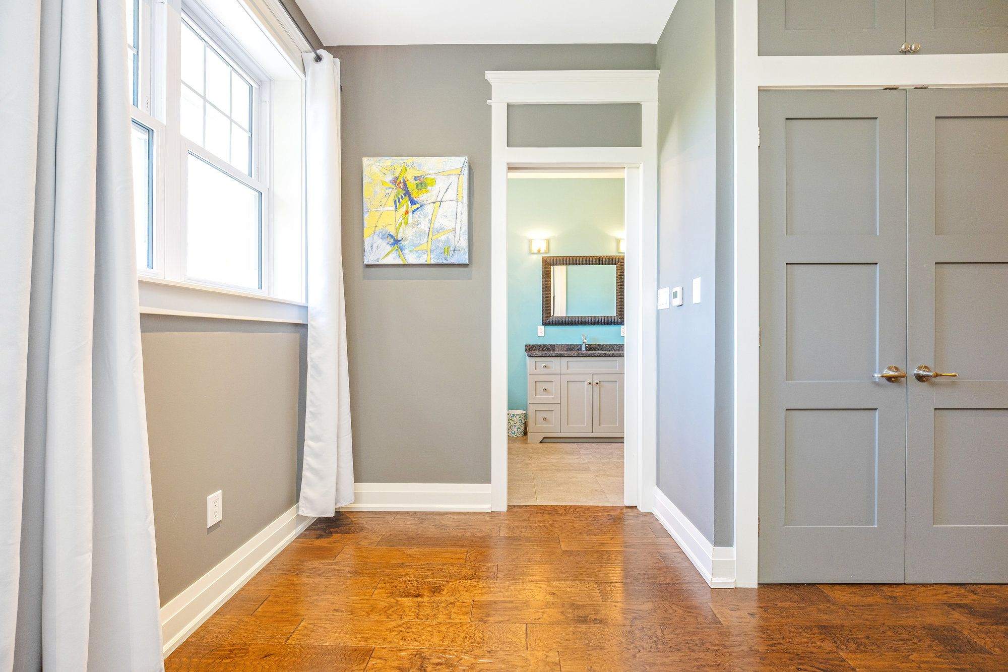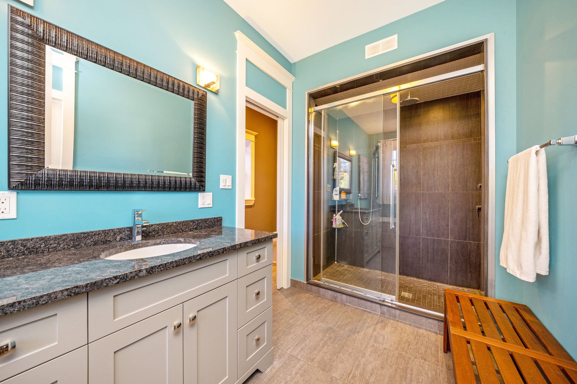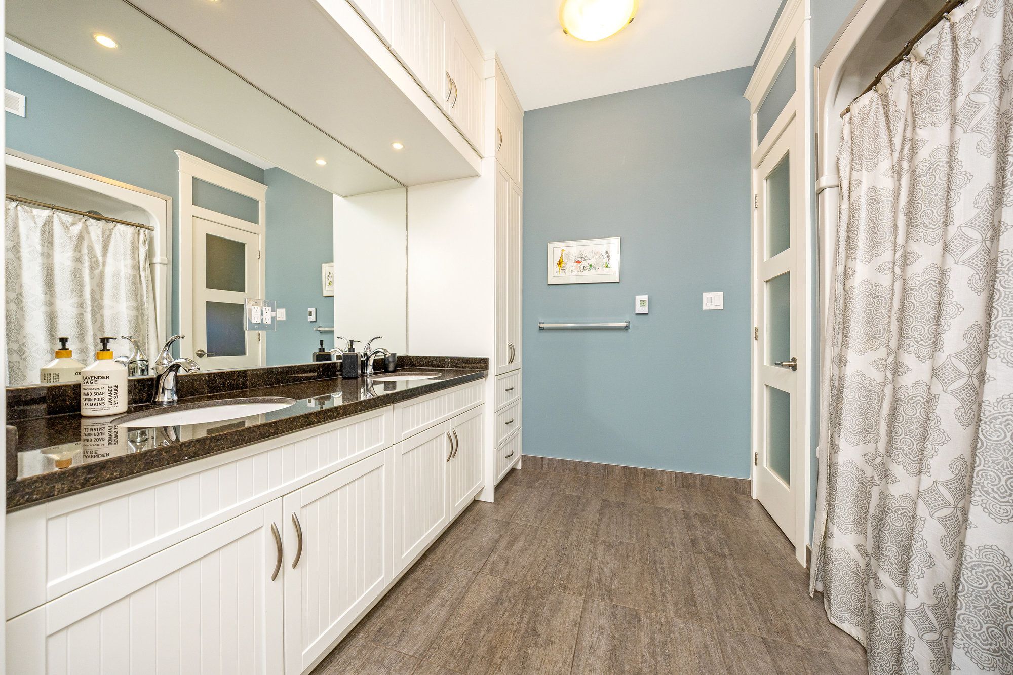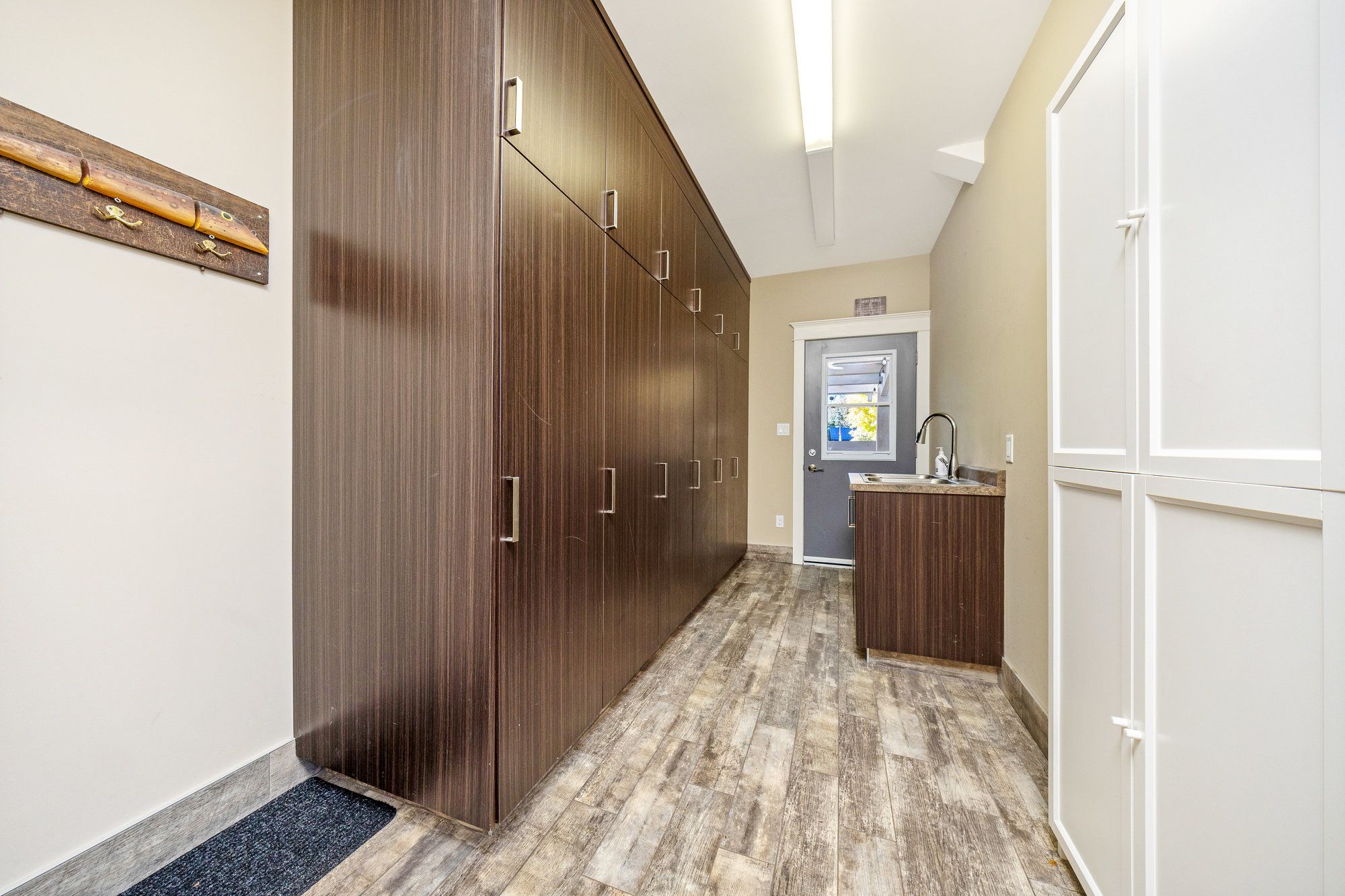 • Bright family room with exposed brick, heated floors, and access to a covered patio.