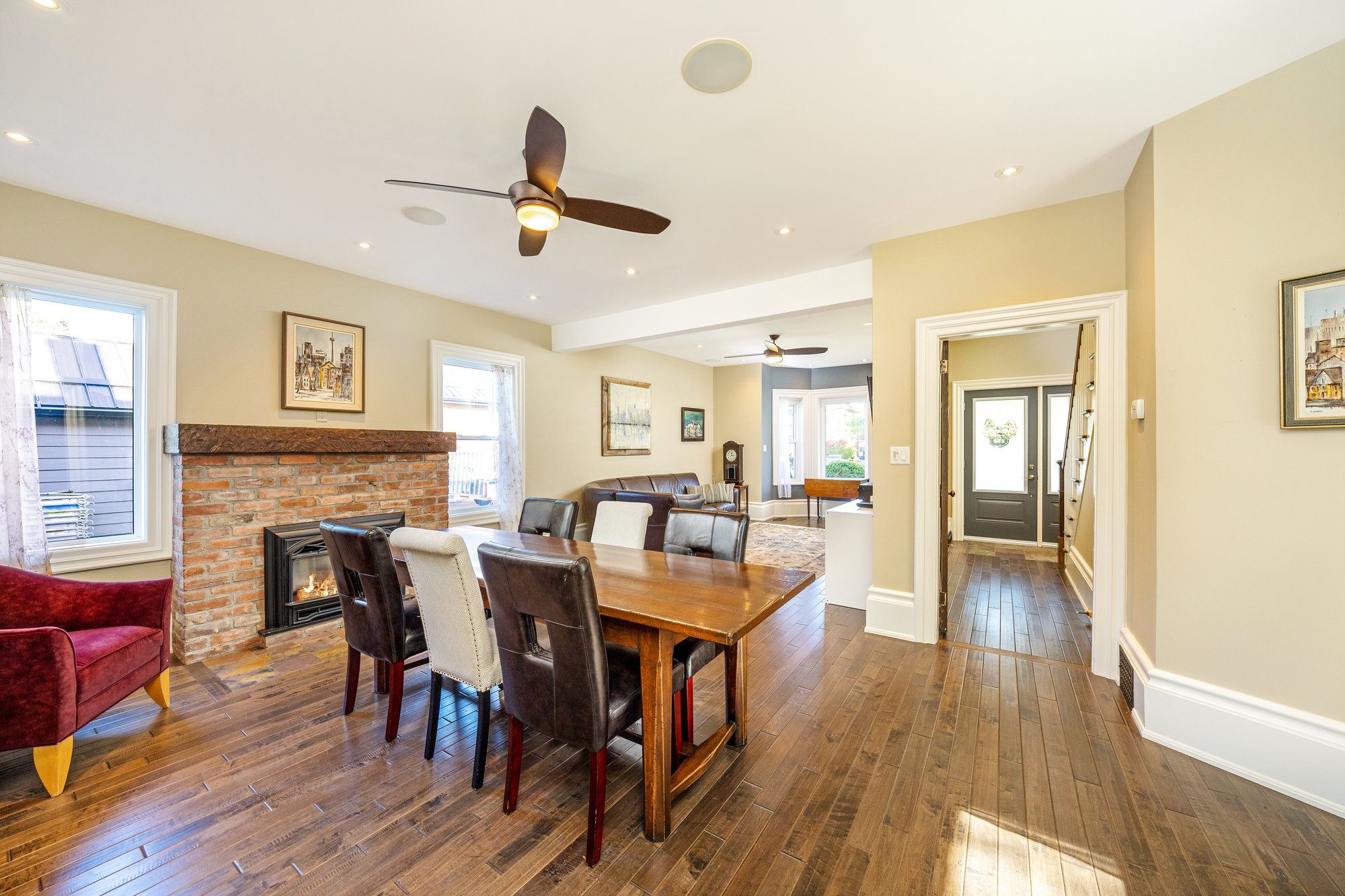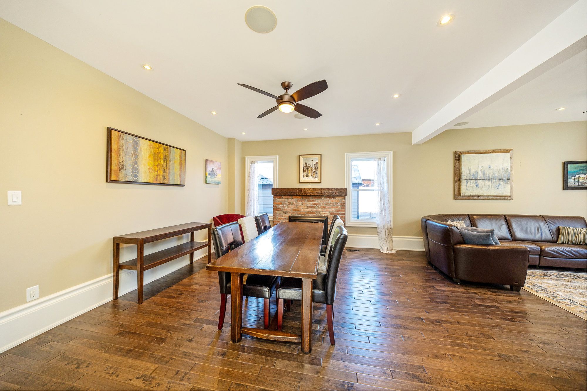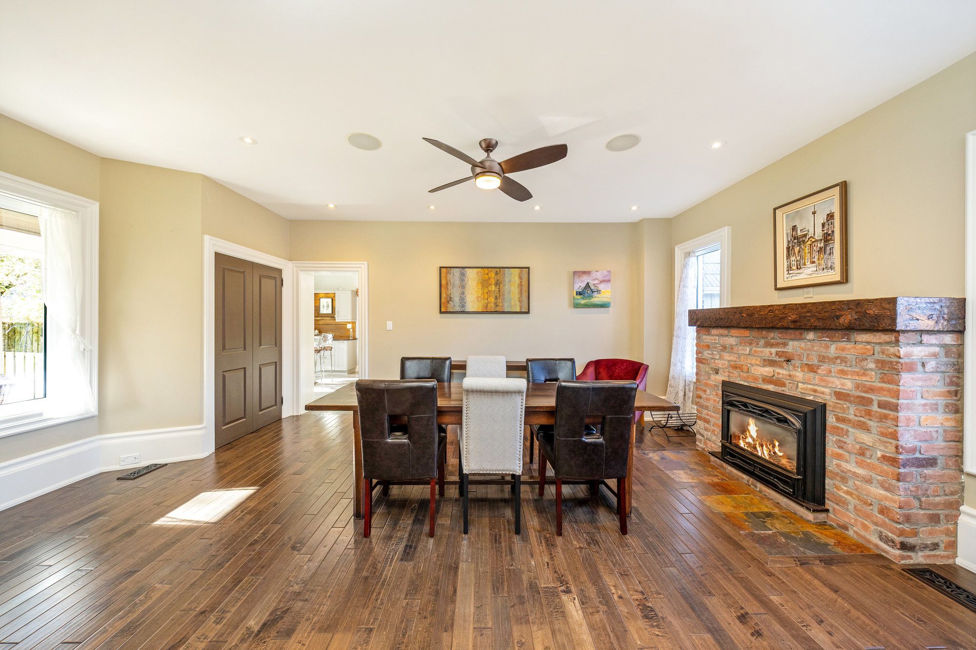 • Spacious open living and dining area with hardwood floors and a gas fireplace.