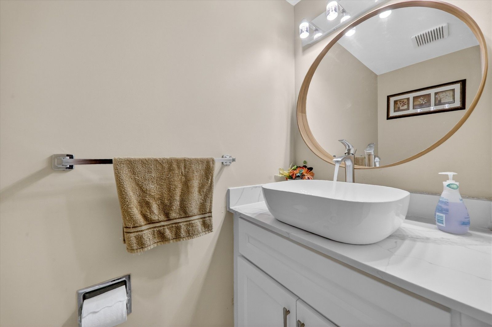 • Modern kitchen with quartz countertops and updated appliances.