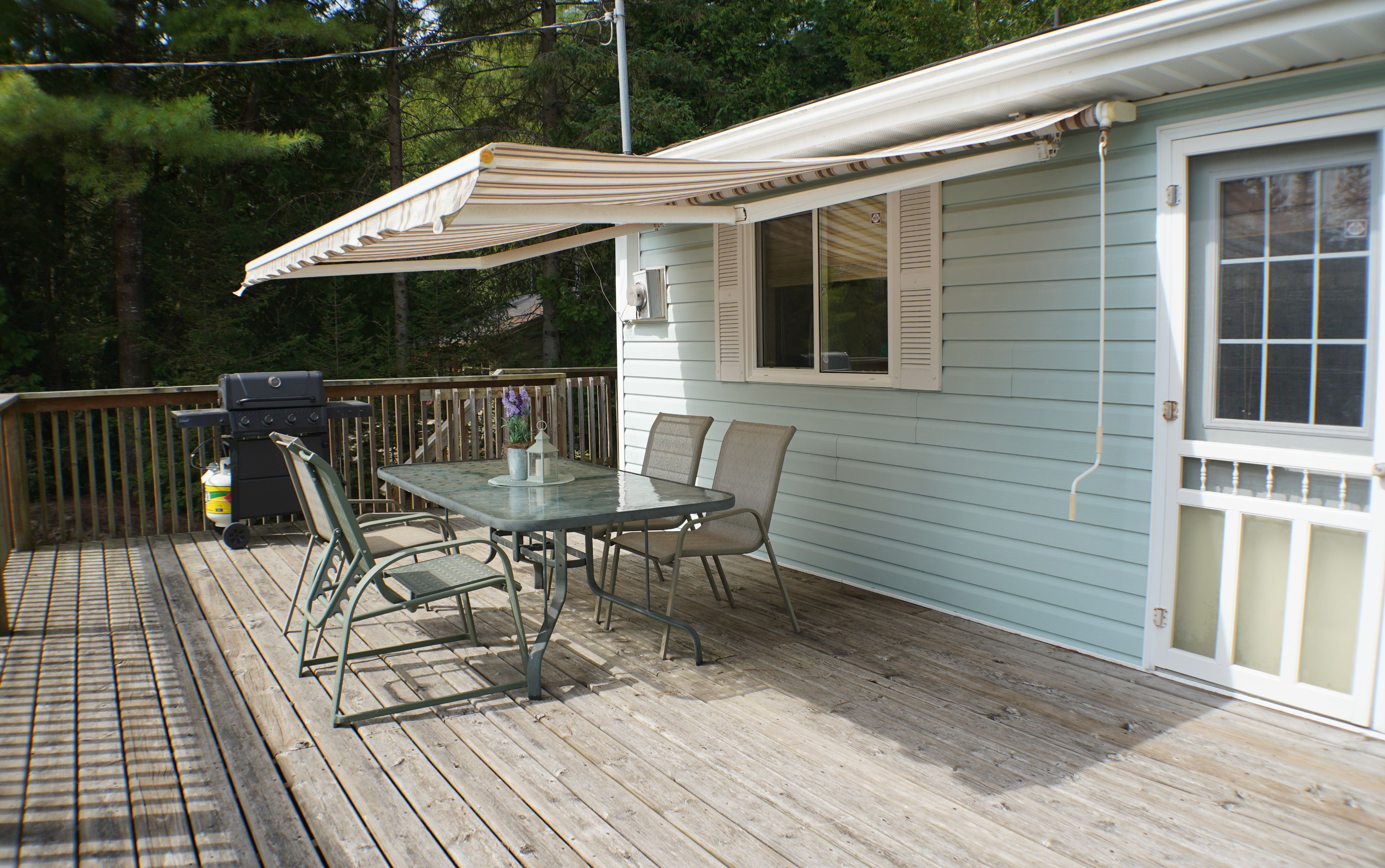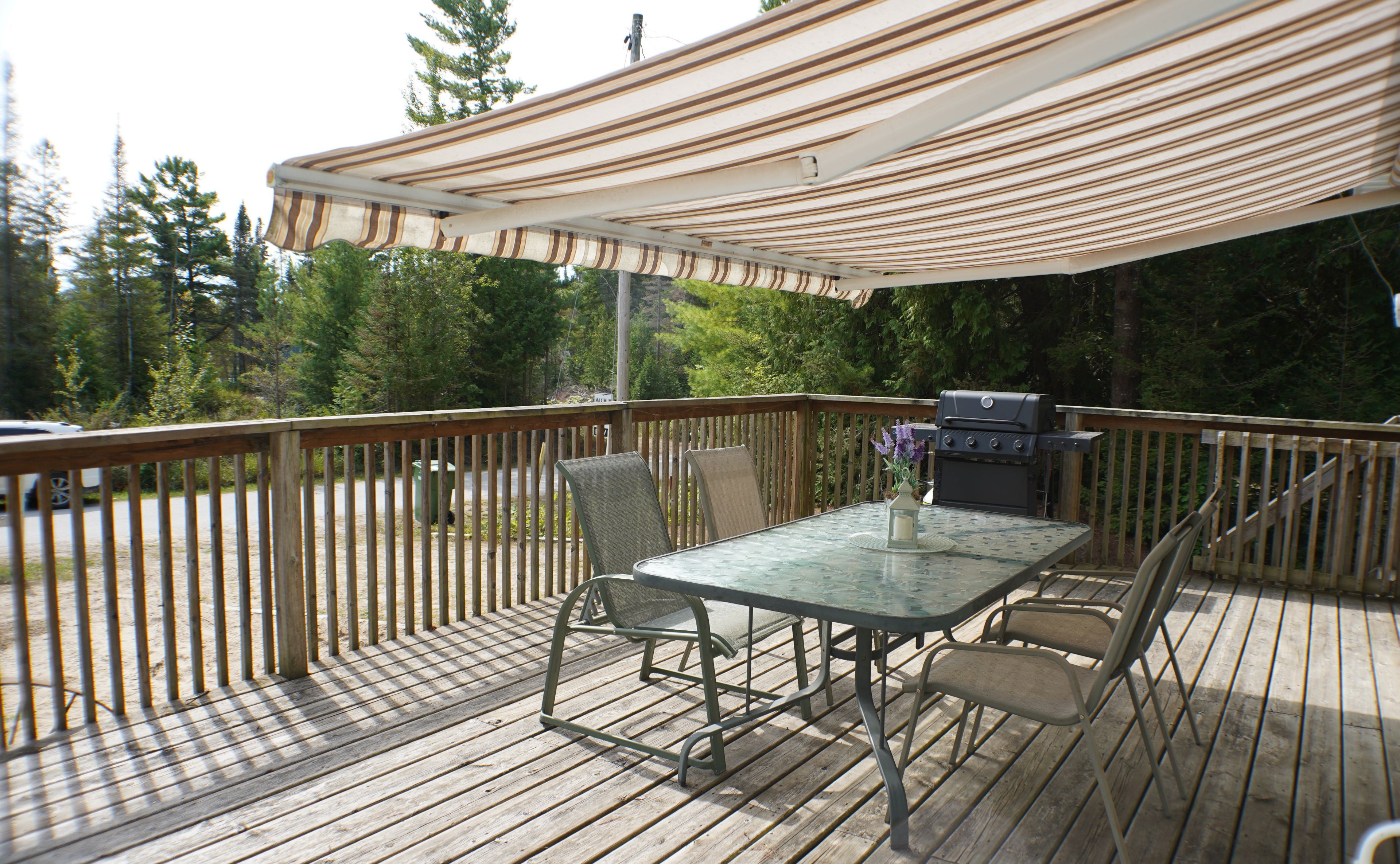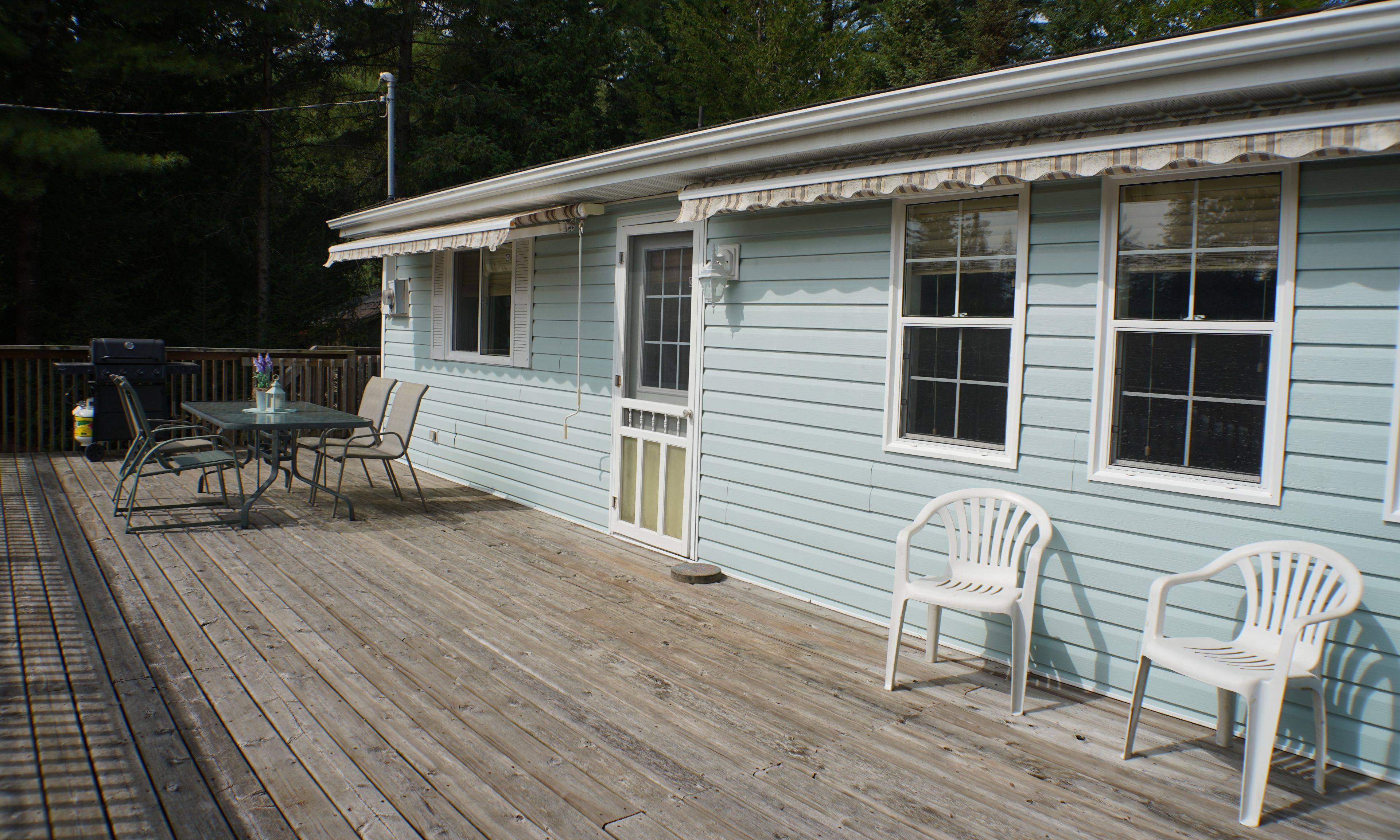 • Welcoming front deck with awnings, great for relaxing or socializing.