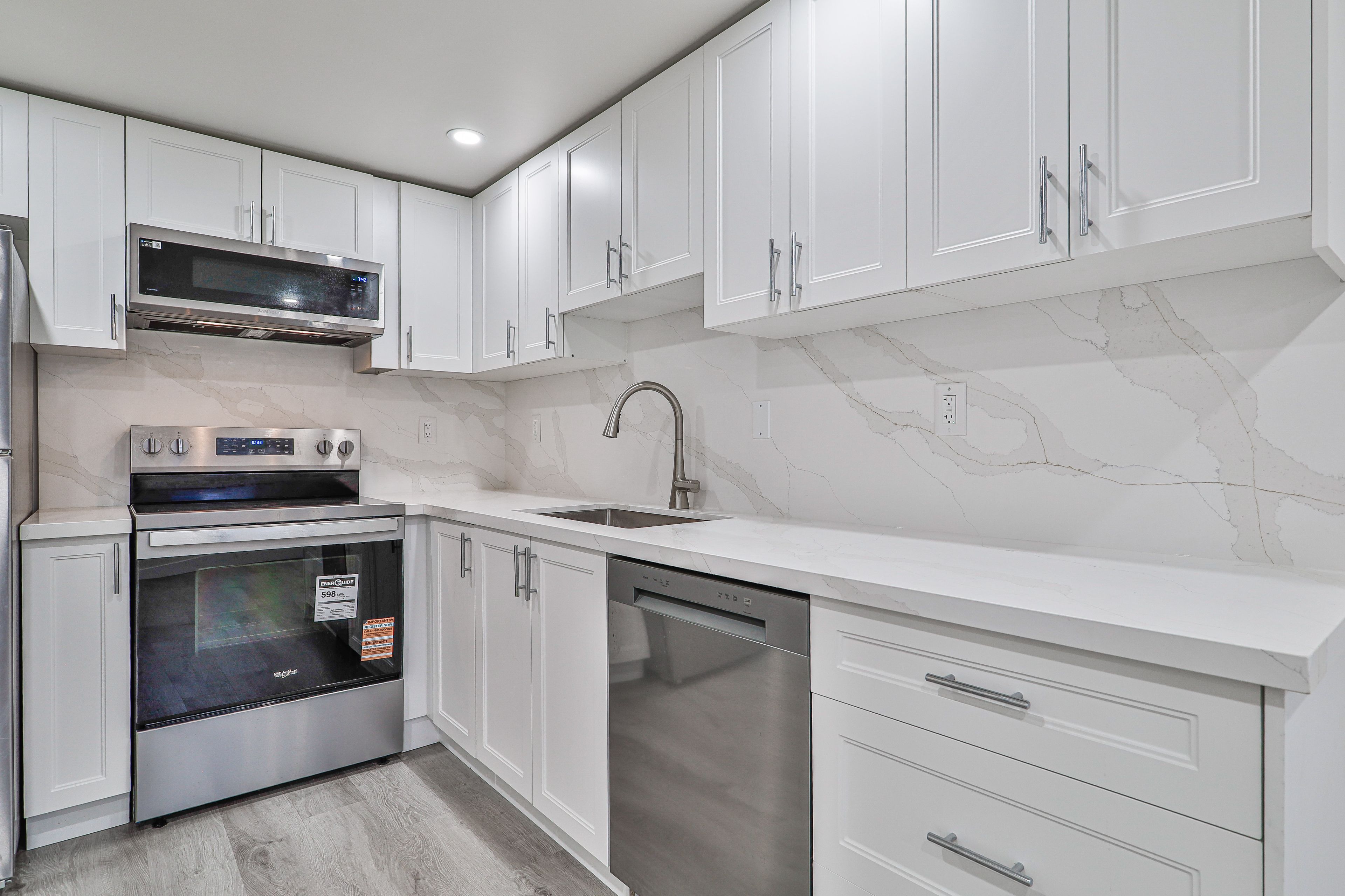 • Stylish kitchen with quartz countertops and stainless steel appliances.