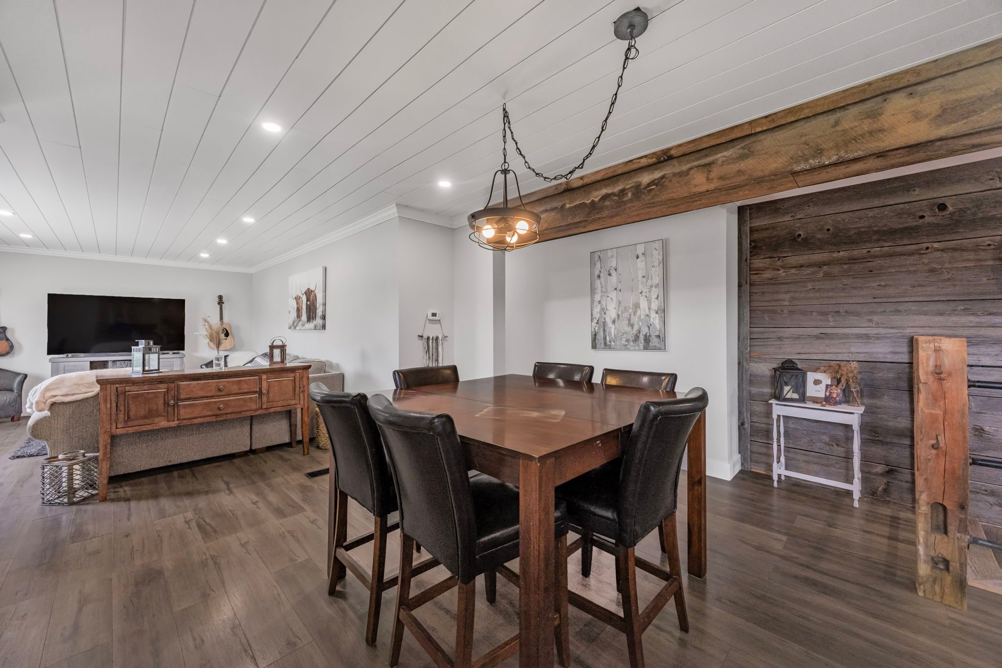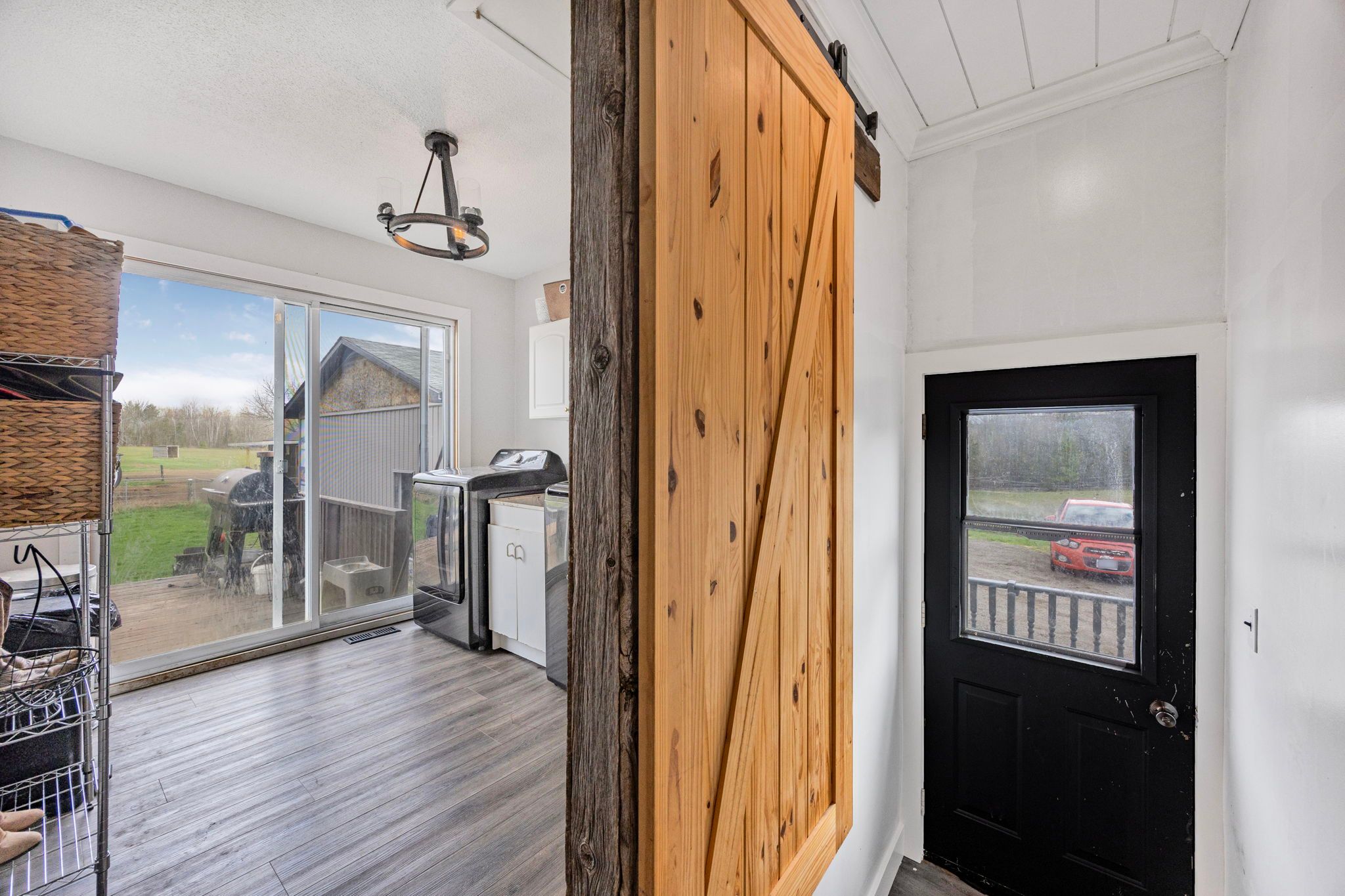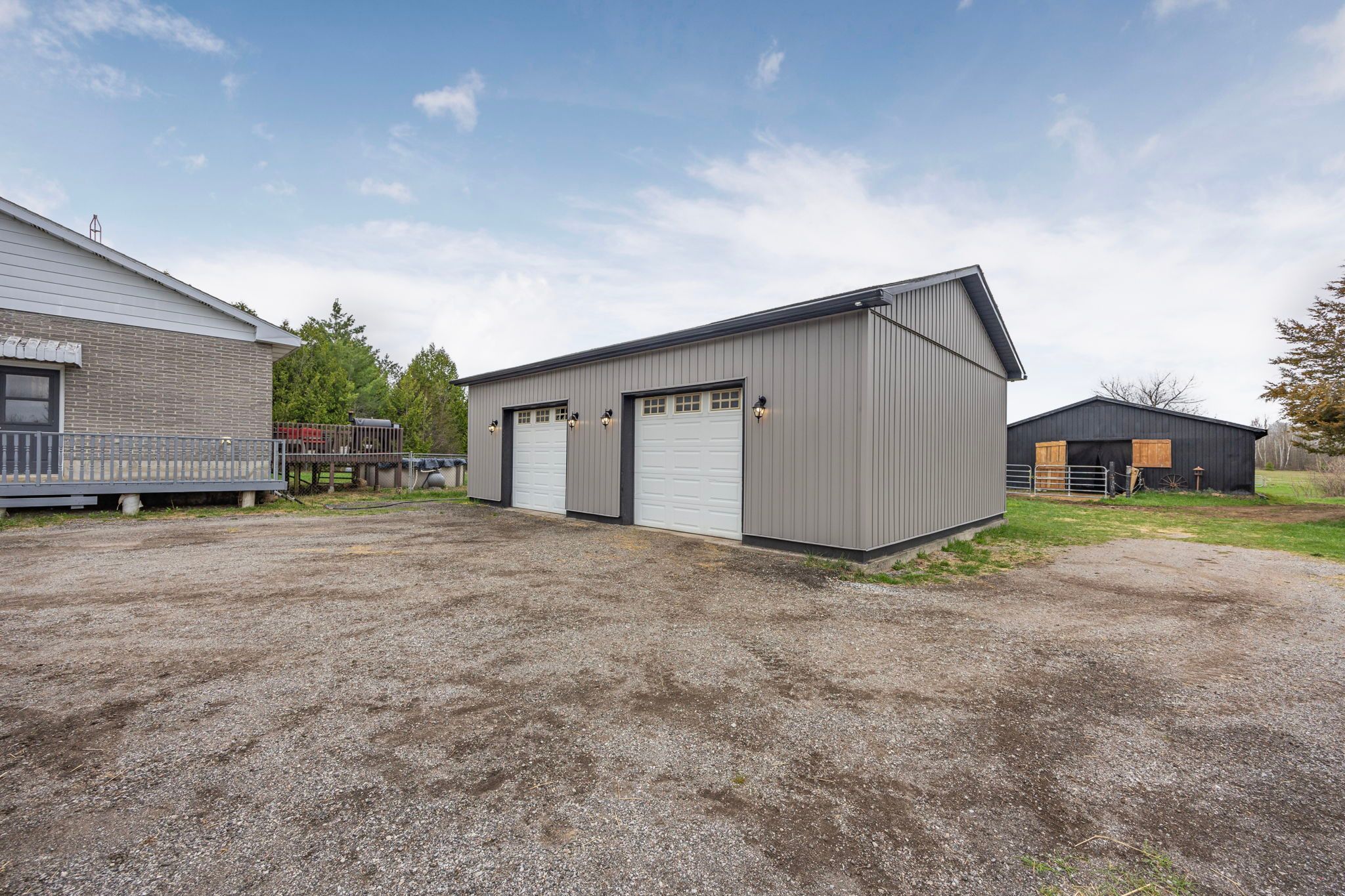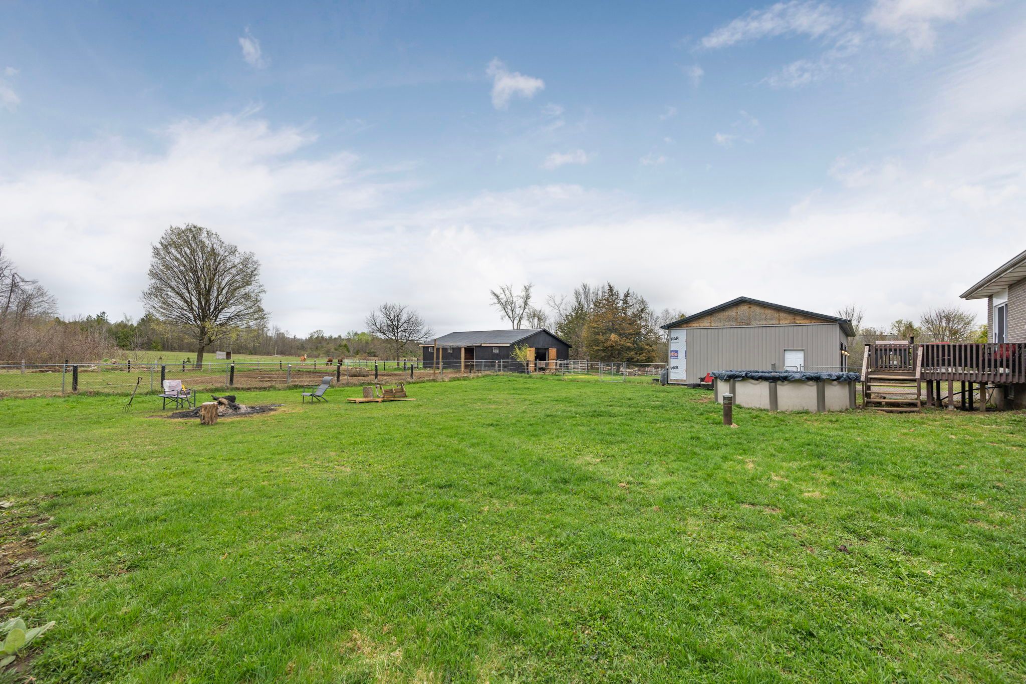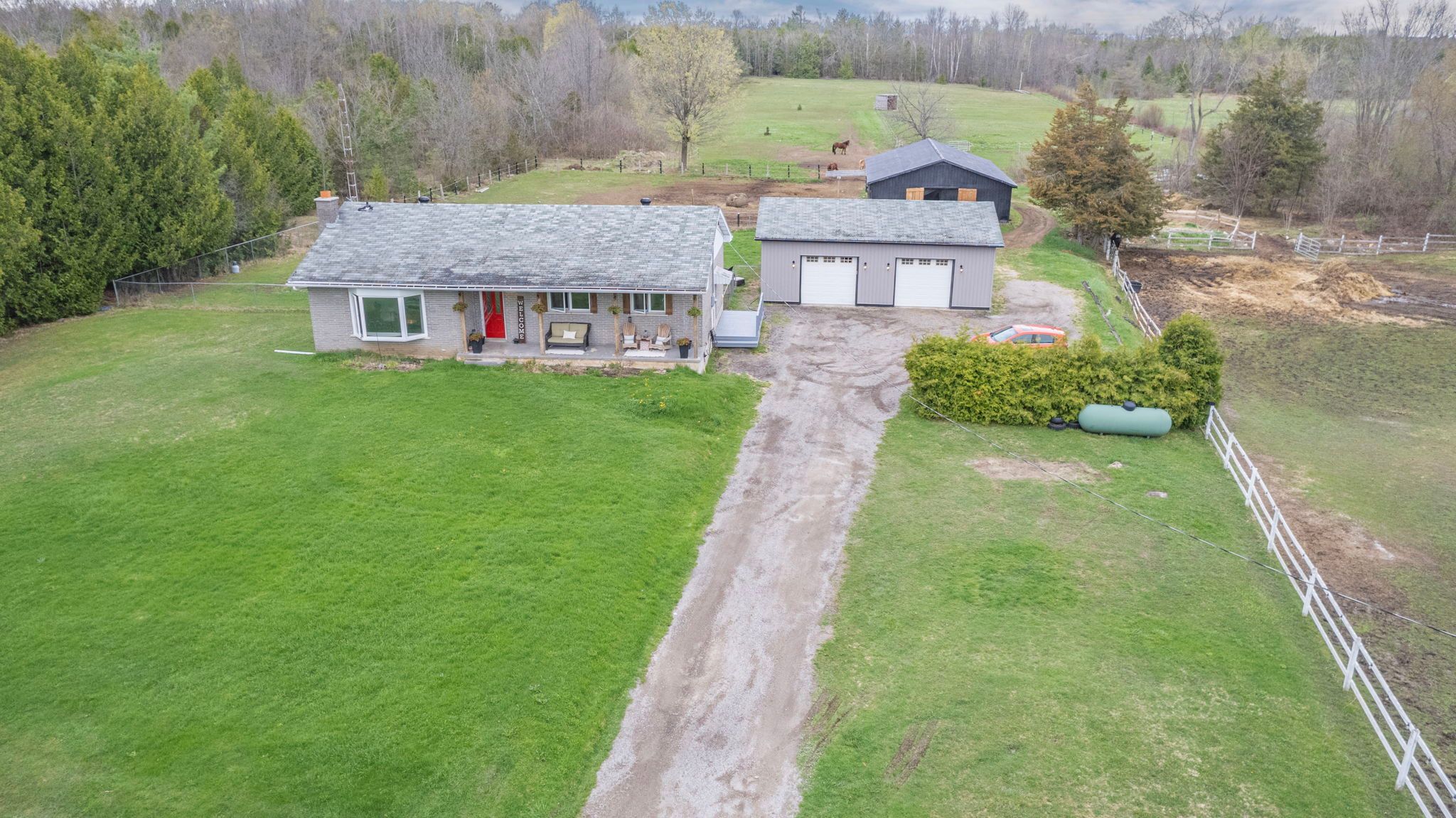 Set on 6 picturesque acres, this newly renovated brick bungalow blends timeless rural charm with thoughtful modern upgrades. Step inside to a warm, rustic-inspired interior that captures the essence of country living while offering everyday comfort and efficiency. The main level features two inviting bedrooms, a full bath, a well-appointed kitchen, and the convenience of main-floor laundry, all designed for easy, single-level living. A large exterior deck extends your living space outdoors-perfect for morning coffee or sunset views over open fields. The partially finished basement adds versatility with an additional bedroom and is fully spray-foam insulated, the basement exterior walls are mostly drywalled, this home with hobby farm and shop is equipped with a 200 amp electrical service, complemented by major improvements include a newer furnace for year-round efficiency with a newer drilled water well.. New asphalt roof (2025), giving peace of mind for years to come. For those needing space to work or pursue hobbies, the 24' x 36' detached garage/shop offers newer insulation, a plywood-finished interior, and new exterior siding-ideal for projects, storage, or equipment. Equestrian and hobby farm enthusiasts will appreciate the 48' x 32' barn, complete with four horse stalls, generous hay storage, and six separated exterior paddocks with electric fencing, plus open fields designed for rotational grazing. This is a rare opportunity to enjoy a move-in-ready country home with the infrastructure to support horses, hobbies, or a self-sustaining rural lifestyle-where comfort, function, and wide-open space come together seamlessly.