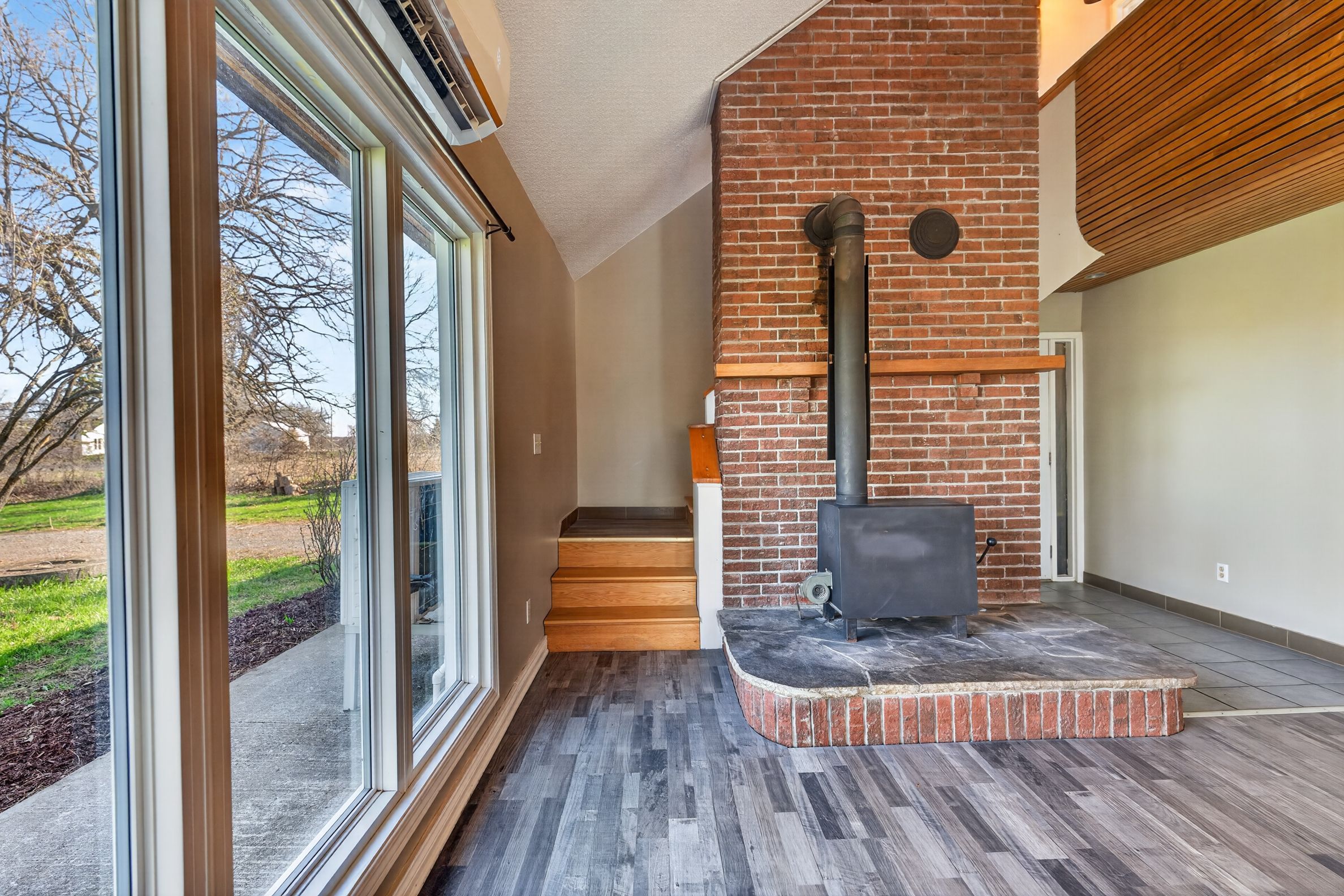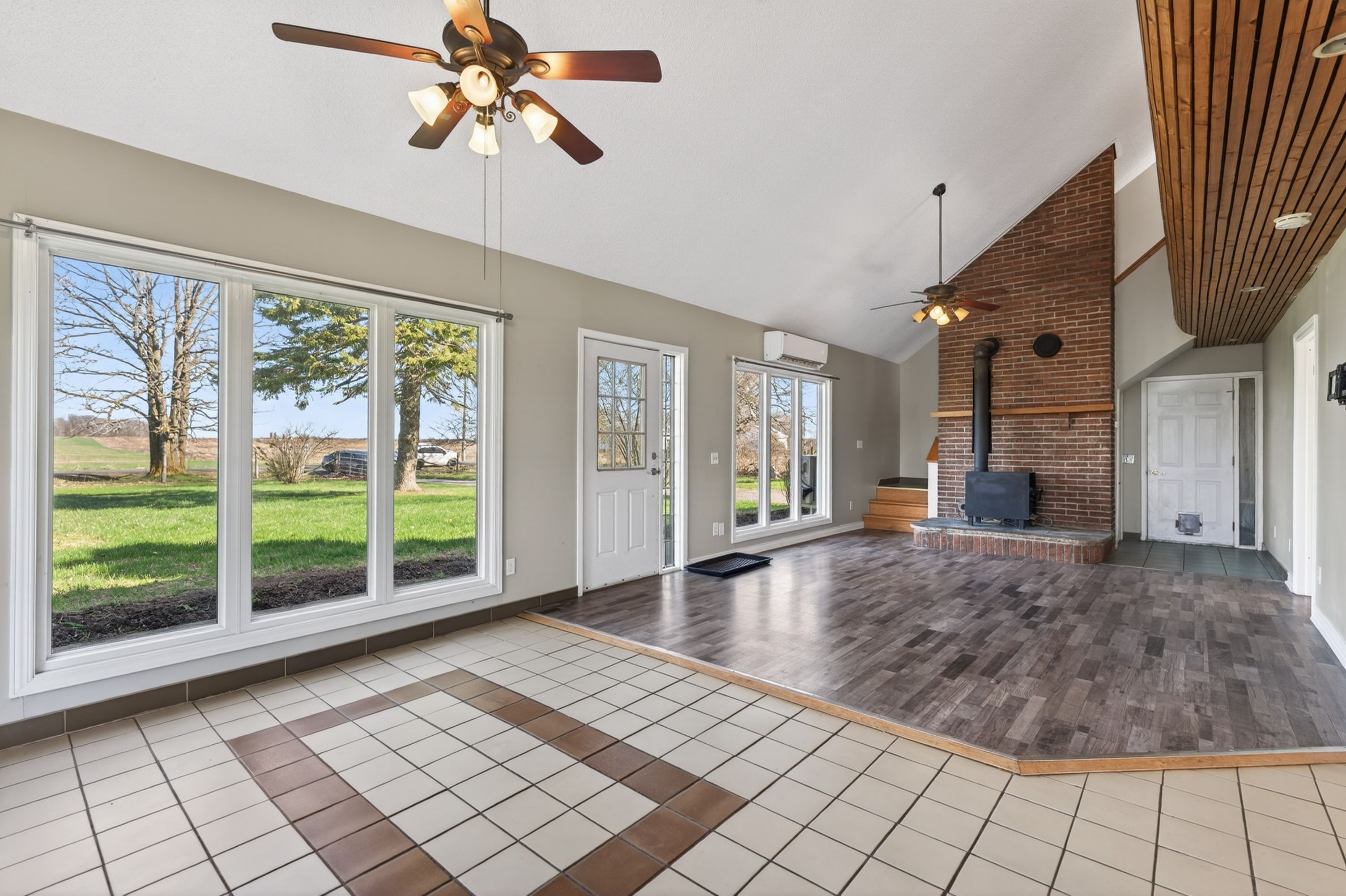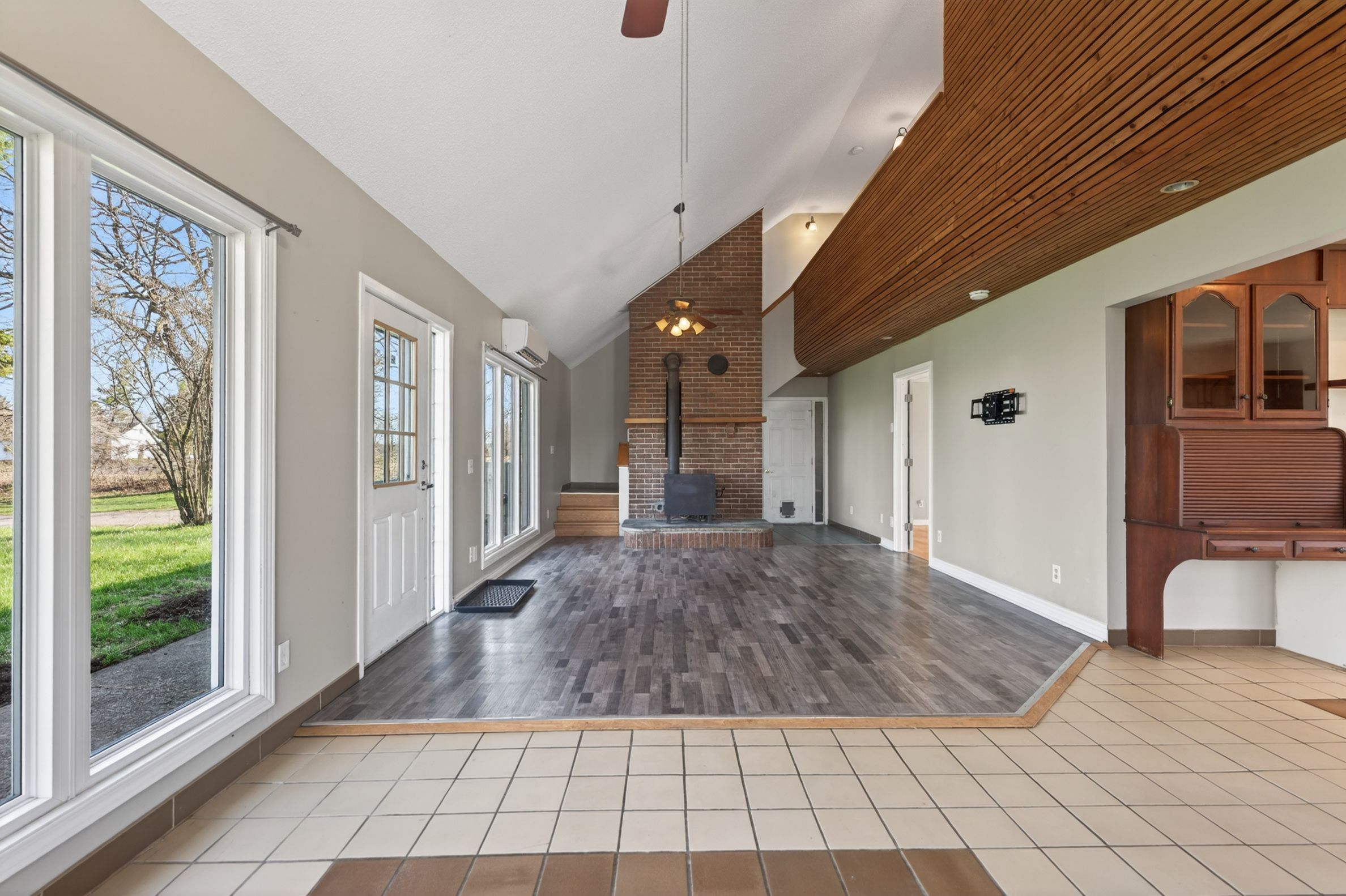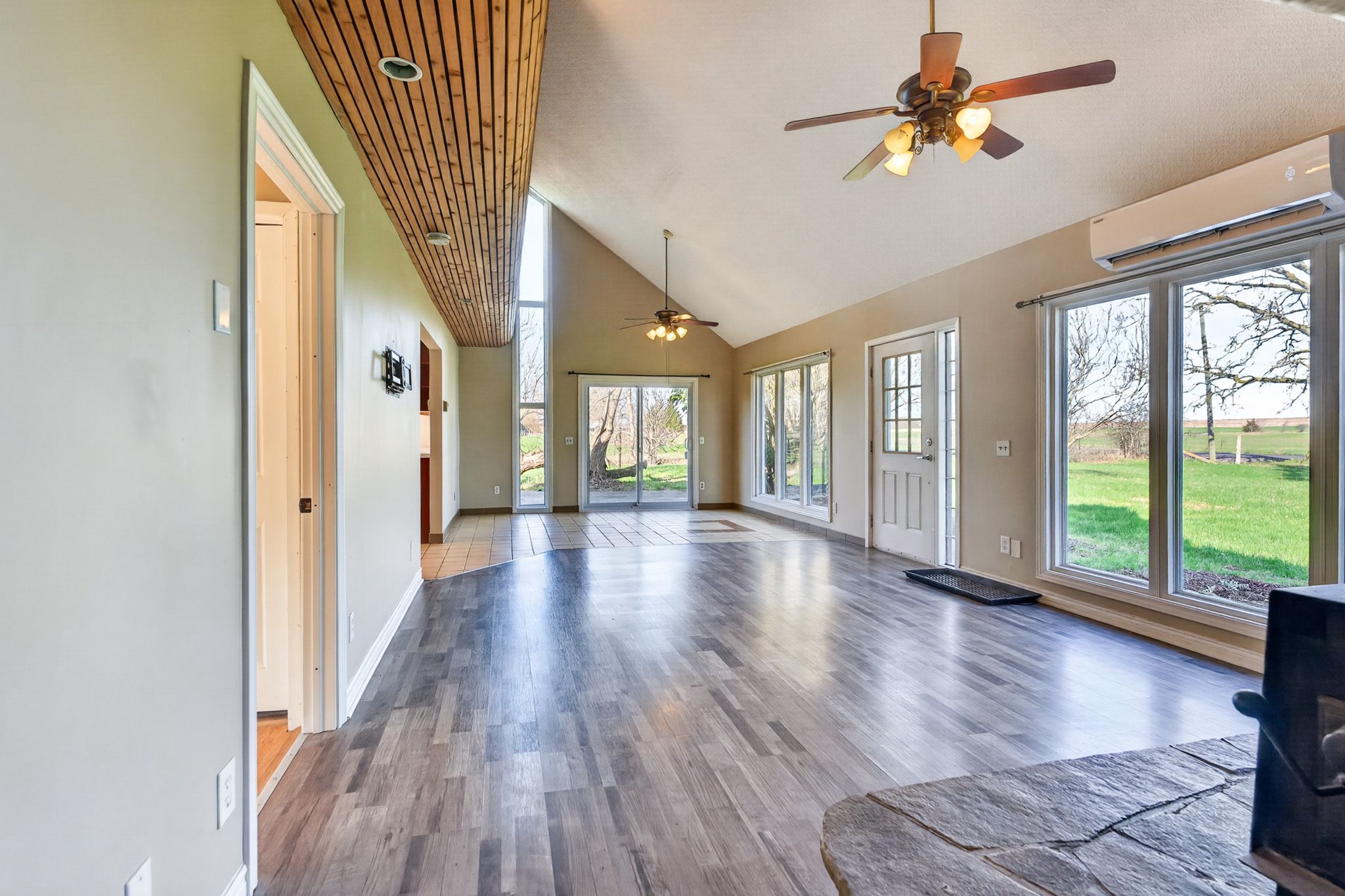• Bright open-concept living area with large windows and vaulted ceilings.