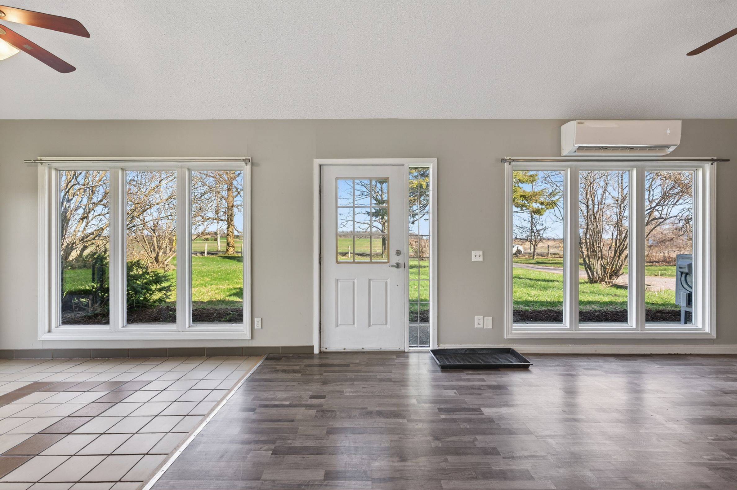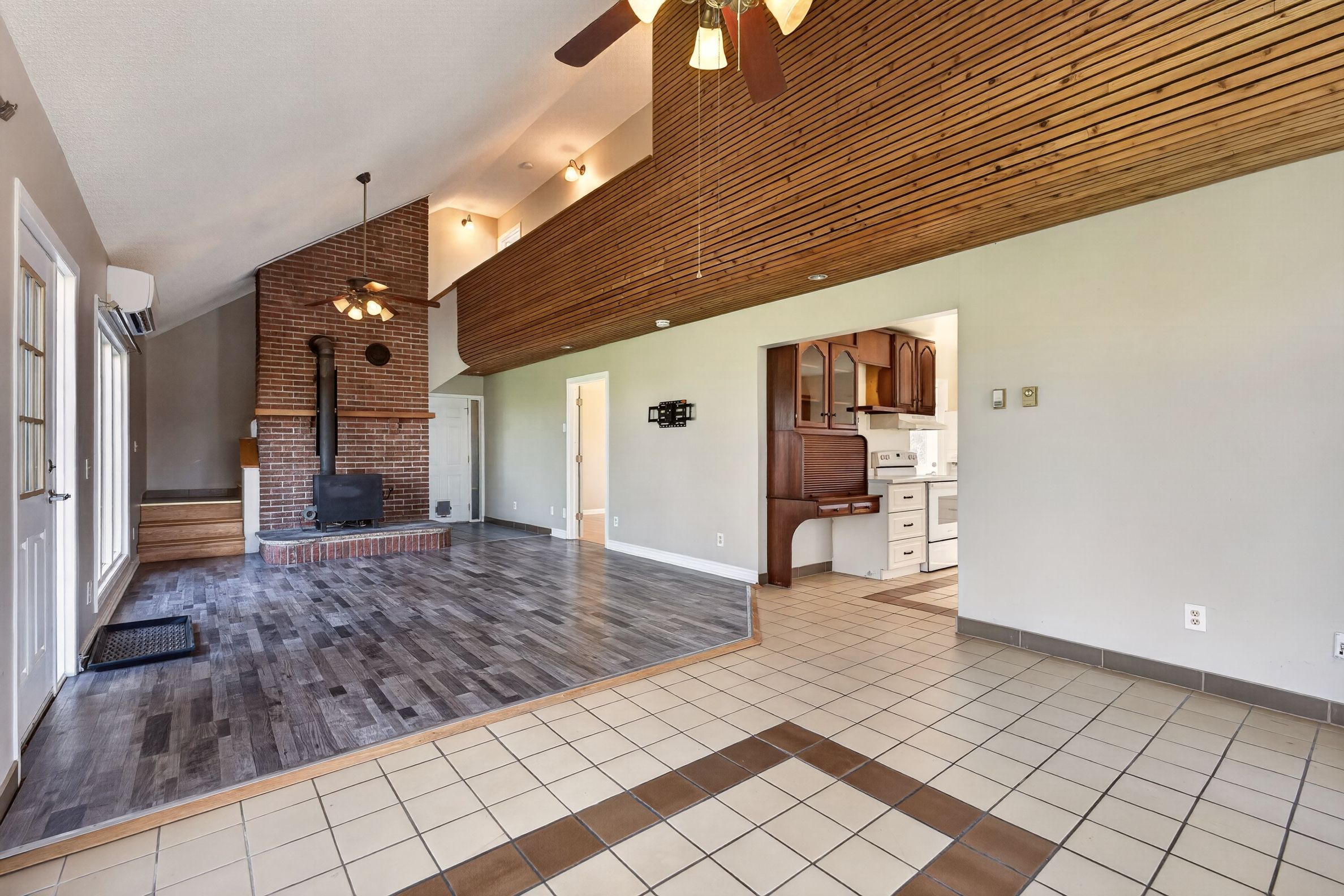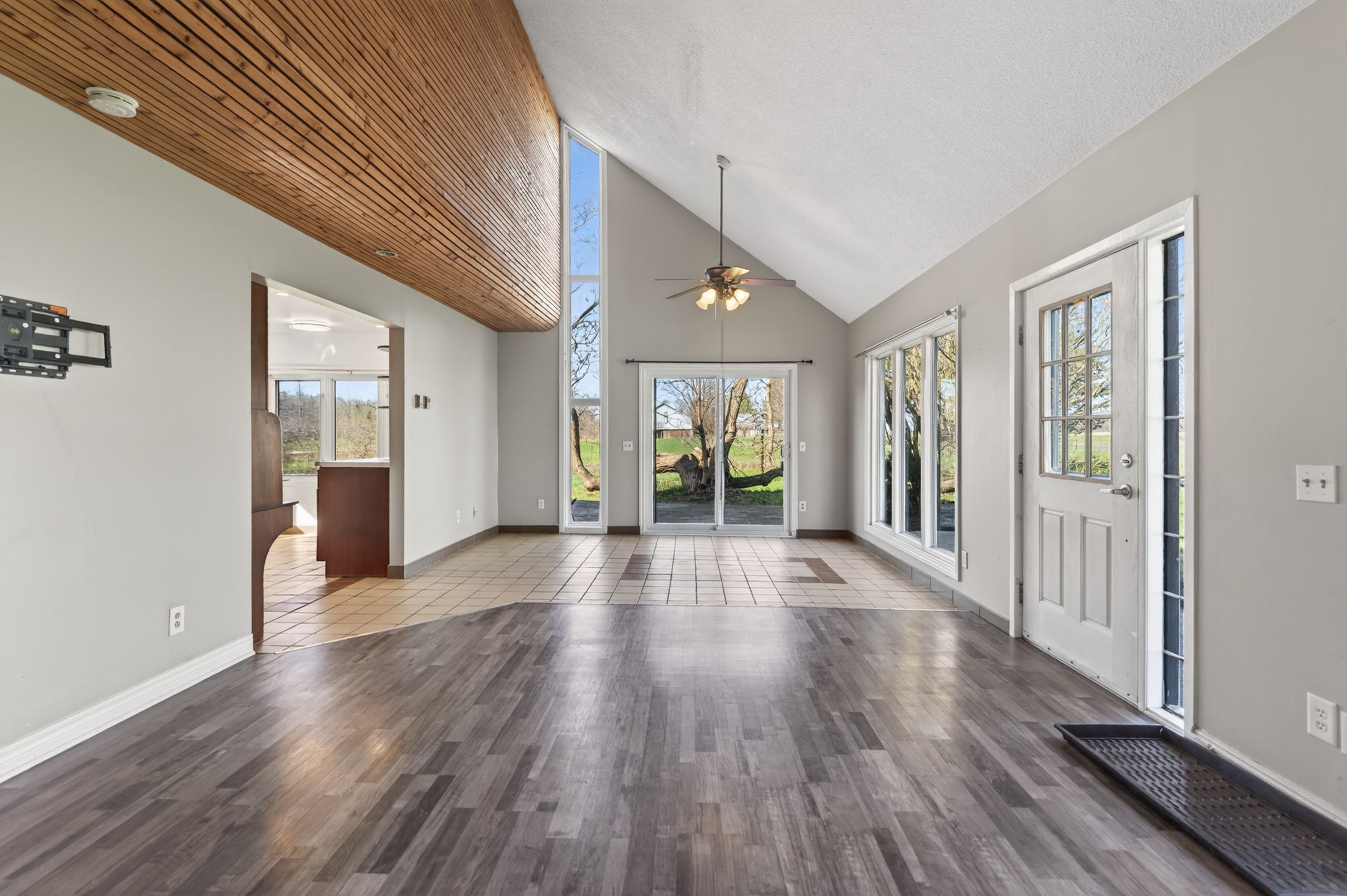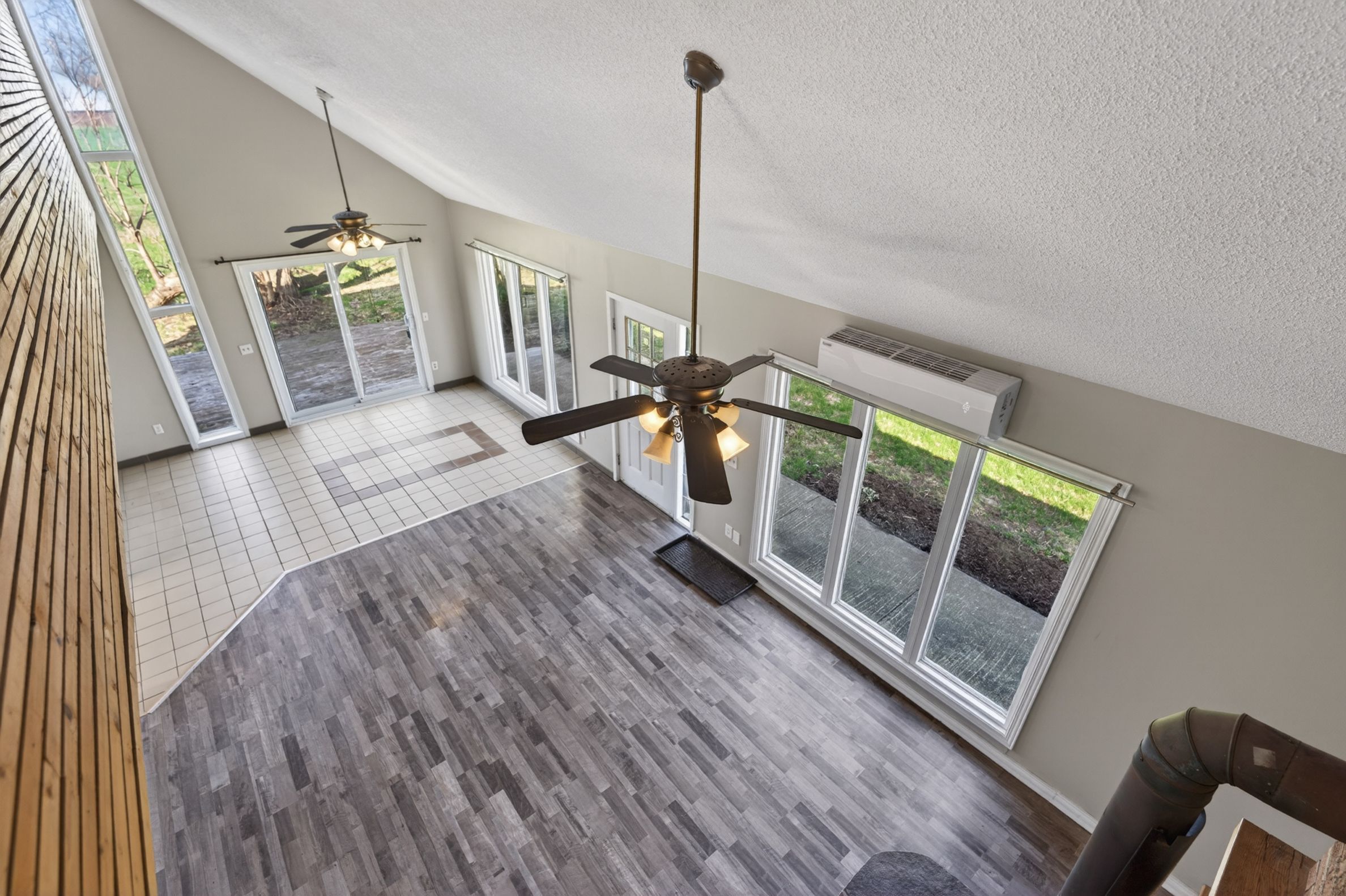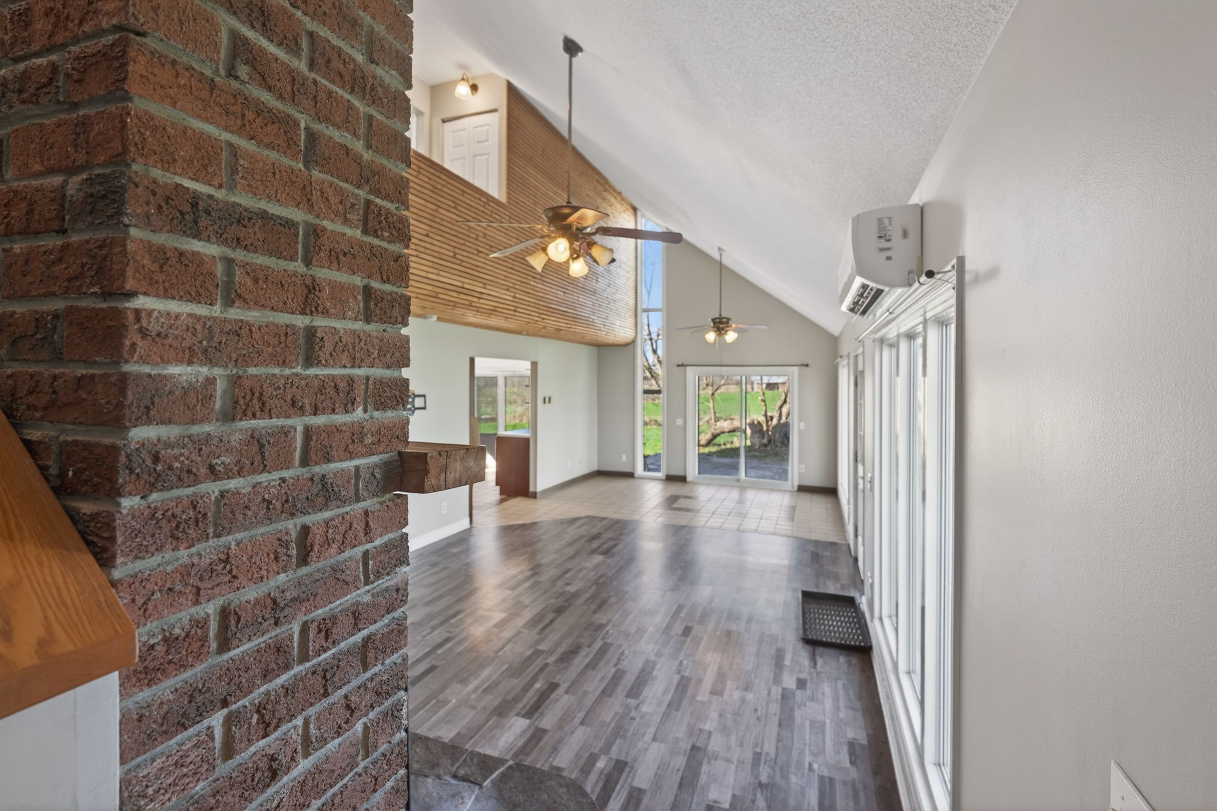 • Bright open-concept living area with large windows and vaulted ceilings.