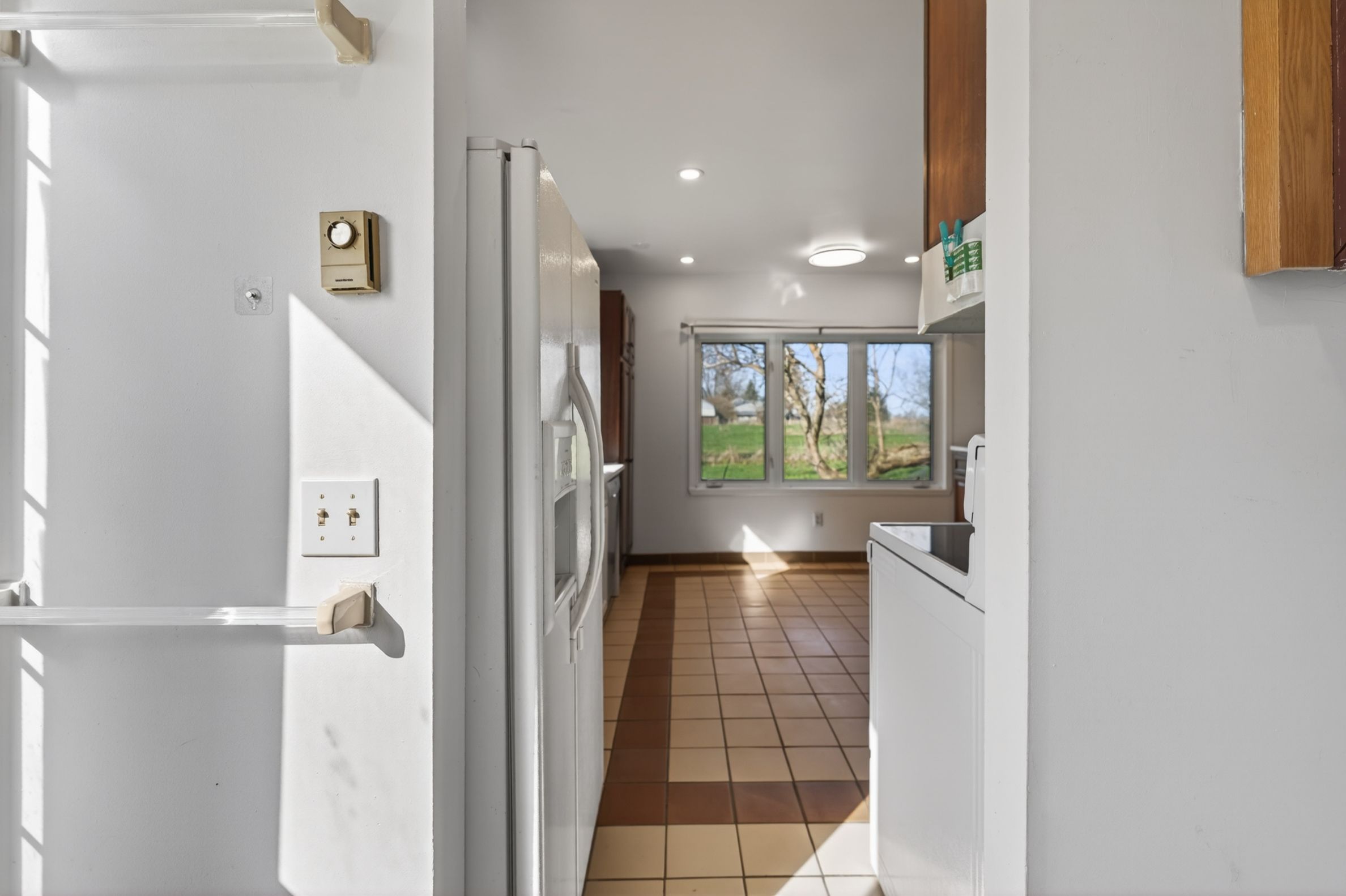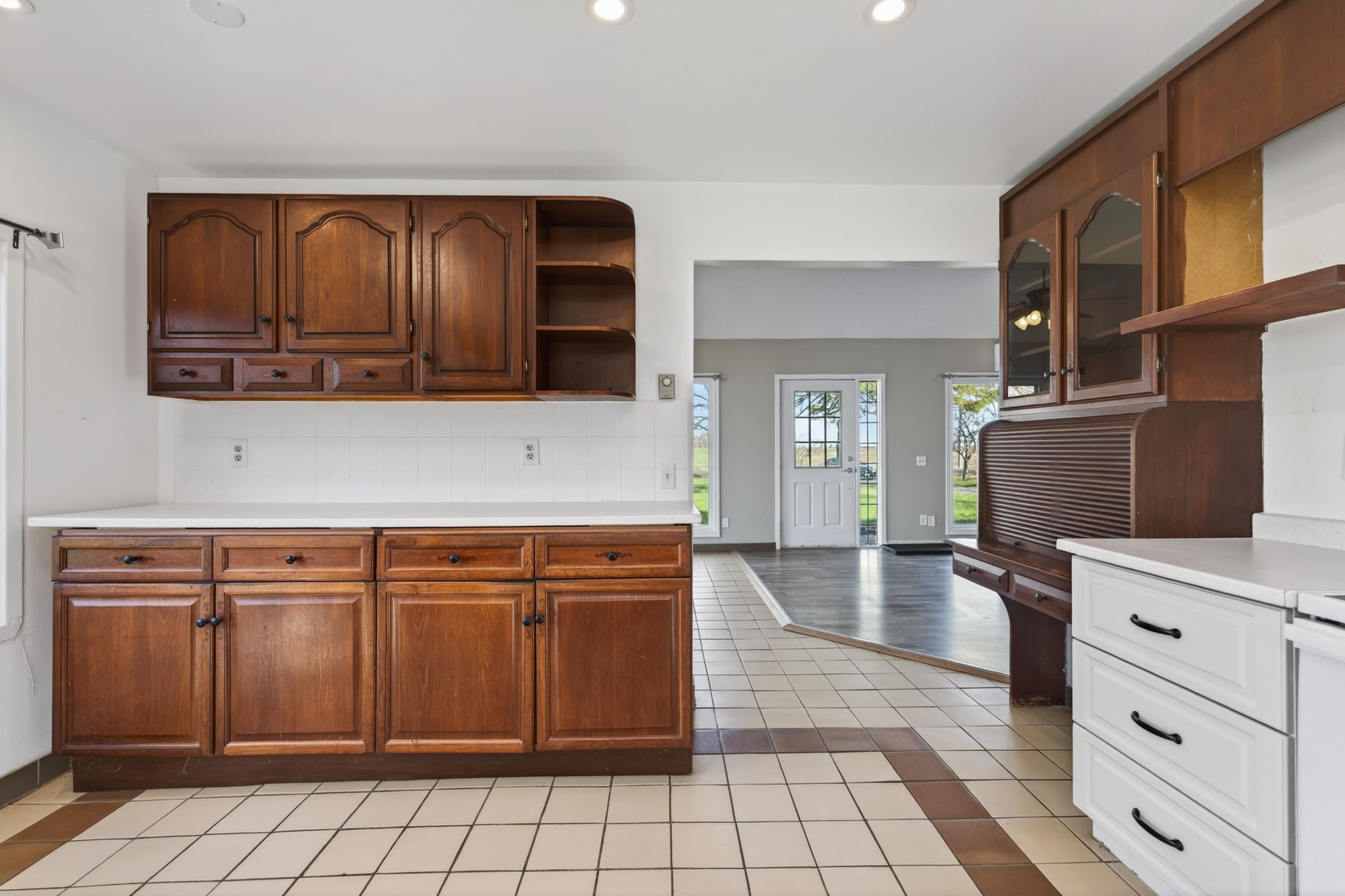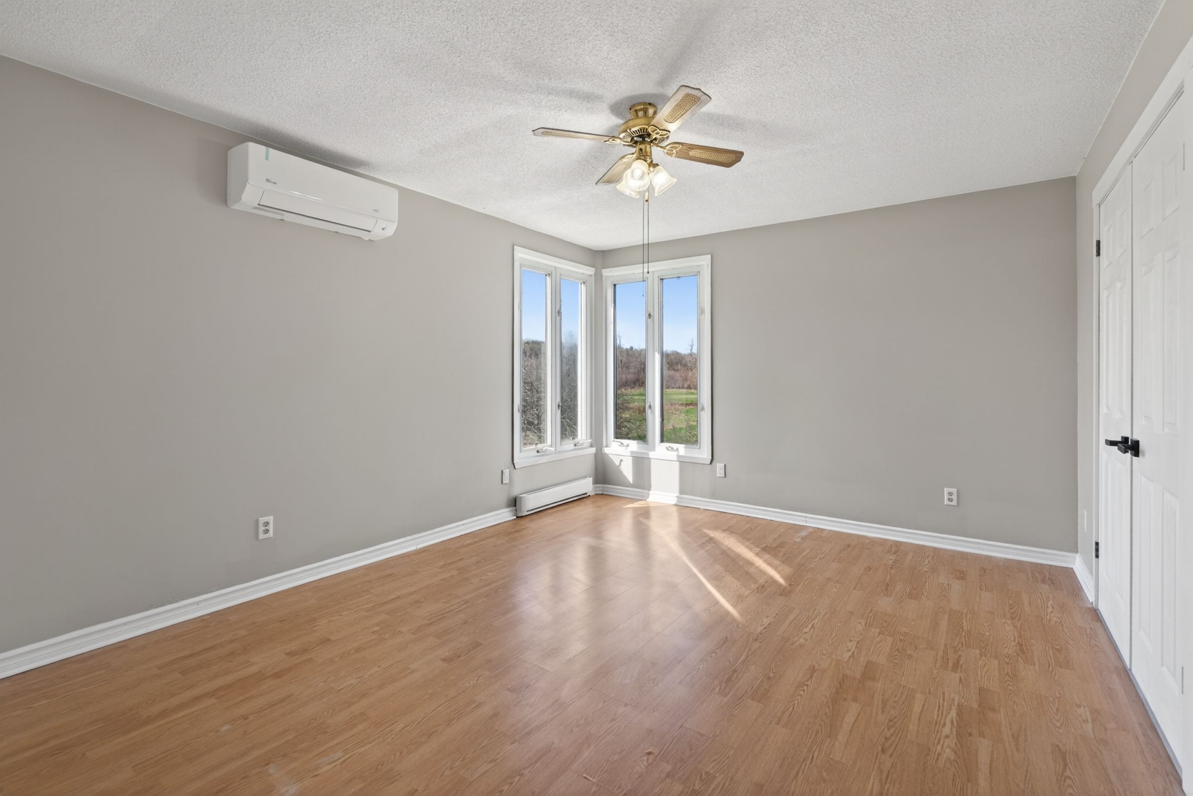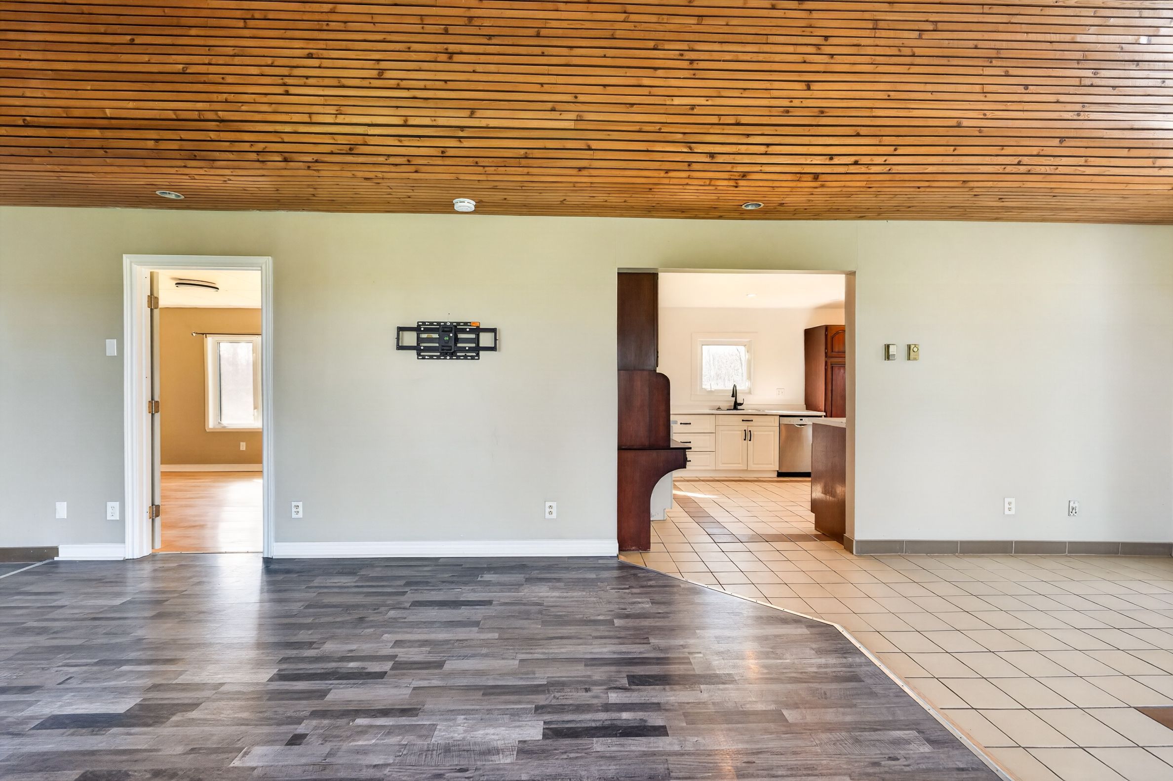 • Bright open-concept living area with large windows and vaulted ceilings.