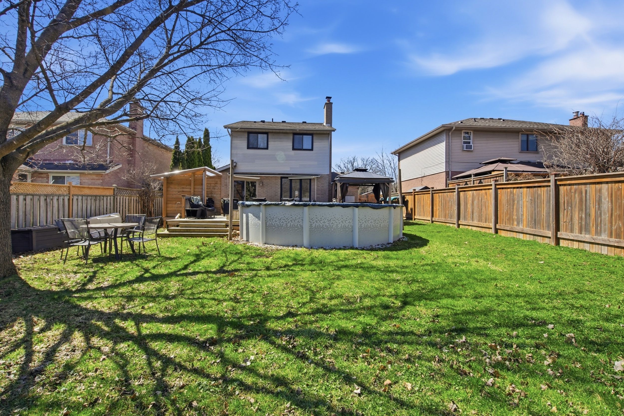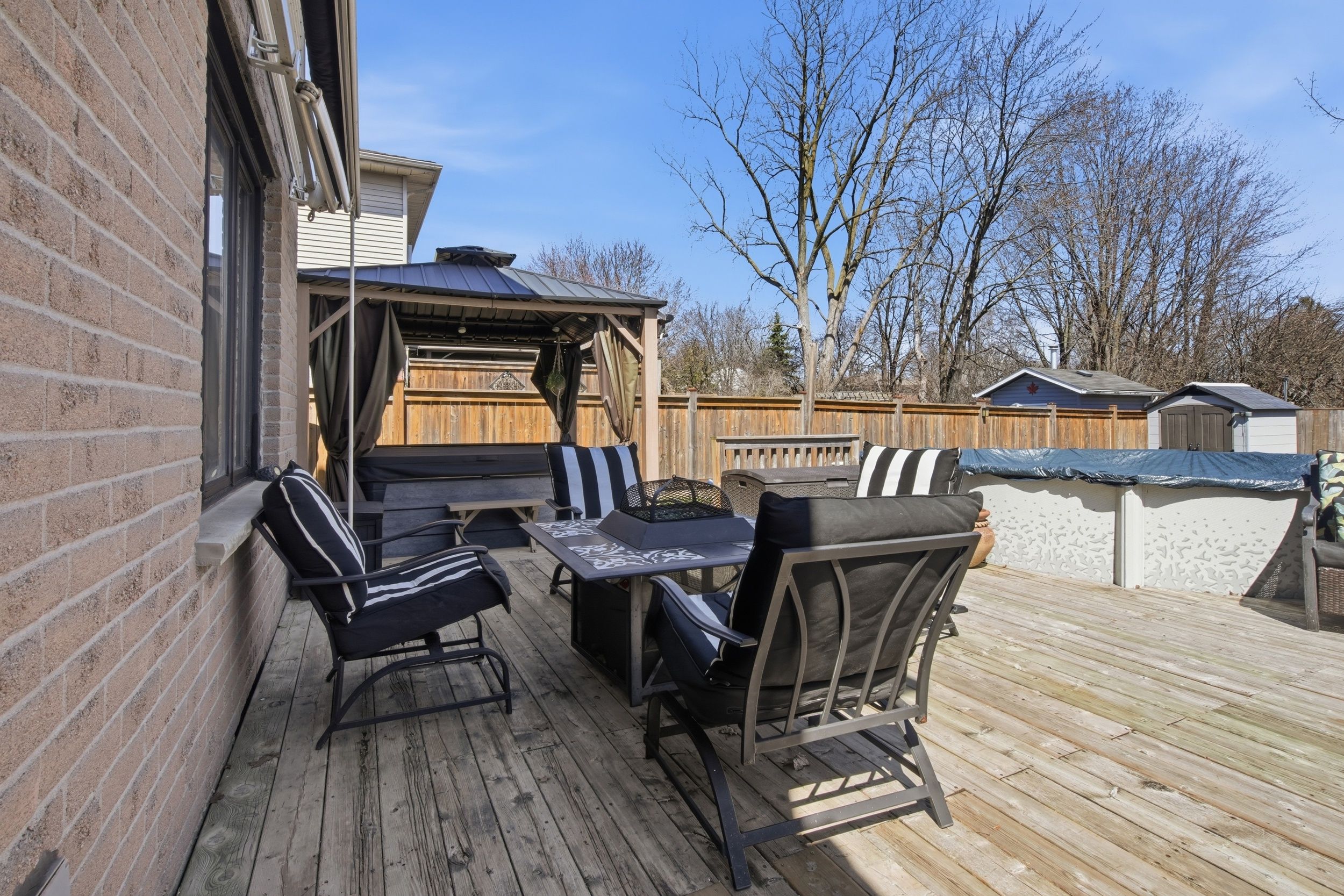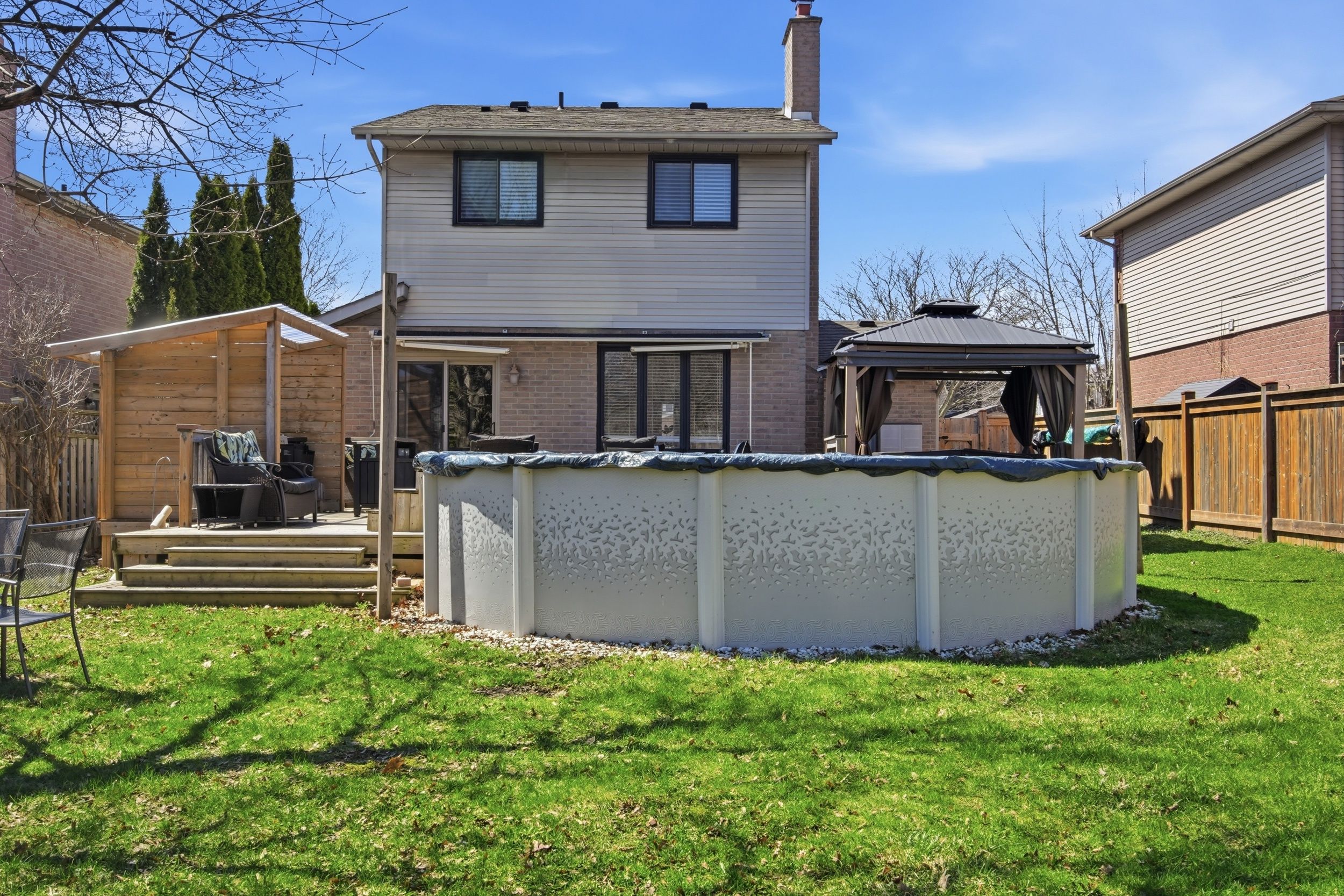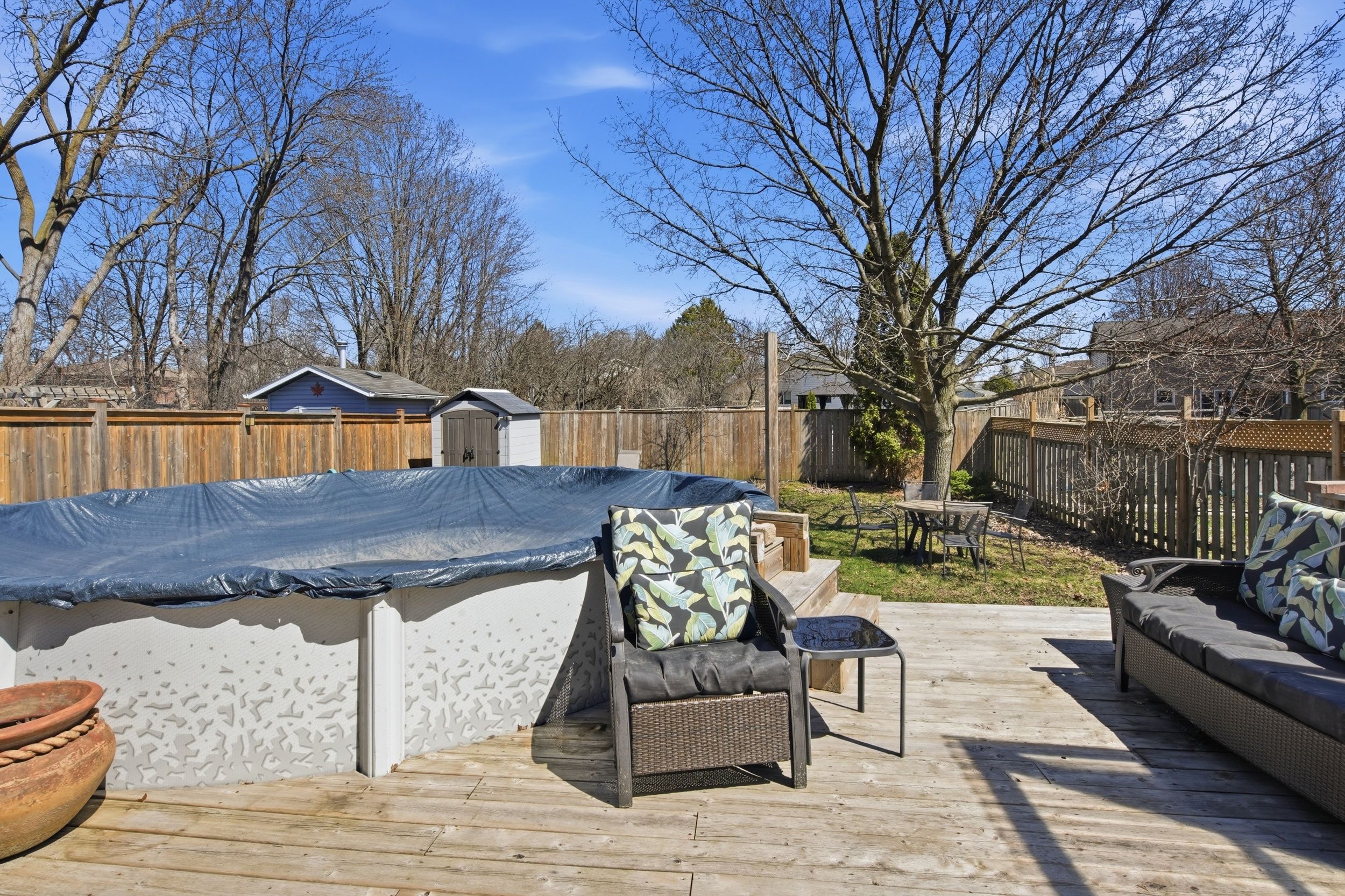 Located in family friendly mature neighbourhood in sought after south end walking distance to parks, river trails, playground and school. City bus at corner. 6 minutes to white oaks mall. 3 minutes to plaza with bank, library, restaurants, grocery and drug store and more! Nestled on quiet no exit place. Family home on privacy fenced lot with entertainment in mind. Enjoy spacious deck, covered bbq area, on ground pool with solar and winter covers as well as a concrete pad covered with a gazebo for a future hot tub. Sought after main floor plan has bay windowed living room and a family room which has a fireplace to warm up winter nights. Updated kitchen overlooks family room and opens through patio doors to backyard. Formal dining room for family meals. Fully finished lower level complete with rec room and a den. There are 3 spacious bedrooms on 2nd floor and the primary bedroom boasts its own ensuite and walk in closet. Updates also include furnace, air, flooring, dishwasher, fridge and stove. Long closing date preferred but sellers are flexible.