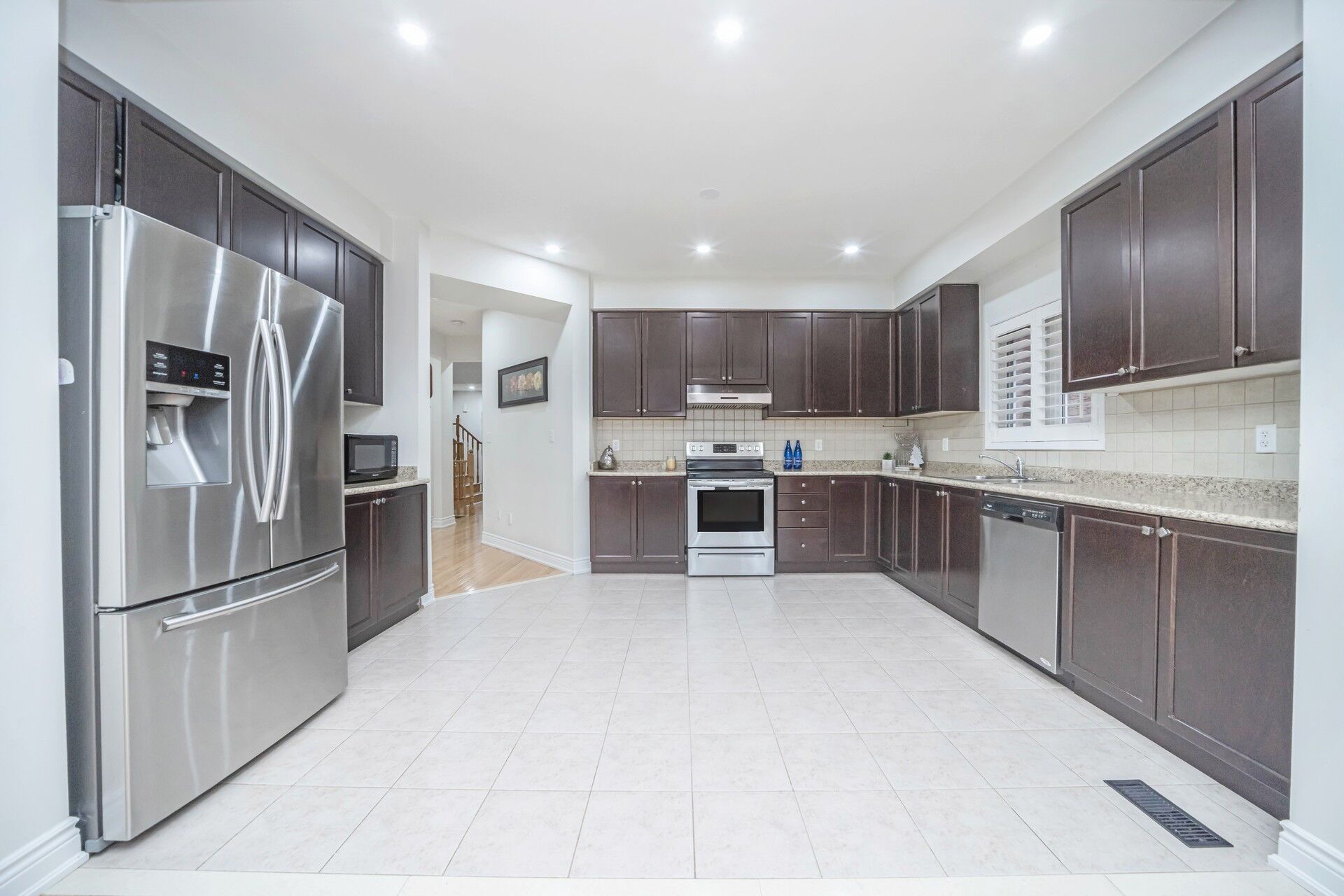 • Open concept kitchen featuring stainless steel appliances and stylish backsplash.