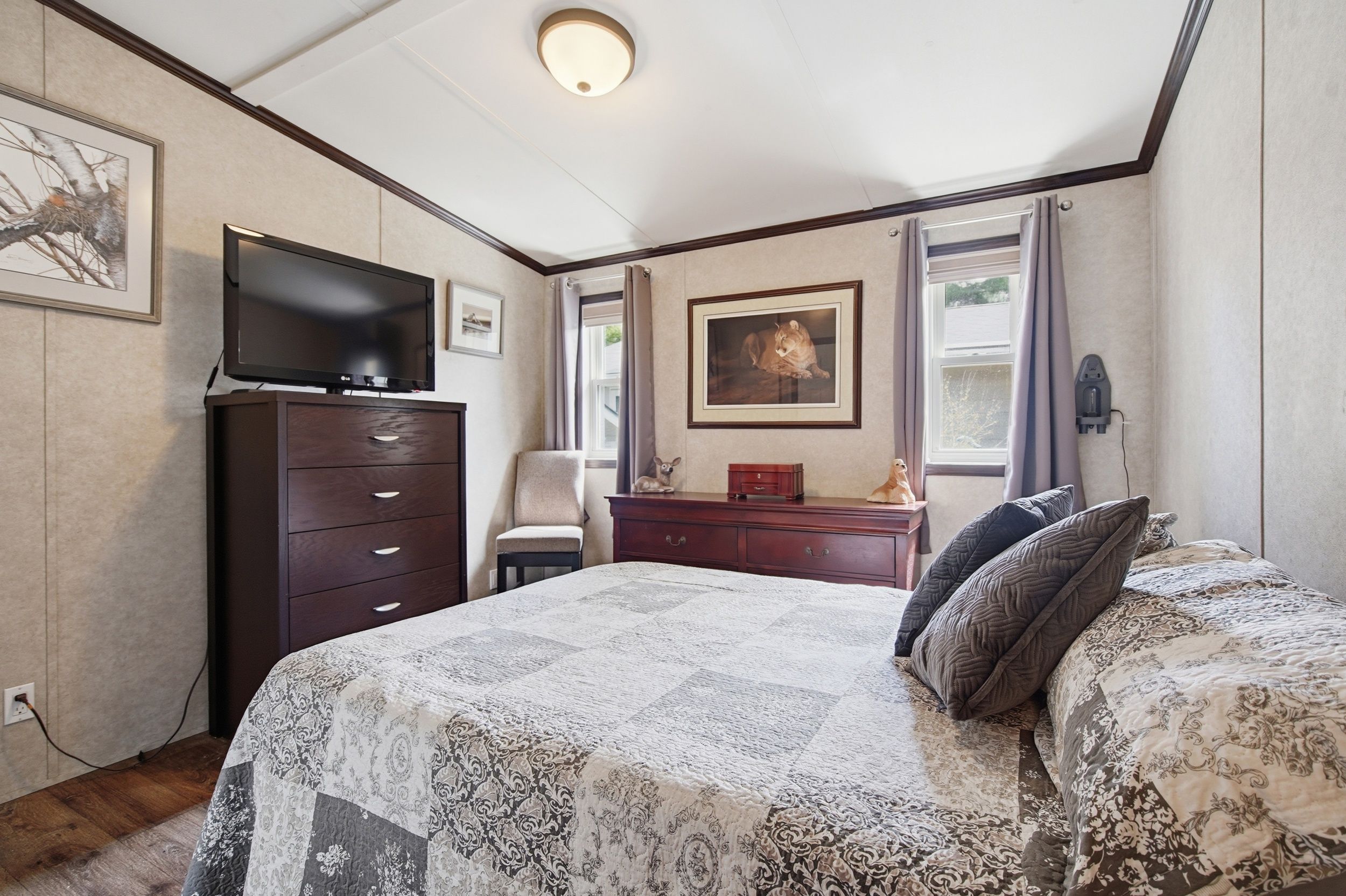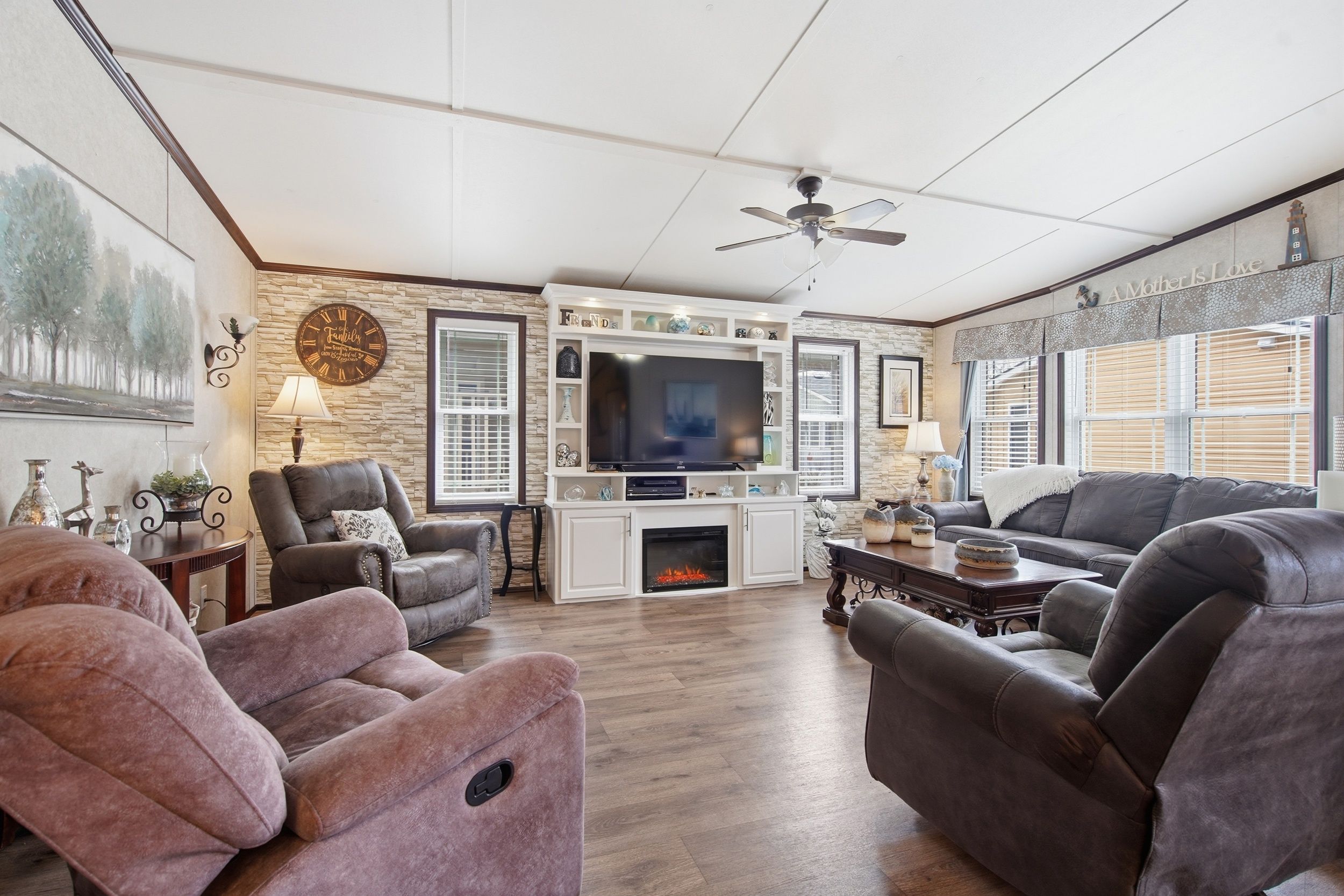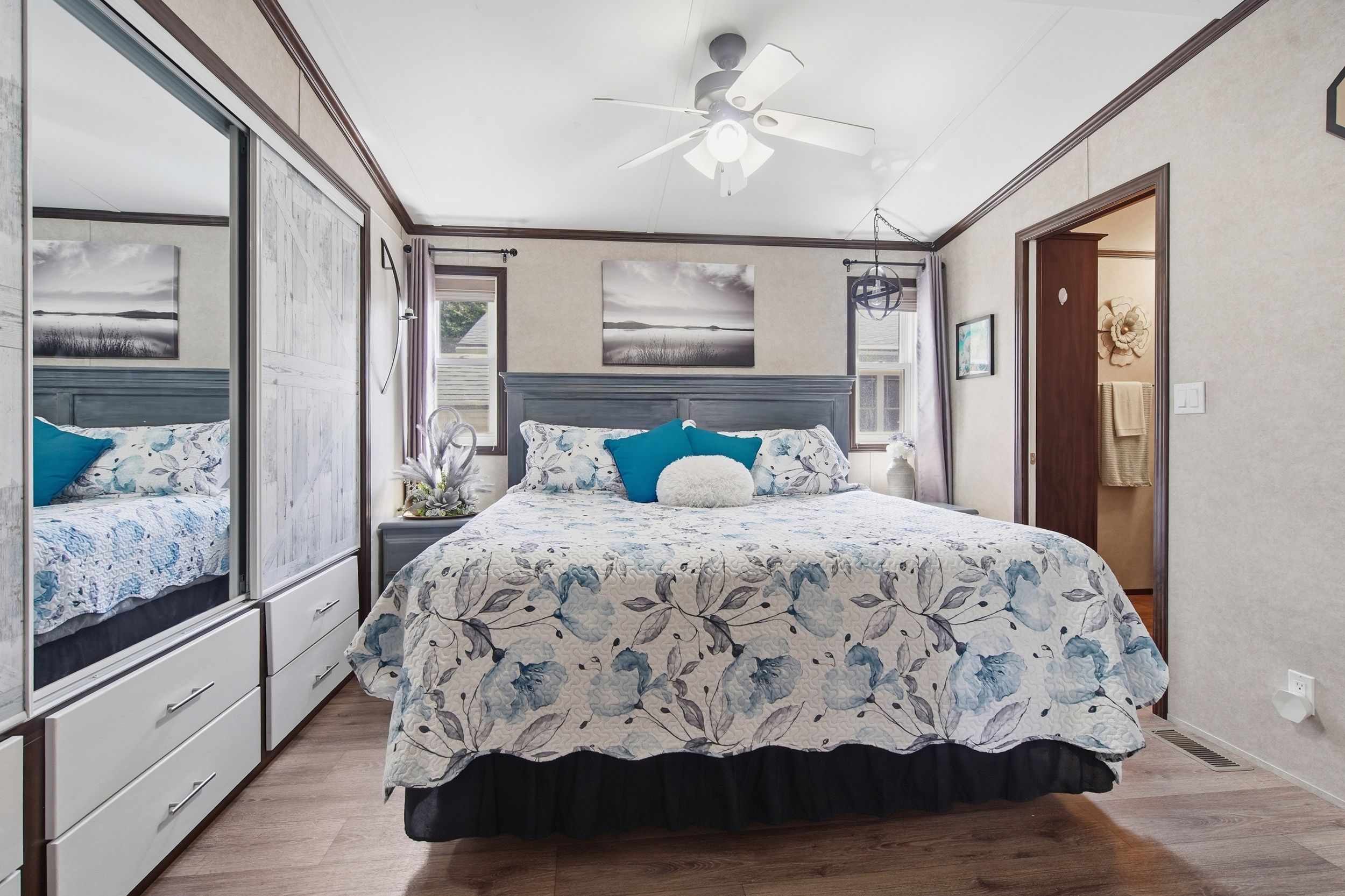 Welcome to oriole park #142 in komoka's sought-after 55+ community... Where lifestyle meets low-maintenance living. This beautifully maintained, original-owner modular home (2017) stands out with upgraded black trim, a premium location within the park, and exceptional indoor-outdoor living. Offering approximately 1,250 sq ft, this home features a bright, open-concept layout with a spacious kitchen complete with abundant cabinetry, large island, and included appliances... Flowing seamlessly into the dining area. The inviting living room showcases a custom built-in wall unit with electric fireplace and oversized windows that flood the space with natural light. A versatile den/family room with patio doors leads to a stunning 24' x 18' private deck... Perfect for entertaining, complete with gazebo, curtains, screens, and winter cover. Two generous bedrooms and two full bathrooms include a primary suite with ensuite and ample closet space. Additional highlights include forced air propane furnace and central air, convenient in-home laundry, upgraded blinds, in living room & dining room, front porch with glass railing, and excellent storage including an 8' x 12' shed and storage beneath the deck. The exterior is equally impressive with a double driveway and newly built 2-car carport (2025), propane bbq with quick connect, and beautifully maintained gardens. Residents enjoy access to resort-style amenities including a community centre with licensed bistro/bar, pool table, shuffleboard, darts, golf simulator, pickleball, fitness centre, event space, library, salon & spa, dog grooming station. Beautifully landscaped grounds with swimming pool, community fire pit and garden, bbq area, off leash dog park, and fish pondsa rare opportunity to enjoy living in one of komoka's most desirable adult lifestyle communities.