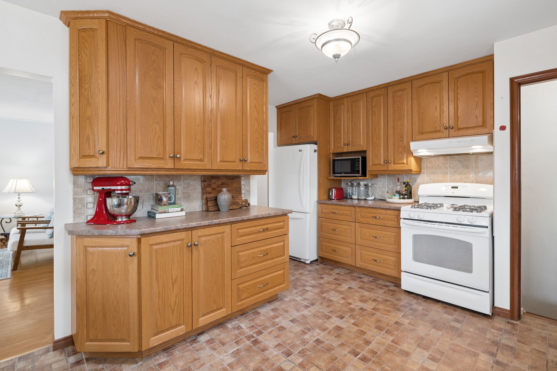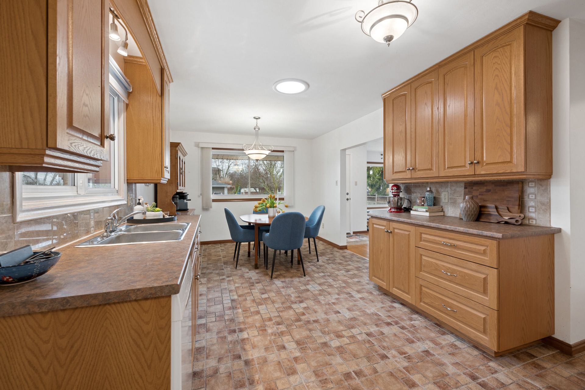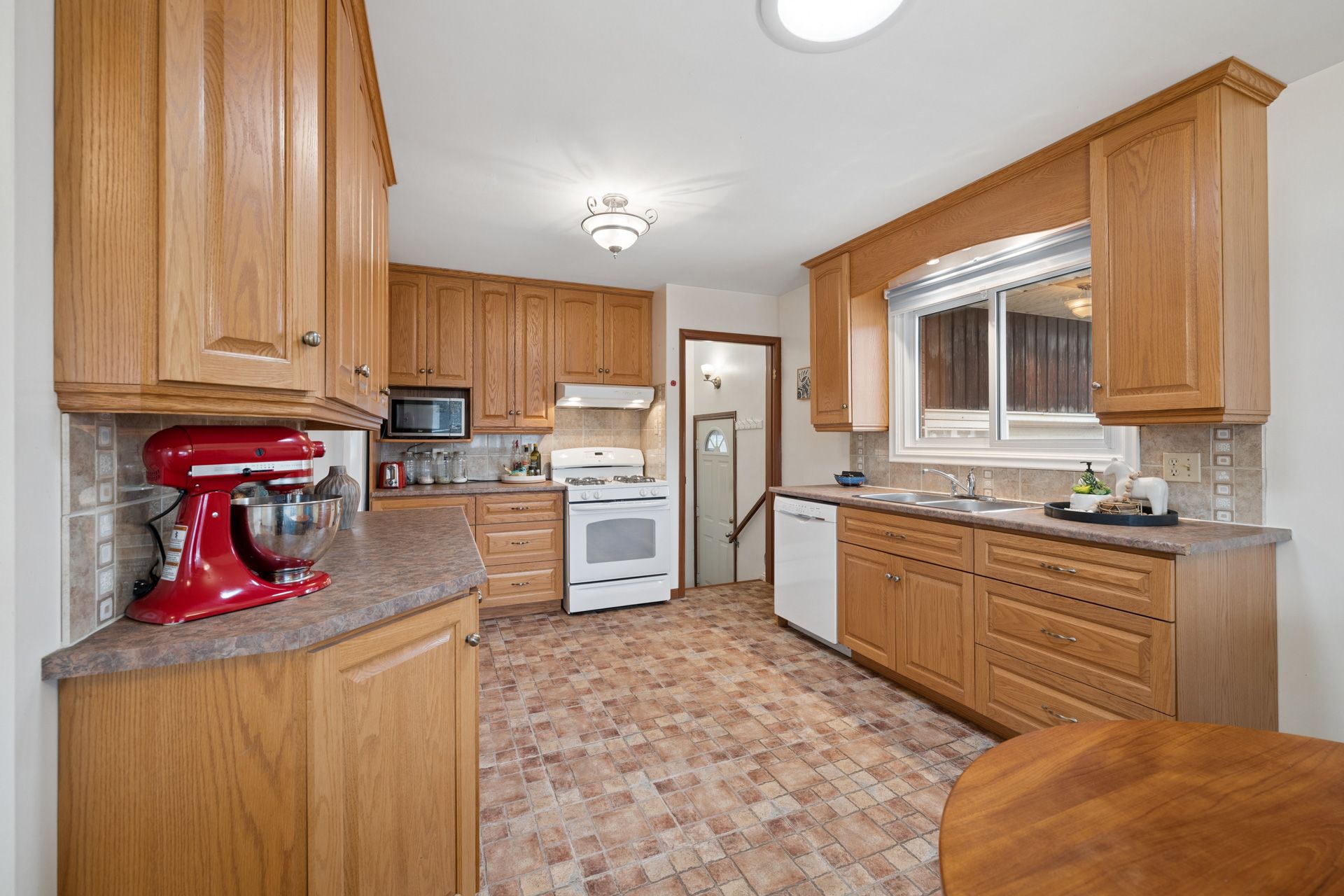 • Bright eat-in kitchen with plenty of counter space and oak cabinets.