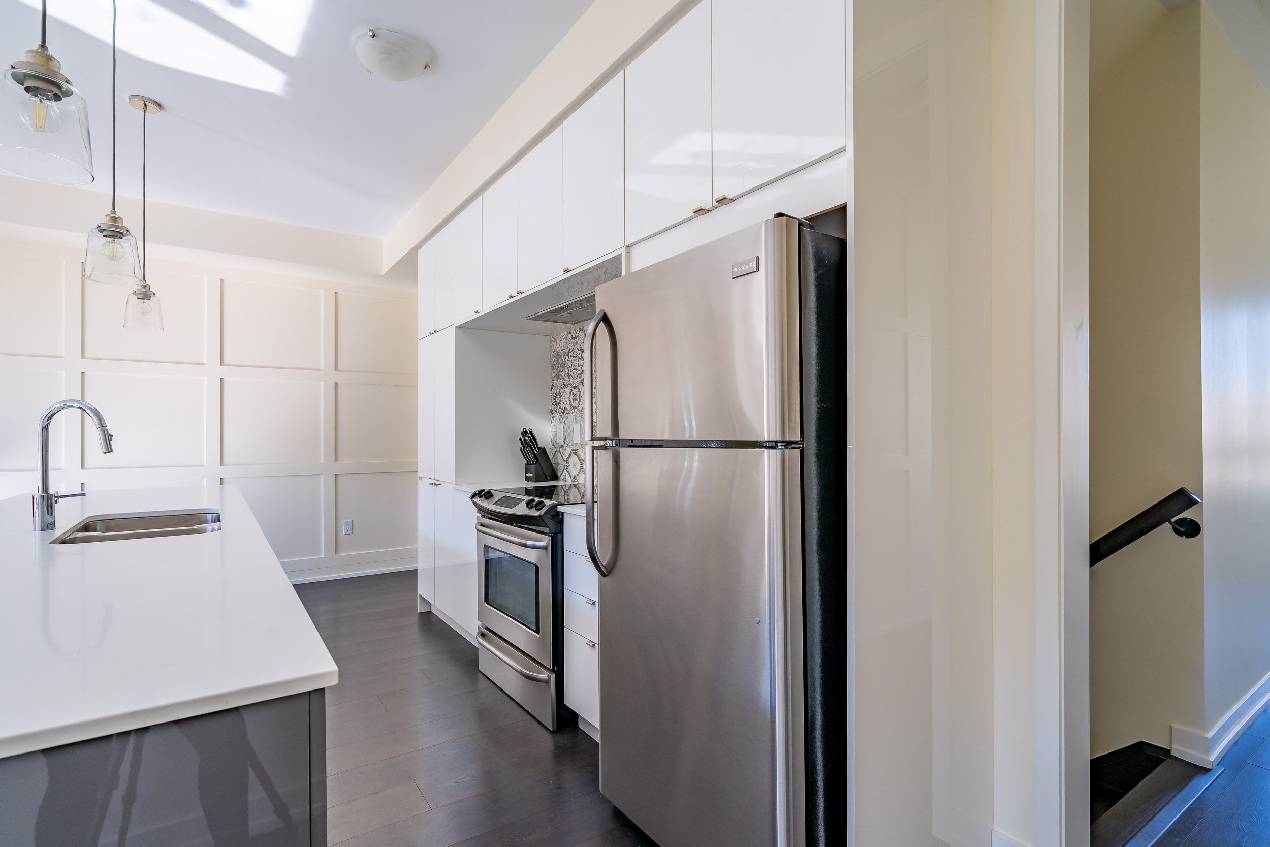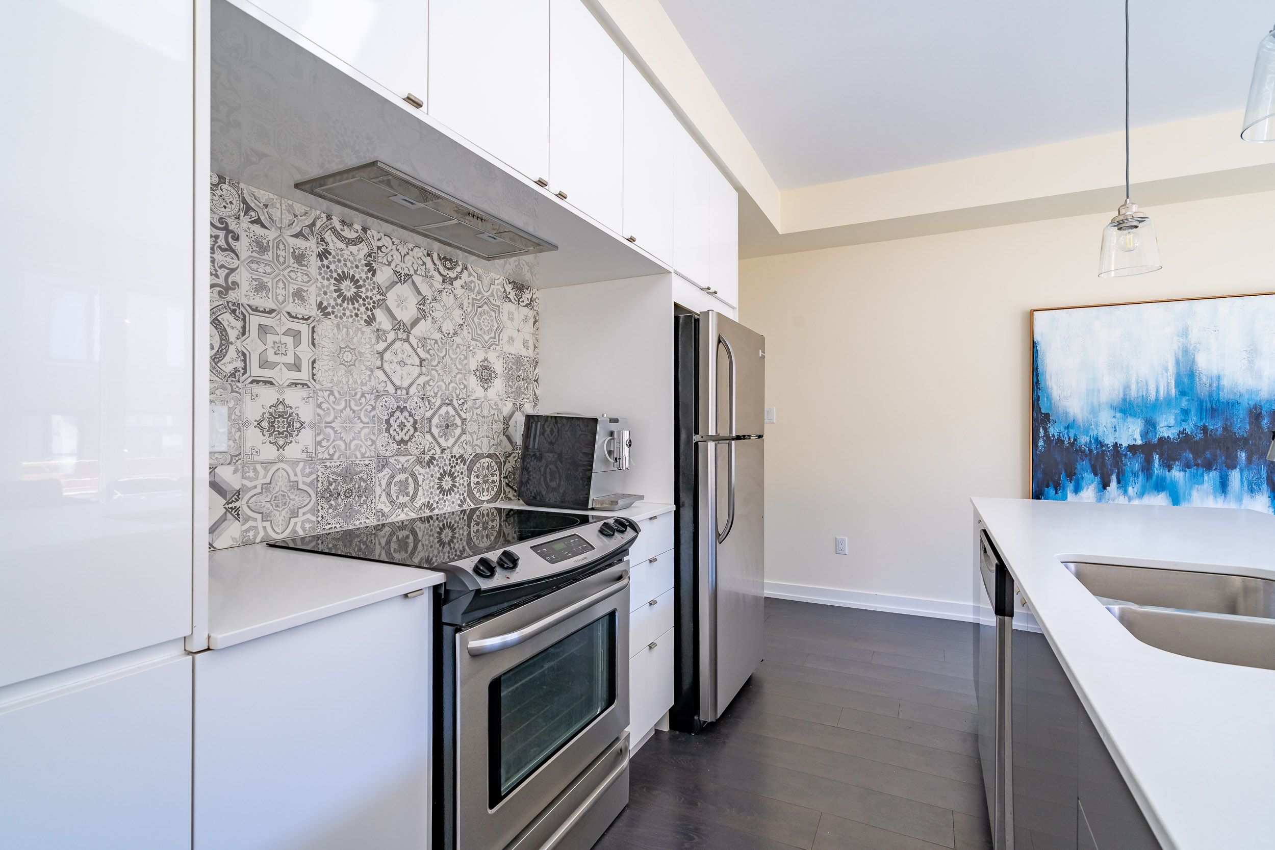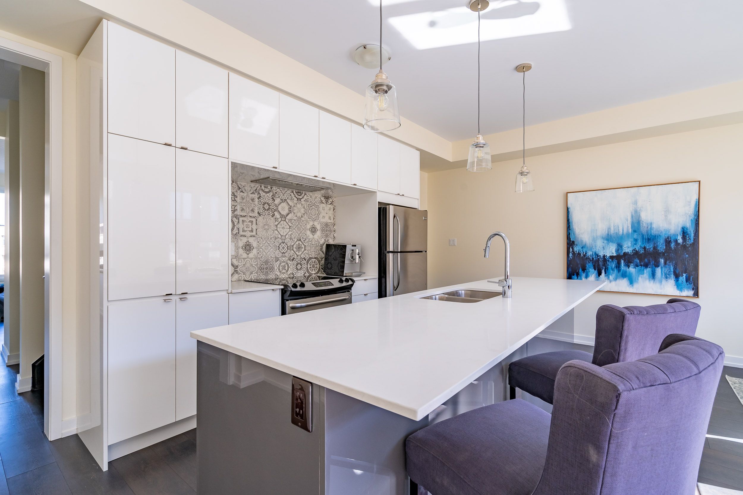 • Modern kitchen features an island and stainless steel appliances.