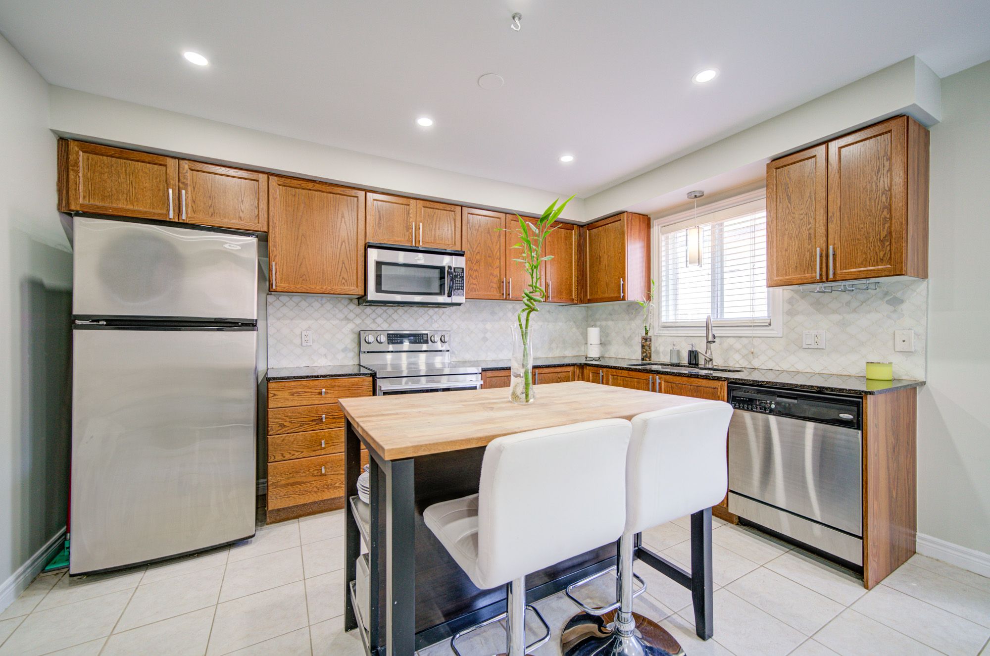 • Bright and open kitchen with stainless steel appliances and breakfast area.