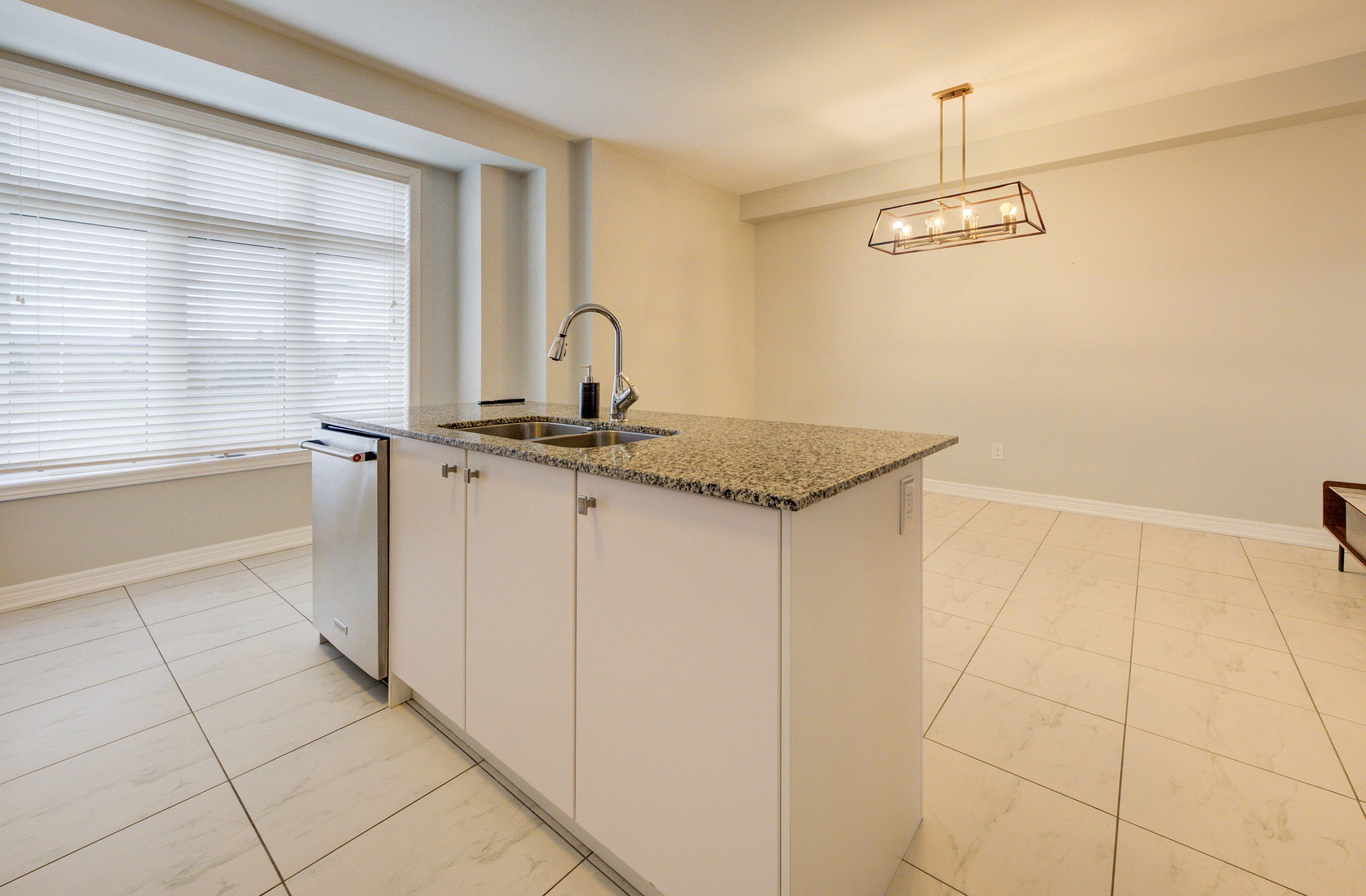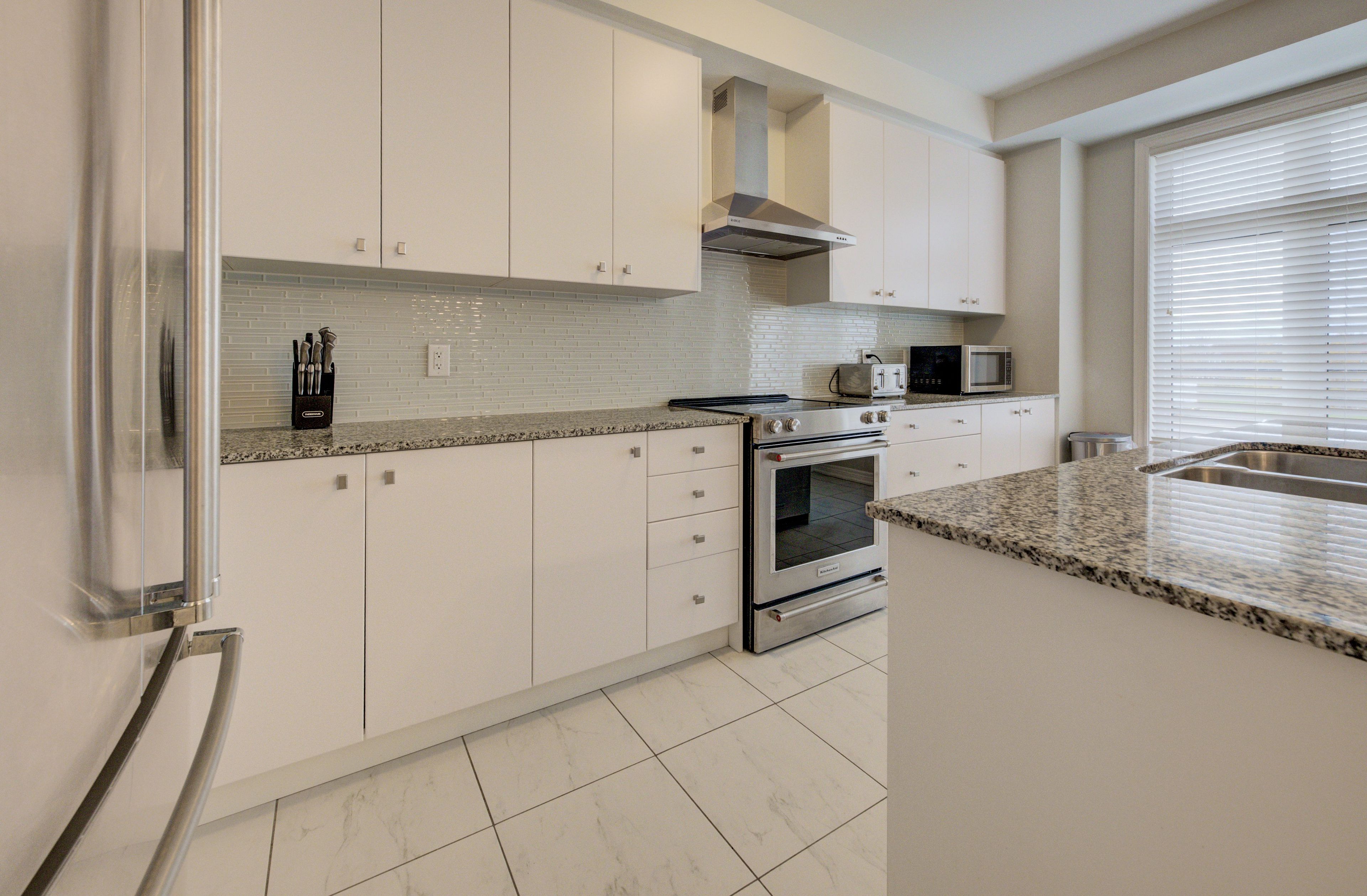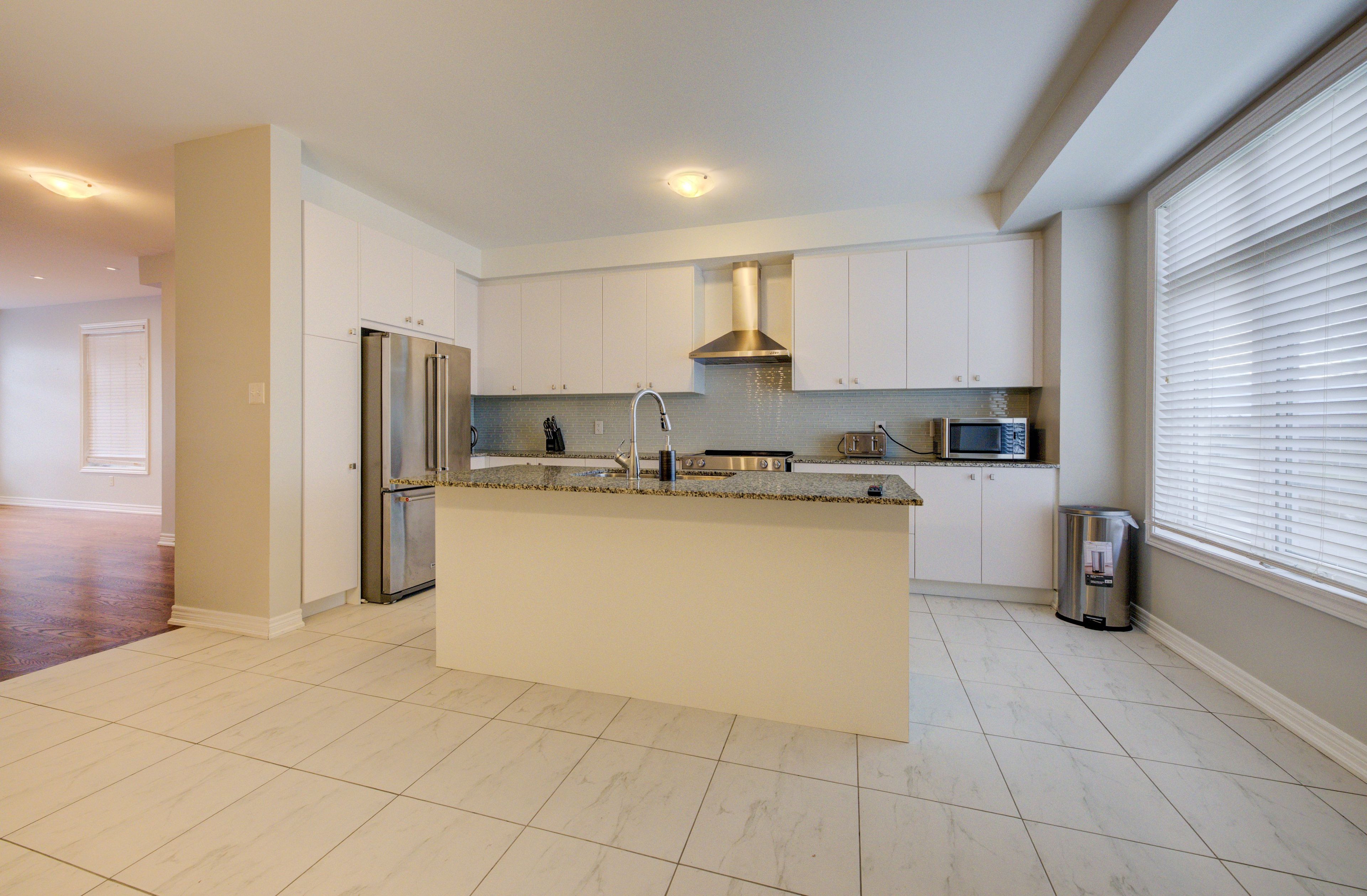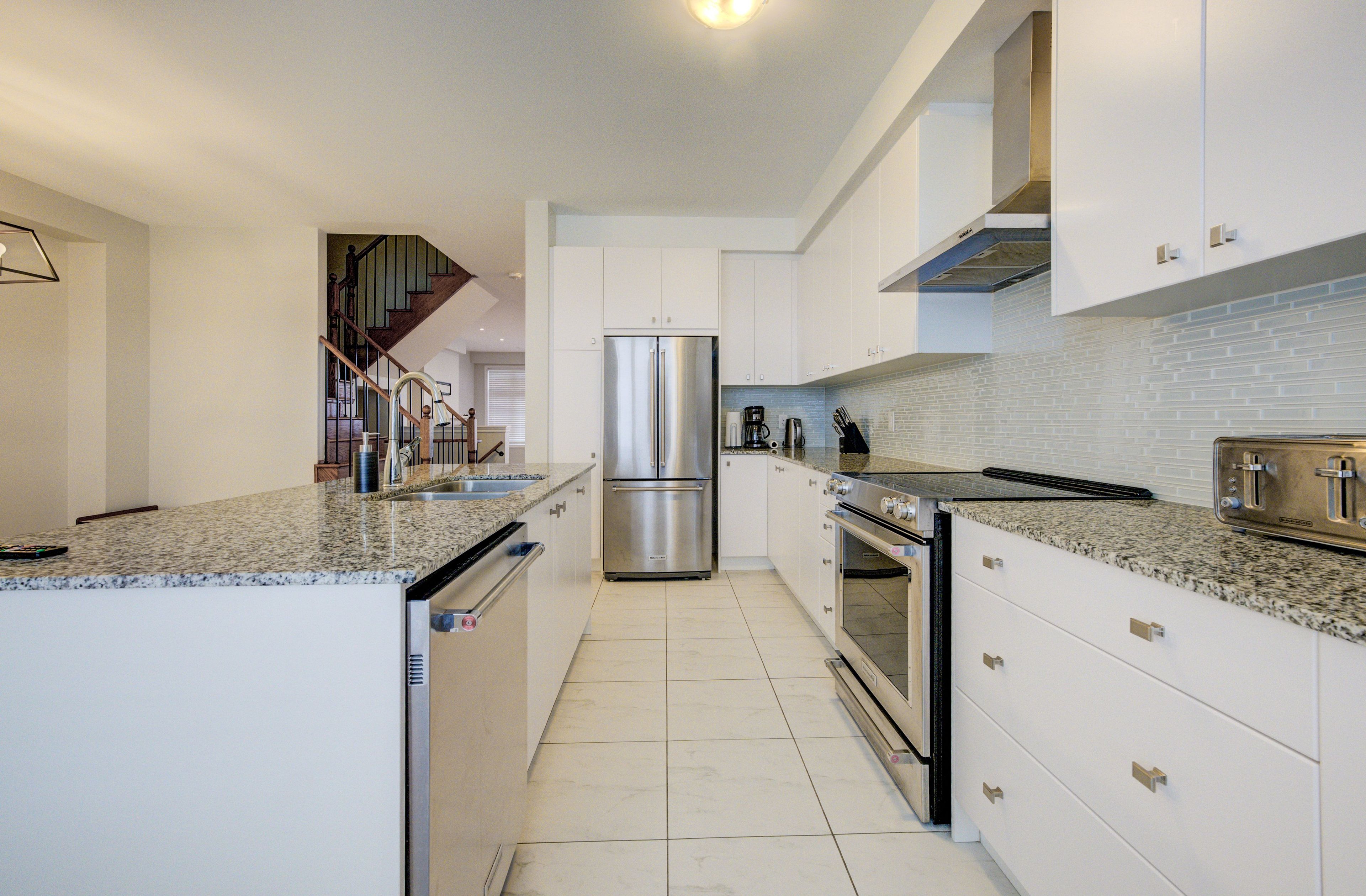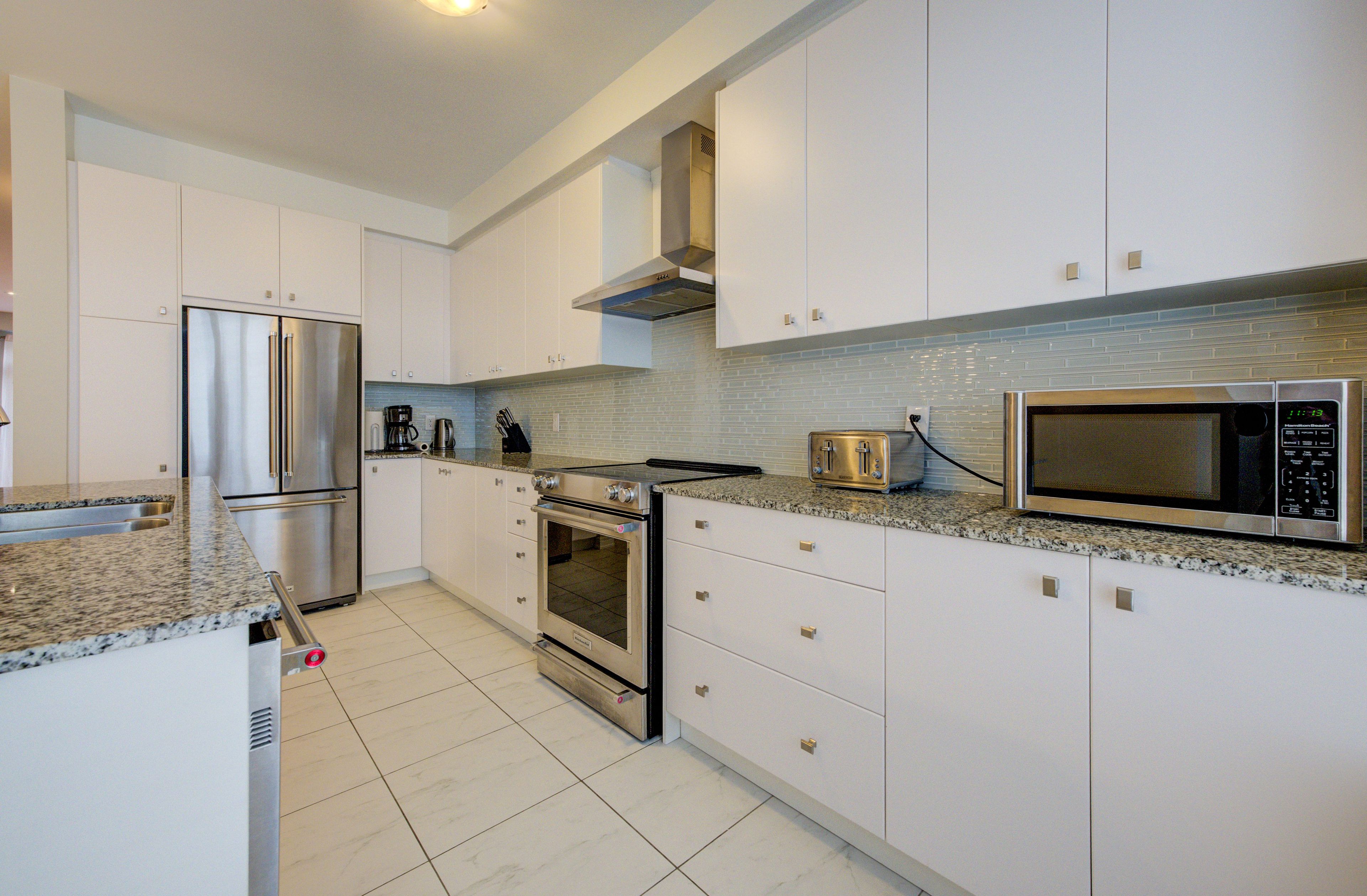 • Spacious kitchen with granite counters and modern stainless steel appliances.